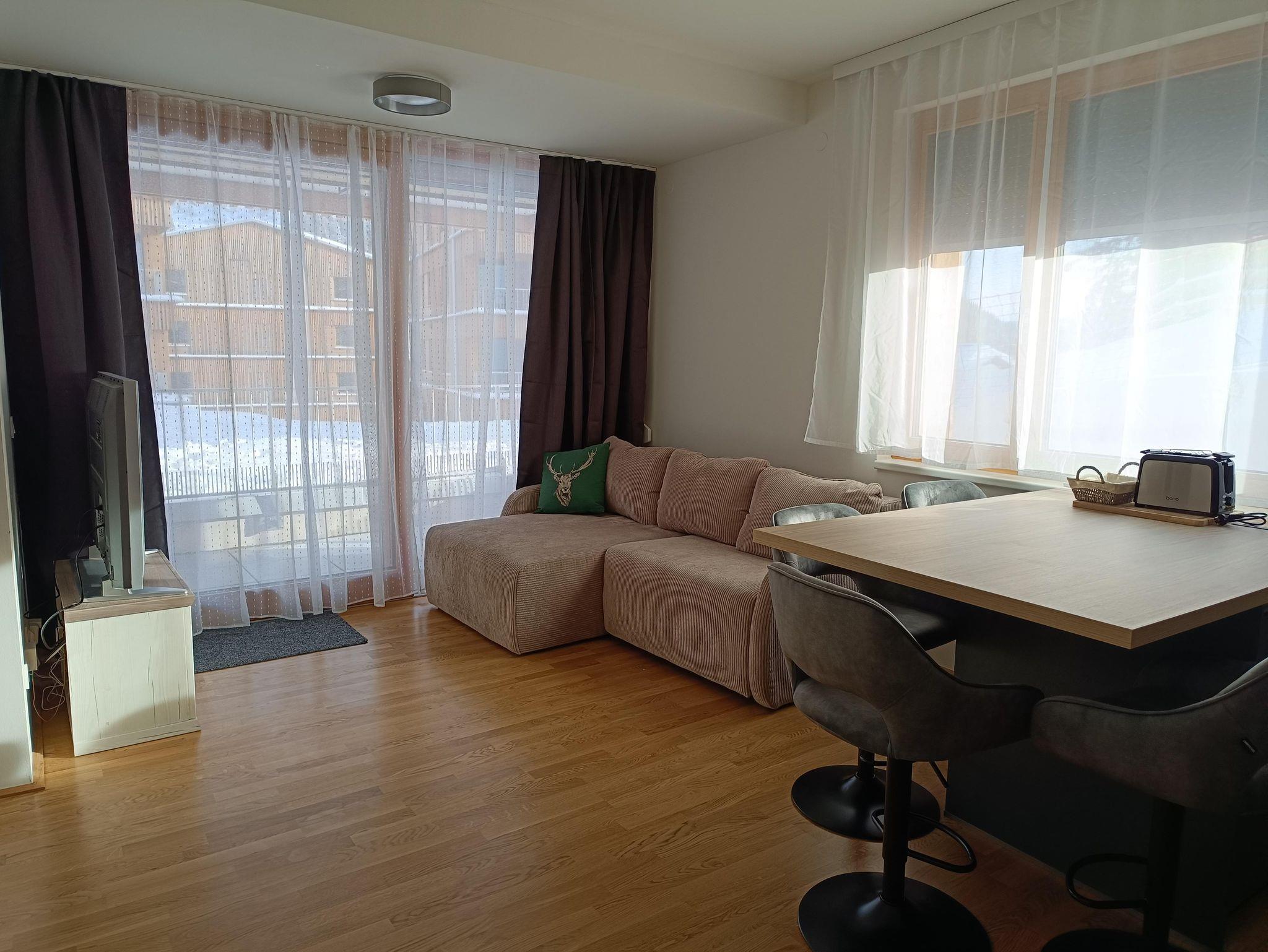 Die Ferienwohnung ist 44 m² groß und verfügt über Fußbodenheizung und Rollläden. Der Balkonzugang erfolgt über das geräumige Wohn-/Esszimmer inkl. SMART-TV und über das Schlafzimmer. Die Wohnung bietet 1 Doppelzimmer, 1 Badezimmer mit Dusche, WC sowie eine Schlafcouch für 2 Personen im Wohnzimmer. Die Piste ist direkt vor der Haustüre.