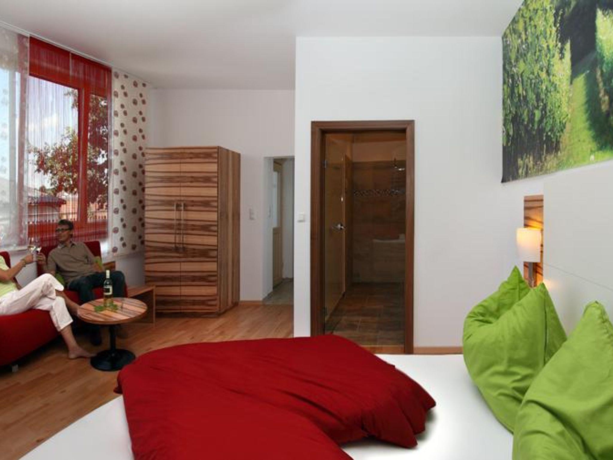 Unsere beiden Genießerzimmer, die Zweigeltsuite und die Veltlinersuite wurden im April 2011 geöffnet. Sie sind exklusiv und großzügig mit extra langem Bett (210cm), Minibar, Nespressomaschine, großem Flachbildfernseher und Internetanschluss ausgestattet. Im lichtdurchfluteten Schlafzimmer mit großen Fenstern und elektrischen Rollos finden Sie ein bequemes Funktionssofa, welches man in alle Richtungen drehen kann, und sie entweder entspannt plaudern oder gemütlich am Sofa fernsehen können. Die stimmige Stehlampe zaubert sanftes Licht in den Spektralfarben. Im sehr geräumigen Bad mit Massagedusche können Sie herrlich ausspannen. Des Weiteren steht Ihnen ein geräumiger Vorraum mit Garderobe sowie großem Spiegel zur Verfügung.