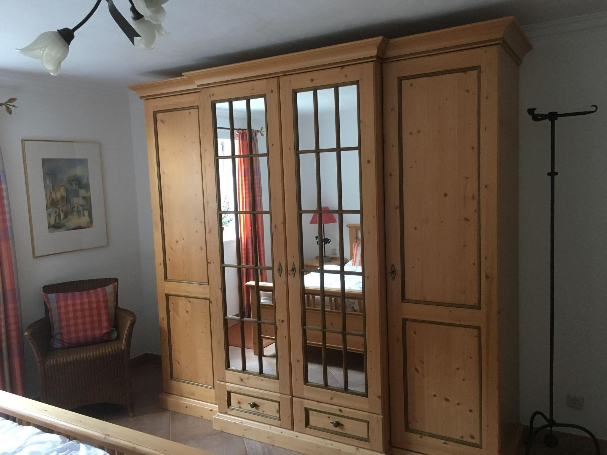 The holiday flat has two bedrooms, each with a double bed (1.80 m wide), bedside tables, chest of drawers and wardrobe. A large living/dining room with corner bench, table, chairs as well as a country-style kitchen with electric nostalgia cooker and ceramic hob, upholstered corner, coffee table, wing chair with stool, antique farmhouse cupboard and an antique chest are available to guests. The holiday flat also has a fully equipped bathroom with washbasin, shower, toilet and a separate toilet with washbasin.