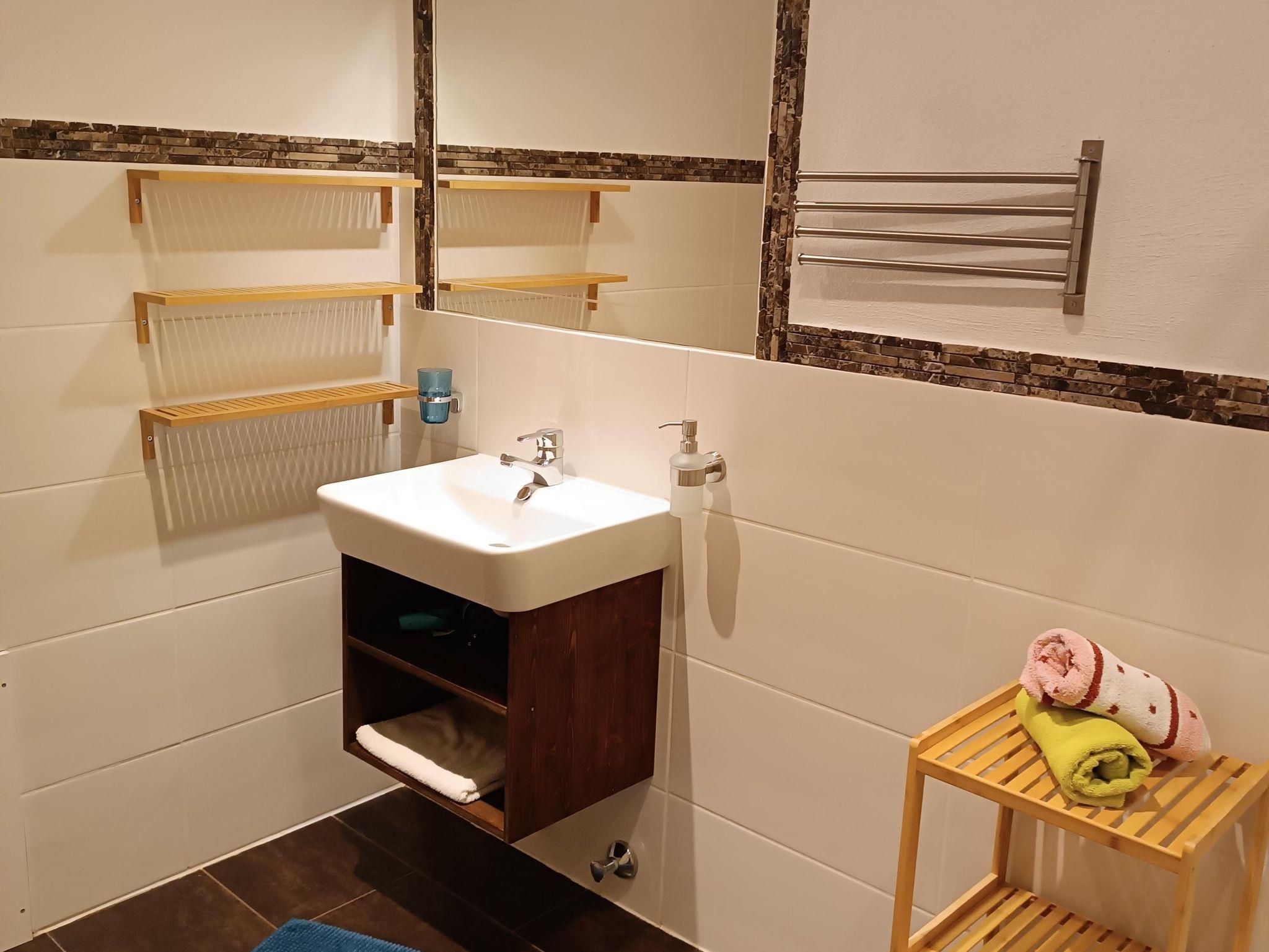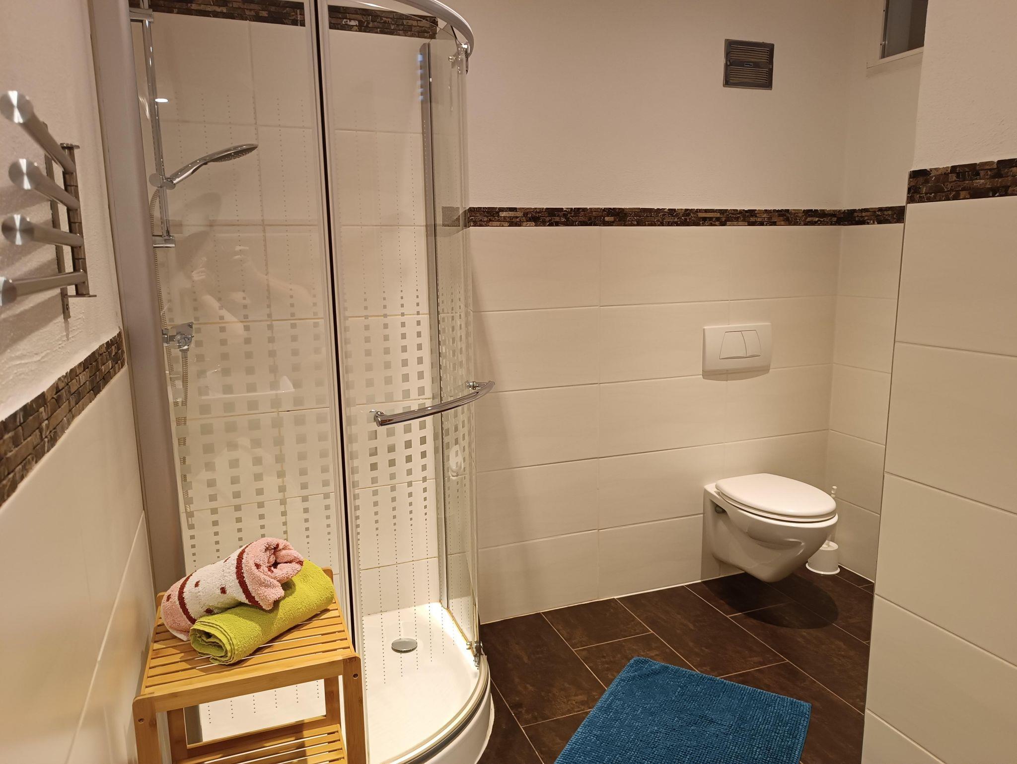 Neue Ferienwohnung im 1. Stock; bestehend aus: Vorraum, Bad mit Dusche und WC, Elternschlafzimmer, Wohnküche mit Ausziehsofa und Balkon Der Garten (mit Kinderspielplatz) und die Terrasse ist für alle Hausgäste zugänglich.