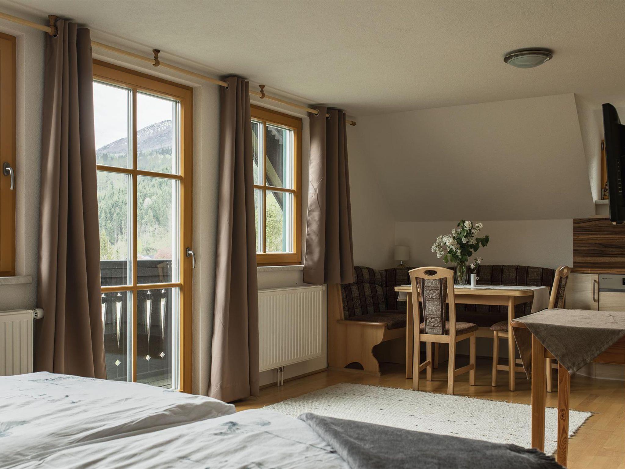 Sie wohnen auf ca. 80 m2 in 2 großen Wohnschlafräumen mit komplett eingerichteter Küchenecke (inkl. Geschirrspüler) und großem Vorraum. Erfreuen Sie sich am Sonenaufgang von Ihrem ostseitigen Balkon und genießen Sie nach einer erholsamen Wanderung oder Skitag den faszinierenden Sonnenuntergang von Ihrem westseitigen Balkon mit dem einzigartigen Blick in die Stodertaler Bergwelt!