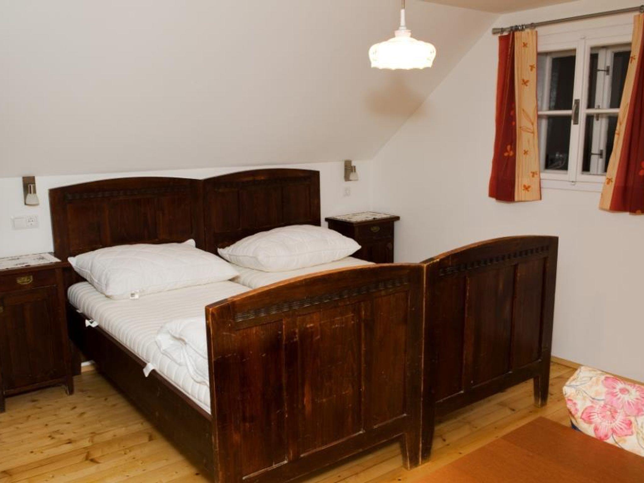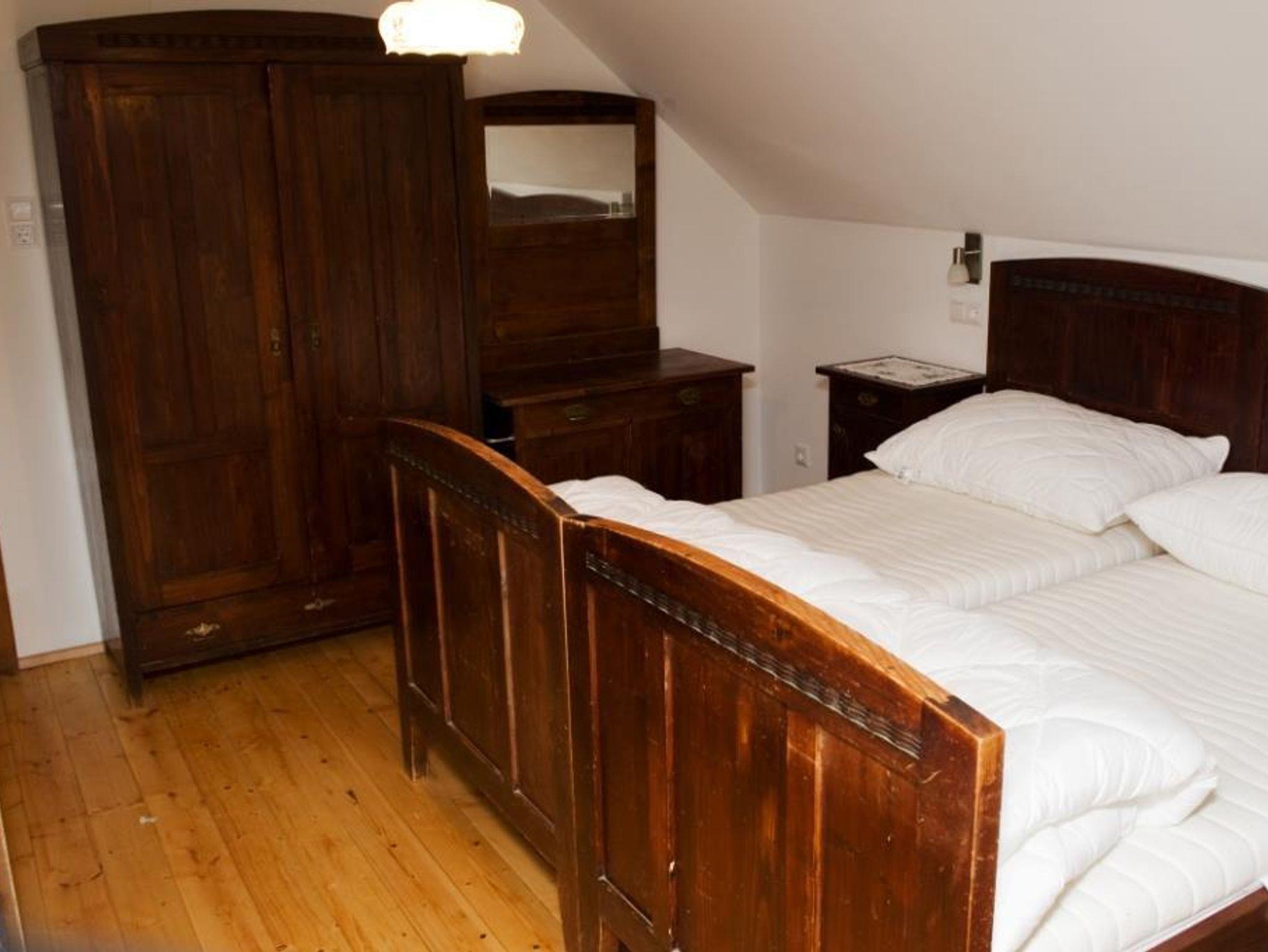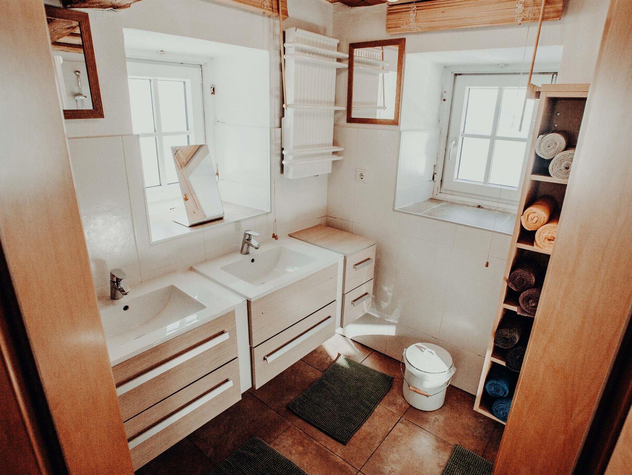 Bad mit Doppelwaschbecken und Dusche. 2 WC's Waschmaschine. Weiters gibt es eine Elektroheizung die das Haus auch in Abwesenheit auf min. 18° C hält. Im ersten Stock sind drei Schlafzimmer. Eines mit zwei Doppelbetten, eines mit einem Doppelbett und eines mit einem Doppelbett und einer ausziehbaren Couch wo gemütlich zwei Personen schlafen können.