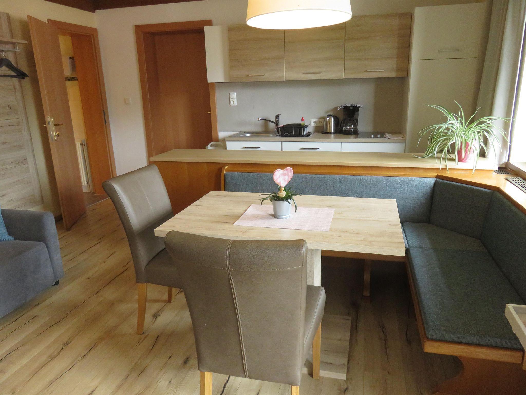 Ferienwohnung mit ca. 46 qm, 2 Pers; Schlafzimmer mit Doppelbett und Stockbett; Wohnzimmer mit Sitzecke, Lehnstuhl und Küchenzeile; Du/WC; Balkon nach Süden; Sat-TV.