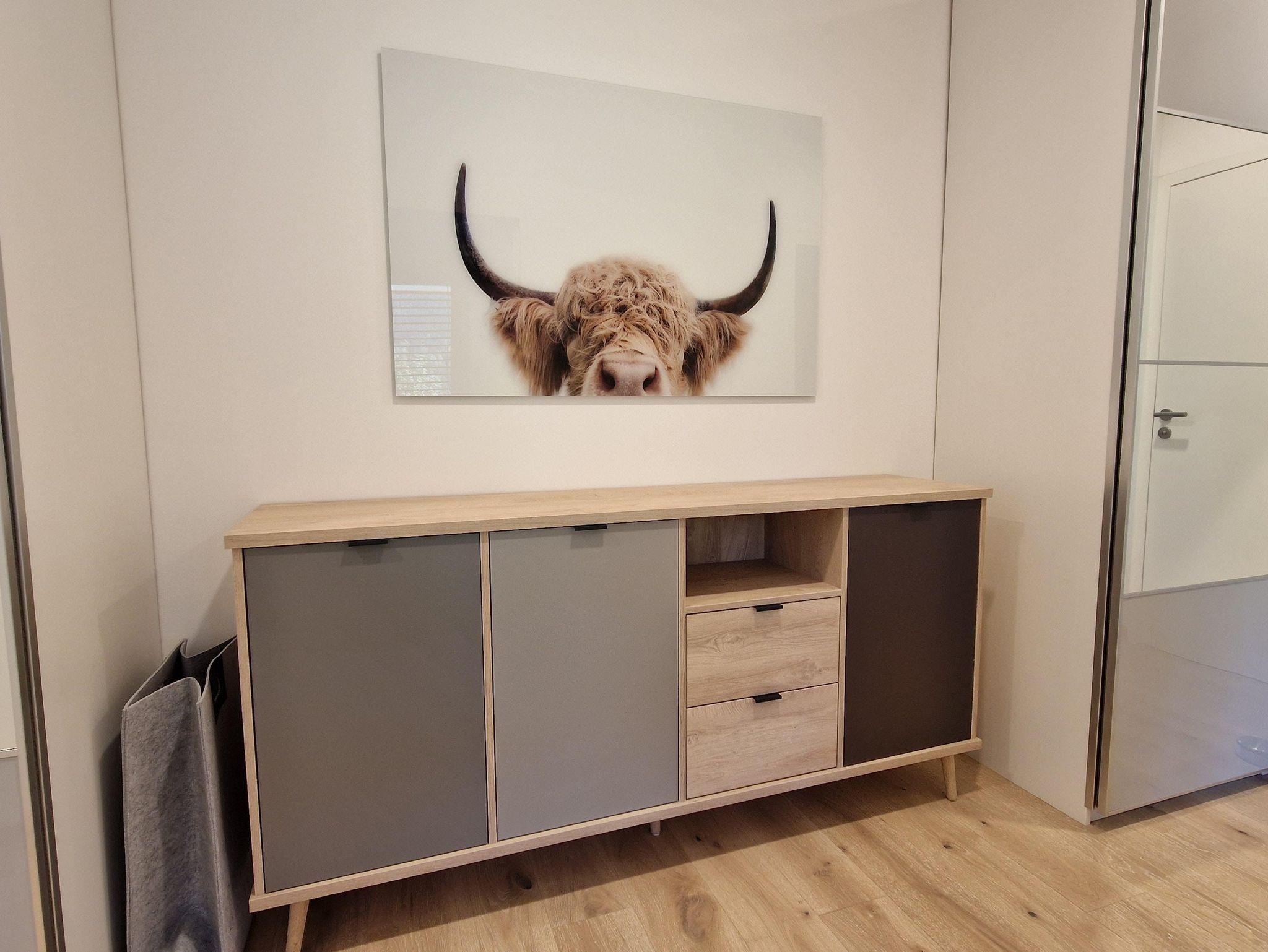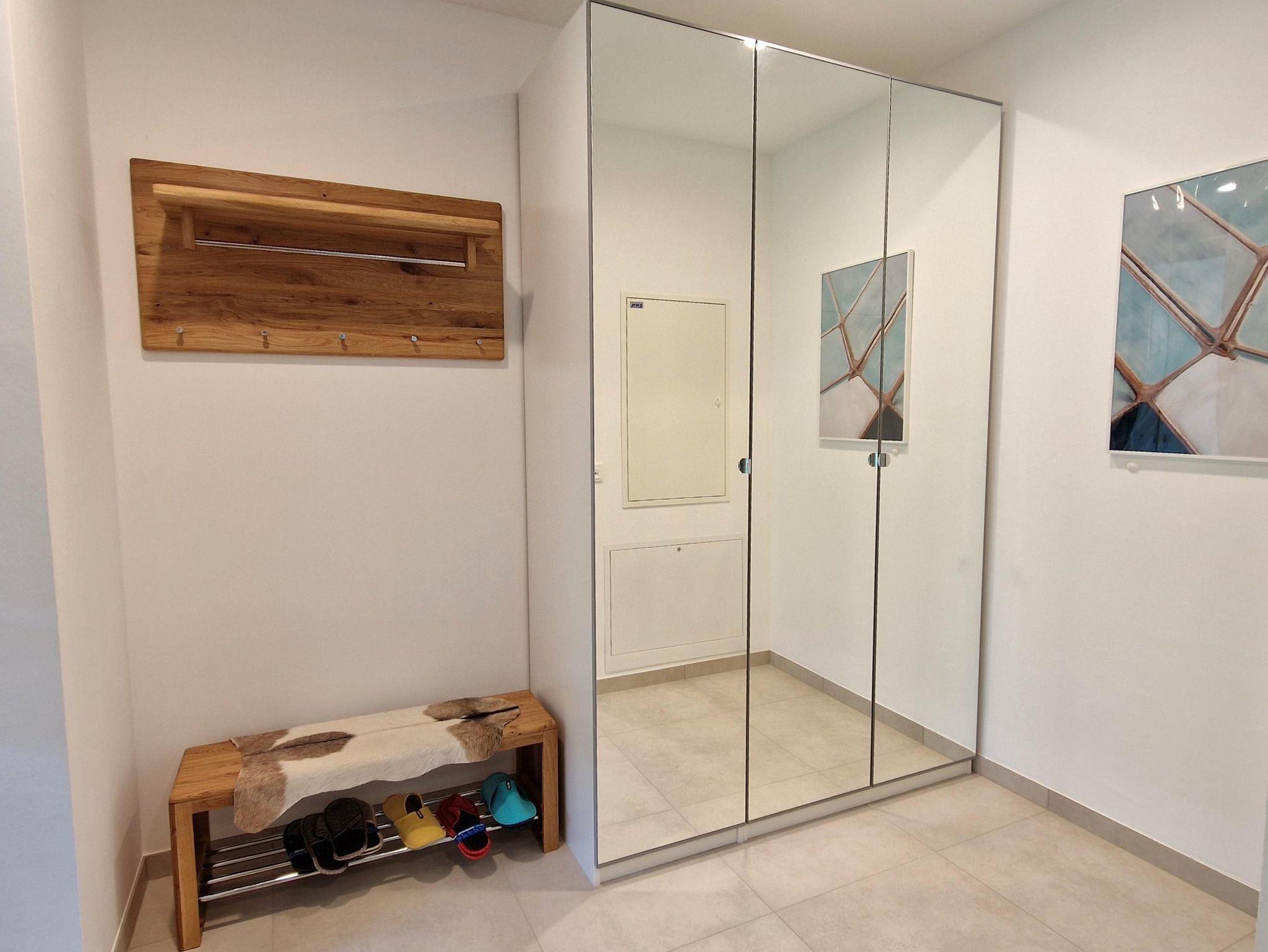 Ein TV Samsung The Frame steht zur Verfügung. Die Wohnung ist ausgestattet mit Fliesen, Parkett, Fussbodenheizung, separatem Abstellraum mit Waschmaschine und Trockner - auch zum Abstellen für Ski, Räder, Koffer, nutzbar. Eigener (überdachter) Abstellplatz für PKW