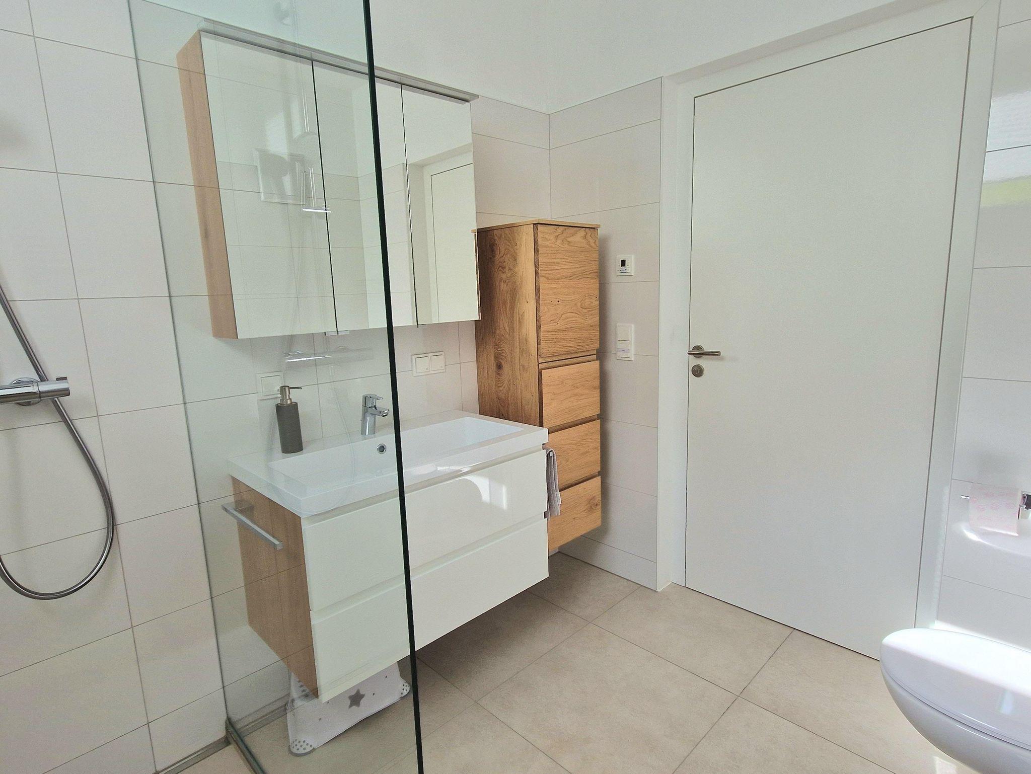 Die Ferienwohung ist rund 75m² gross und besteht aus einem Vorraum, Gäste-WC, Wohnzimmer, Küche, 2 Schlafzimmern, Bad mit Dusche, Terrasse und Garten. Die Küche ist eine Einbauküche der Marke DAN, voll ausgestattet mit Spüle, Geschirrspüler, Herd, Backrohr. Cafe-Maschine, Wasserkocher, Toaster, Eierkocher, Fondue-Geschirr etc. Geschirr, Bettwäsche, Handtücher stehen zur Verfügung.