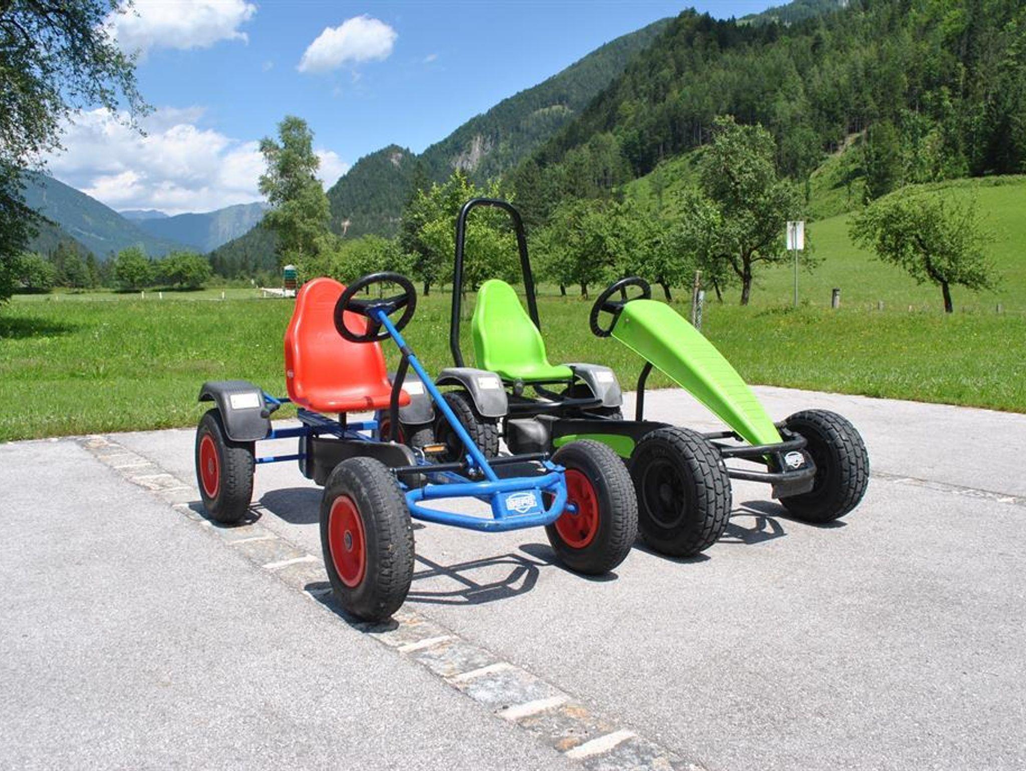Bei den Kindern ist unser Fuhrpark, wie Go-karts, Trettraktor mit Leiterwagen, Roller, sowie das Spielhaus im Wald sehr beliebt.