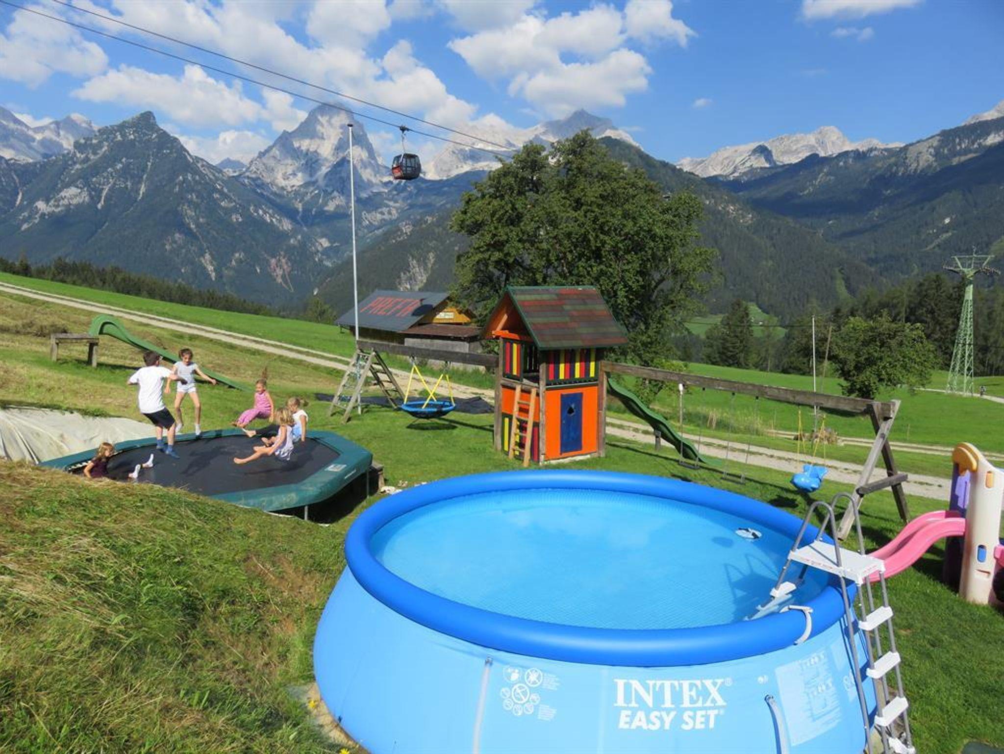 Im Winter direkt an der Skipiste zum Skigebiet. Im Sommer mitten in der wunderschönen Natur - absolut ruhig gelegen, mit traumhaftem Panoramablick auf die imposante Bergwelt. Optimal für Familienurlaub, Wanderurlaub oder Skiurlaub; kindersichere Lage, Spielplatz mit Riesentrampolin, viele Spielgeräte und Tretfahrzeuge - vom Tretgokart bis Monsterroller, viele Tiere am Hof; optimaler Ausgangspunkt für Wanderungen; holzbeheizte Sauna, Dampfbad.