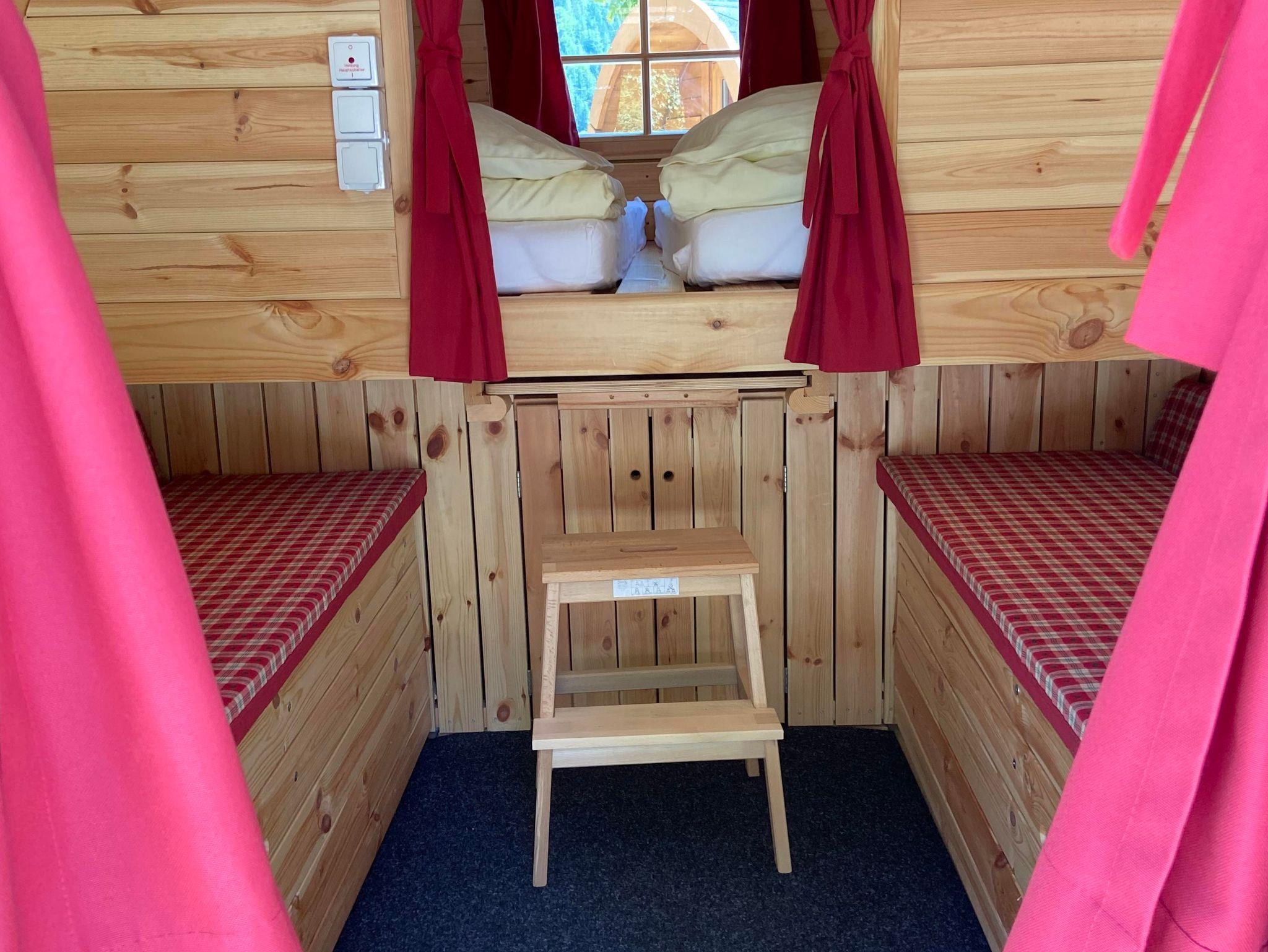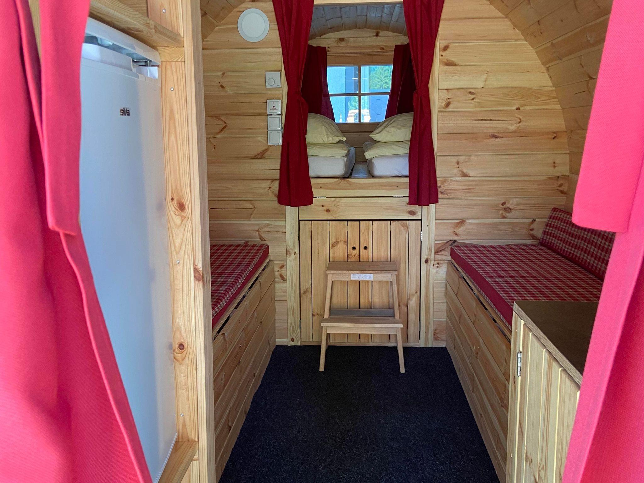 Die massiven Holzfässer aus unbehandeltem Kiefernholz sind wahre Raumwunder: Zum Schlafen befindet sich im hinteren Bereich ein riesiges Bett mit 2 x 2 m, das über 2 Stufen bequem erreichbar ist. Zusätzlich lassen sich die Sitzbänke im Wohnbereich zu weiteren Schlafgelegenheiten (für Kinder) umbauen. Bis zu vier Personen können so bequem in einem Schlaffass übernachten.
