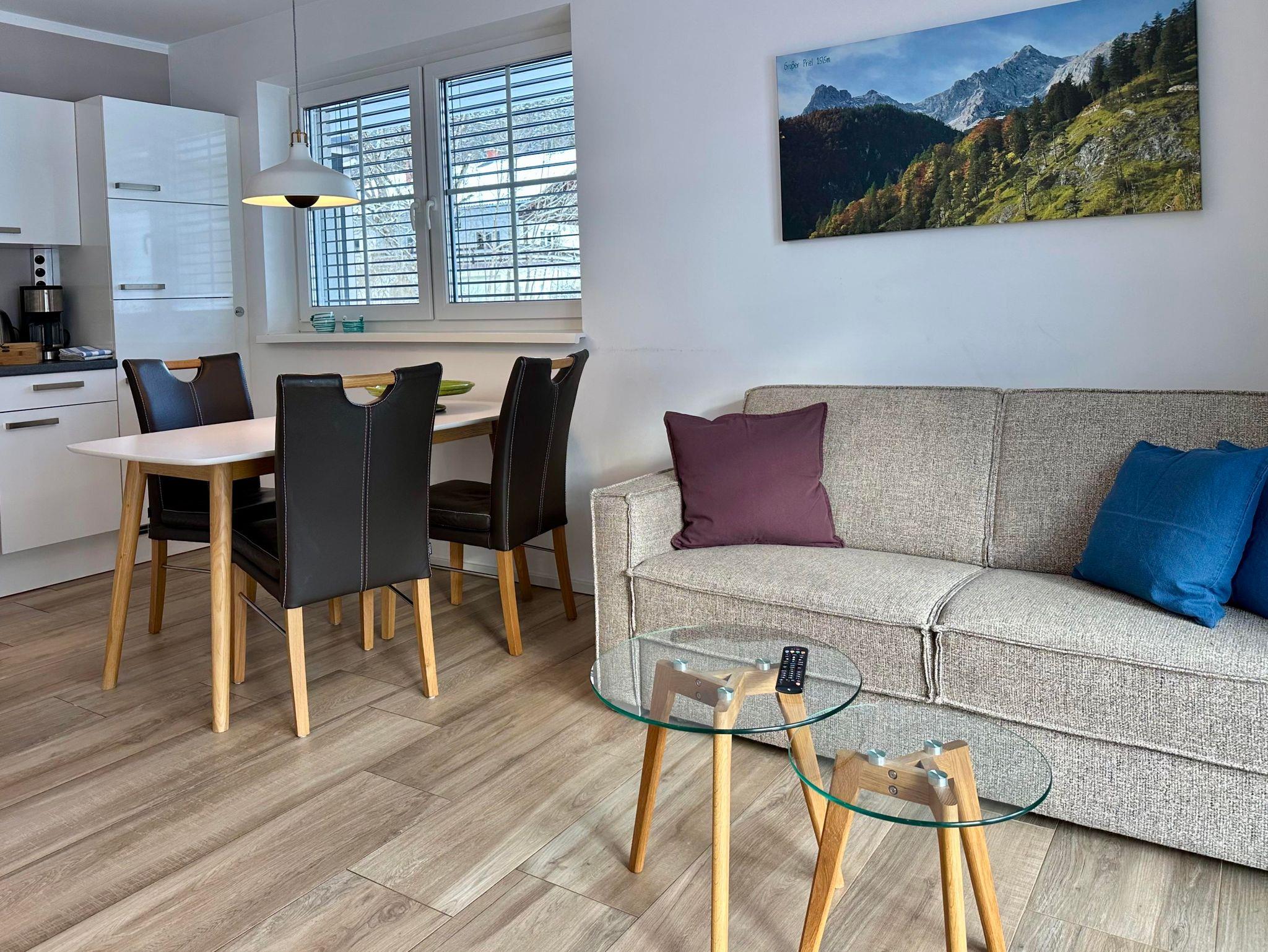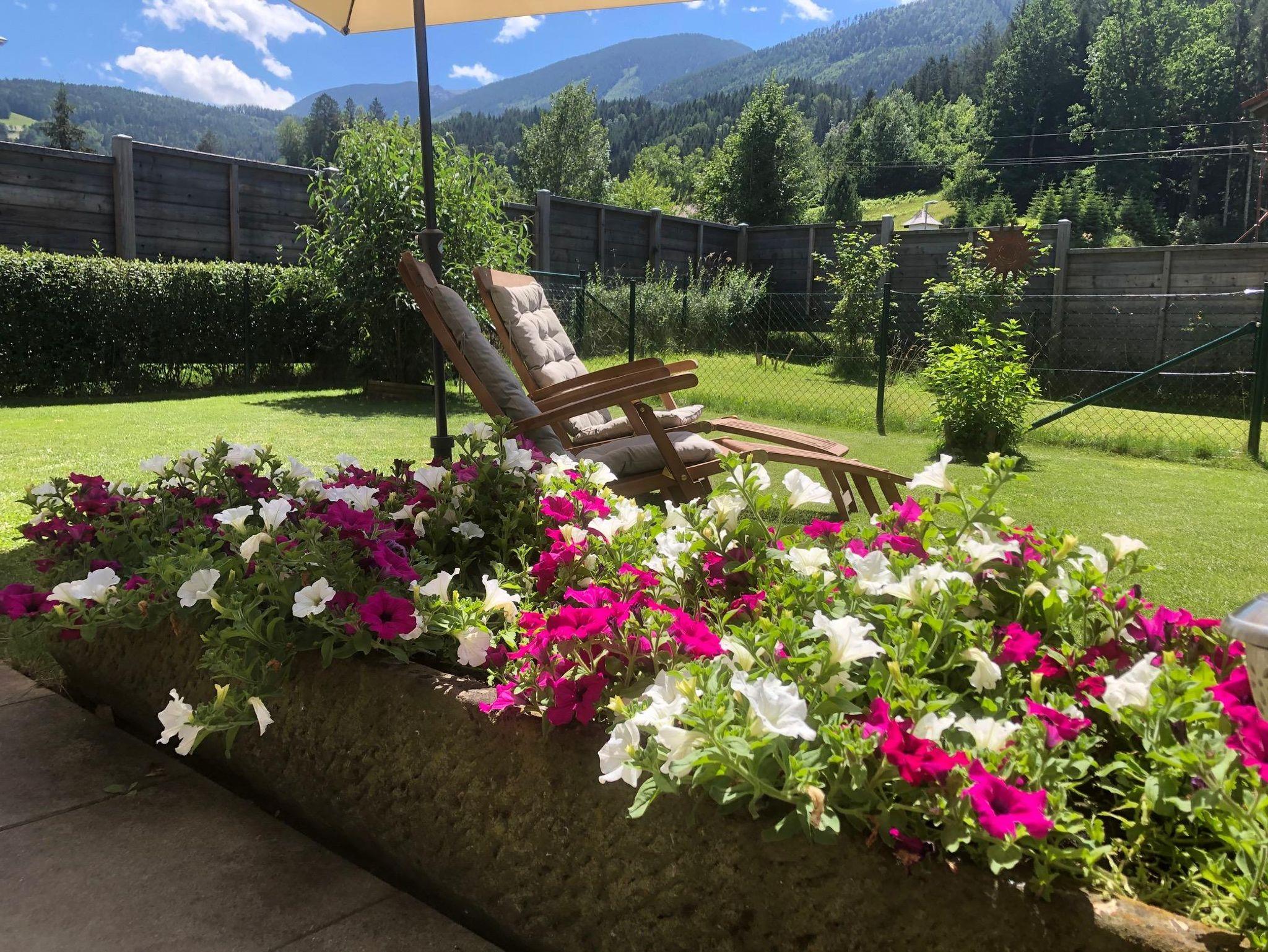Ein Highlight der Wohnung ist der sonnige, eigene Garten mit einer südseitigen Terrasse, von der aus Sie einen herrlichen Blick auf die umliegenden Berge genießen können. Hier können Sie entspannen, die frische Luft genießen oder den Tag bei einem Glas Wein ausklingen lassen.