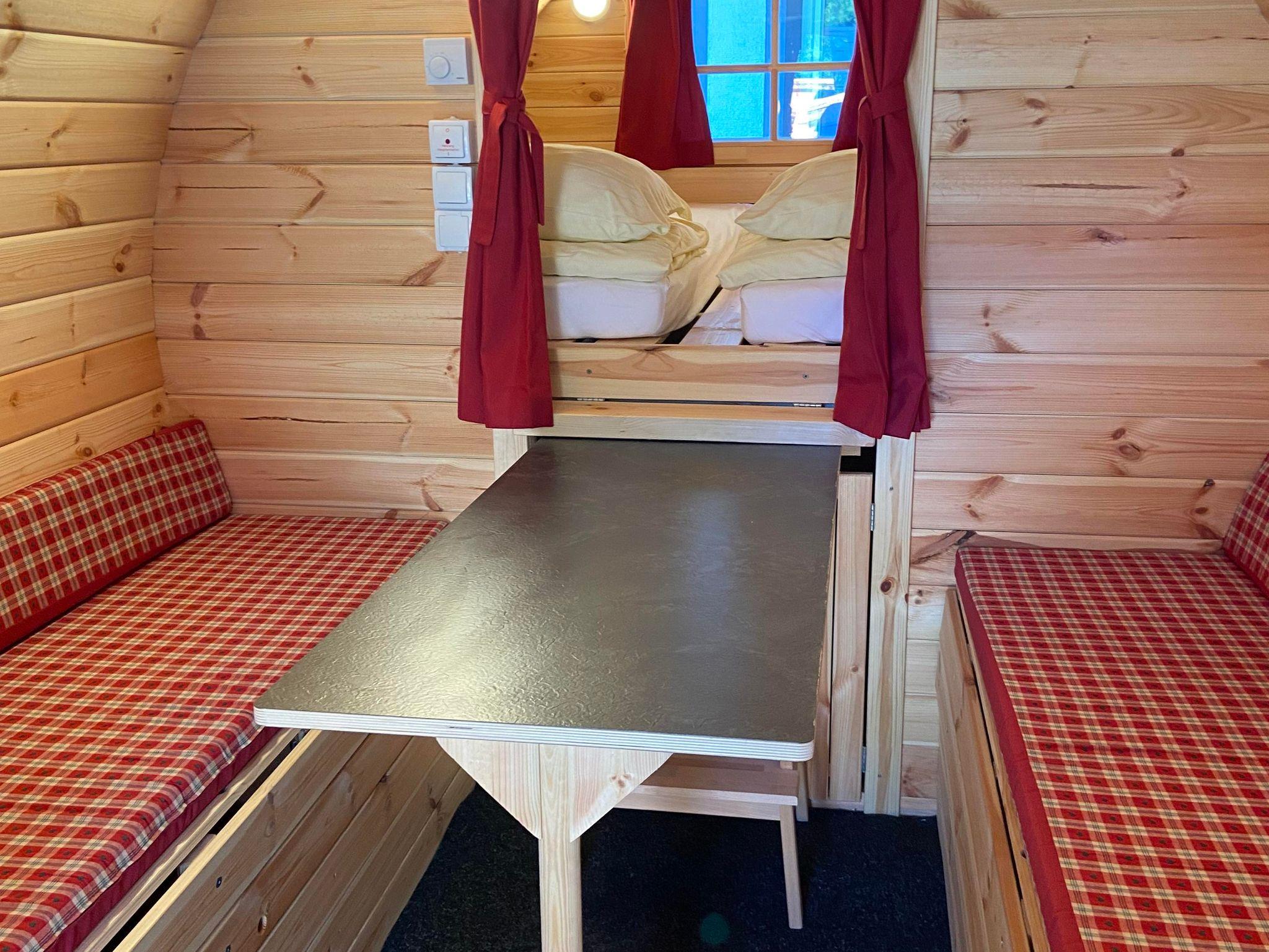 Zum Schlafen befindet sich im hinteren Bereich ein riesiges Bett mit 2 x 2 m, das über 2 Stufen bequem erreichbar ist. Zusätzlich lassen sich die Sitzbänke im Wohnbereich zu weiteren Schlafgelegenheiten (für Kinder) umbauen. Bis zu vier Personen können so bequem in einem Schlaffass übernachten.