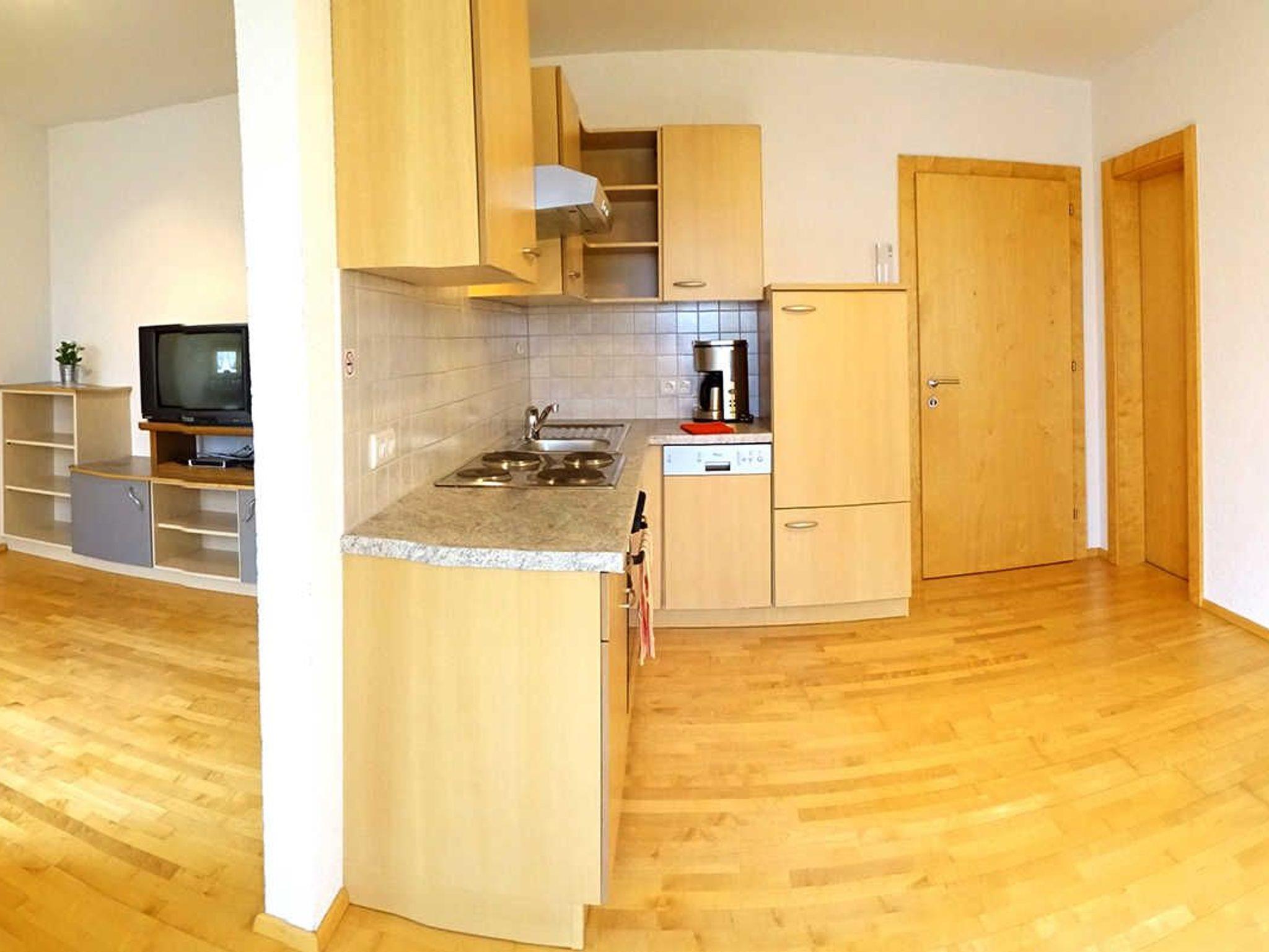 - Wohn-/Schlafraum mit Boxspringbett (160 x 200), Küchenzeile mit Kühlschrank ohne Gefrierfach, Geschirrspüler, 4-Platten-Herd, Backofen, Dunstabzugshaube, Kaffeemaschine, großzügiger Essbereich und Sat-TV