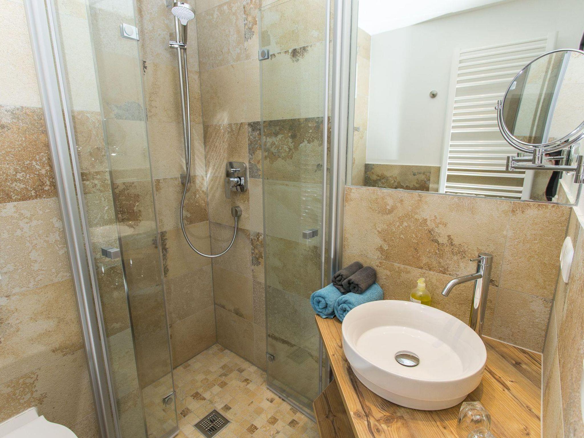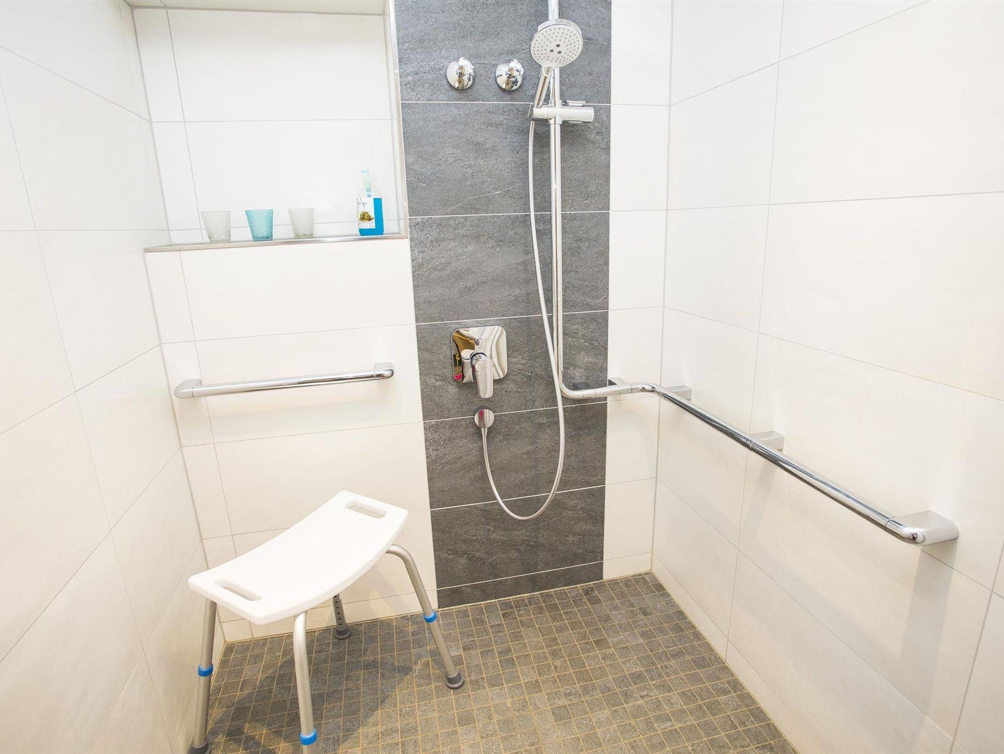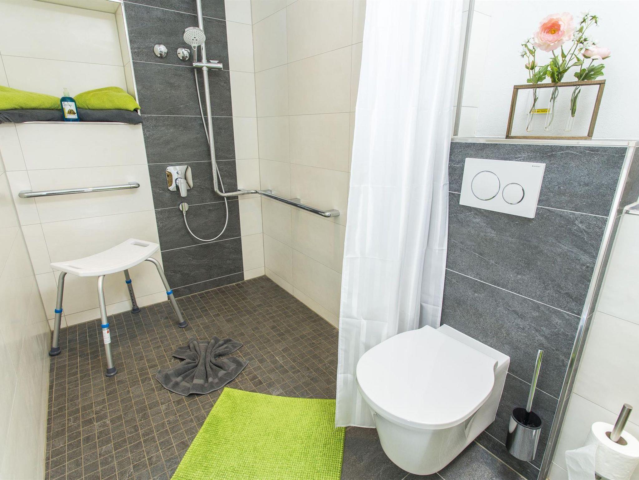 • Duschbad mit Fön, Kosmetikspiegel und WC. Barrierefei mit Rollstuhl zu befahren.