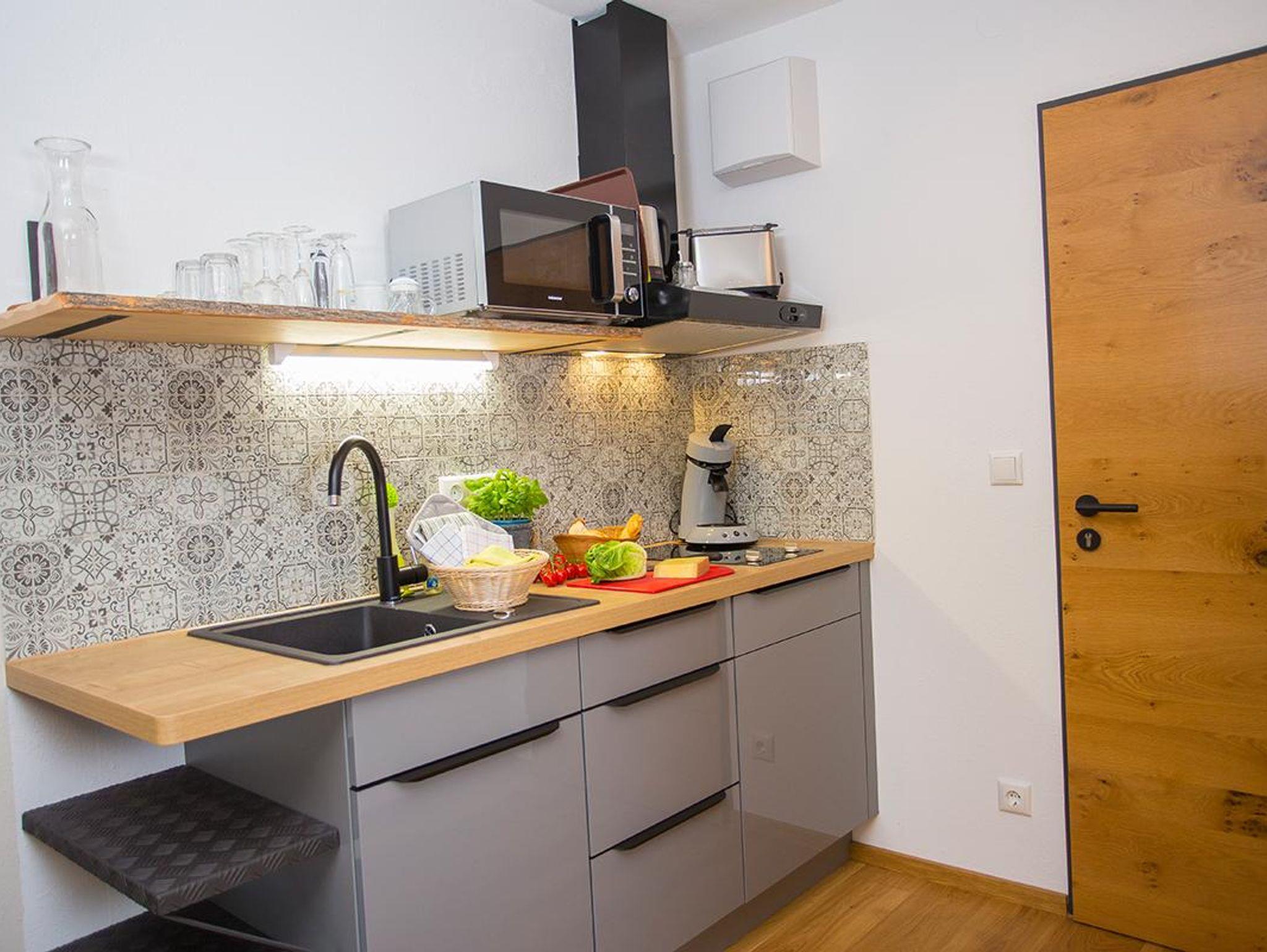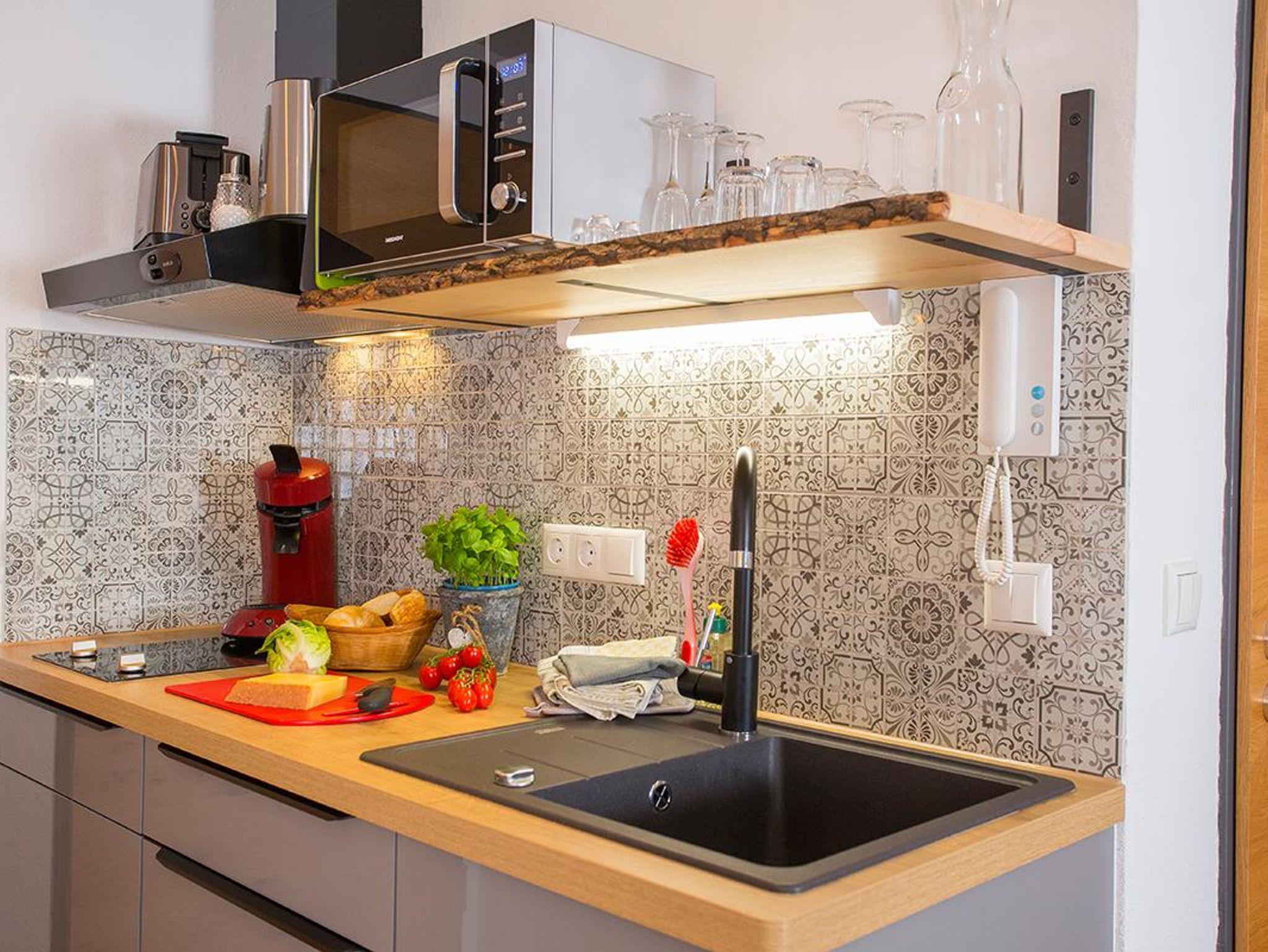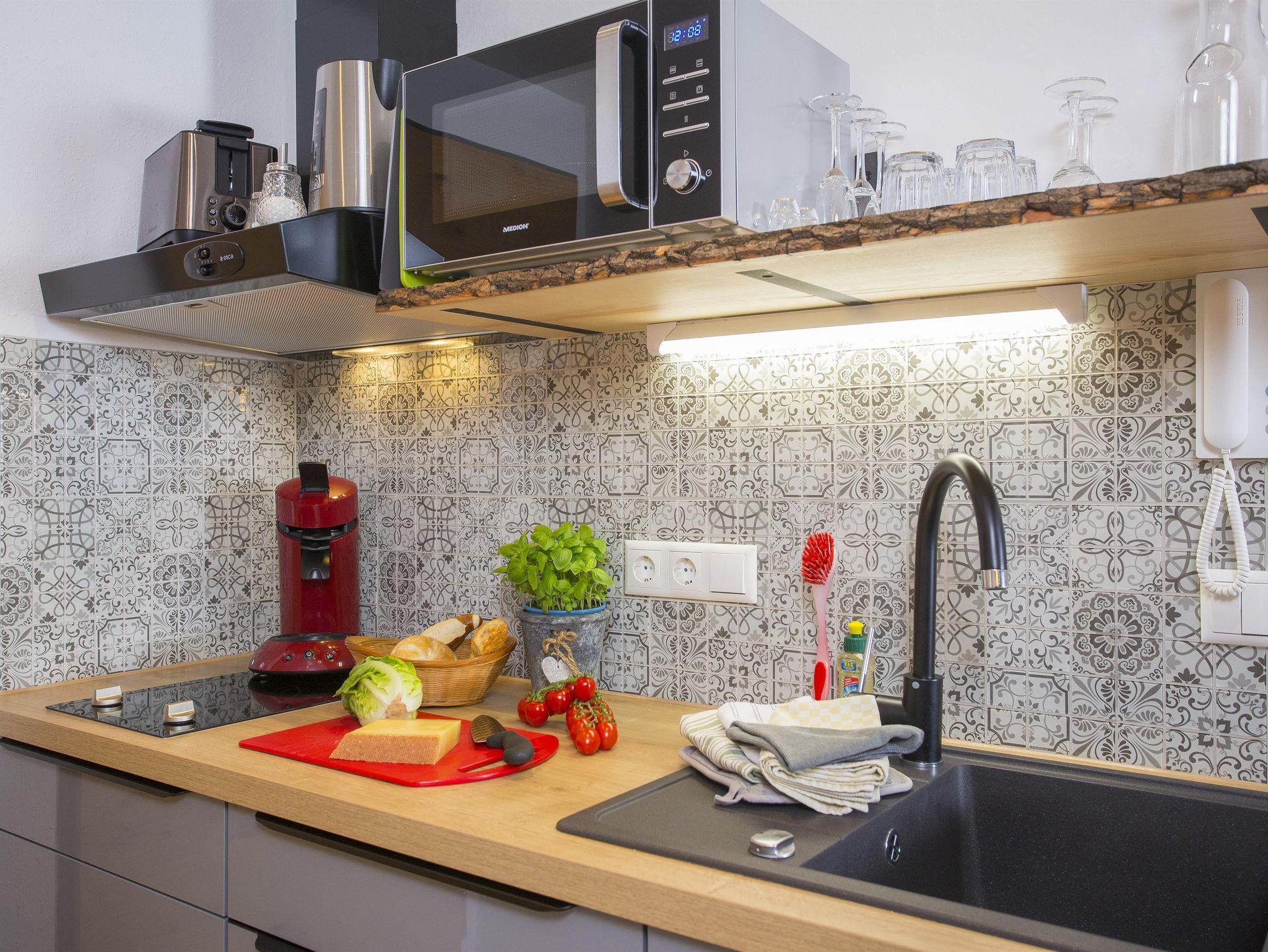 • Kleine Küchenzeile- voll ausgestattet: Ceranfeld, Kühlschrank, Kaffeemaschine, Toaster, Wasserkocher, Geschirr/ Besteck + Geschirrtücher und Mikrowelle mit Grillfunktion