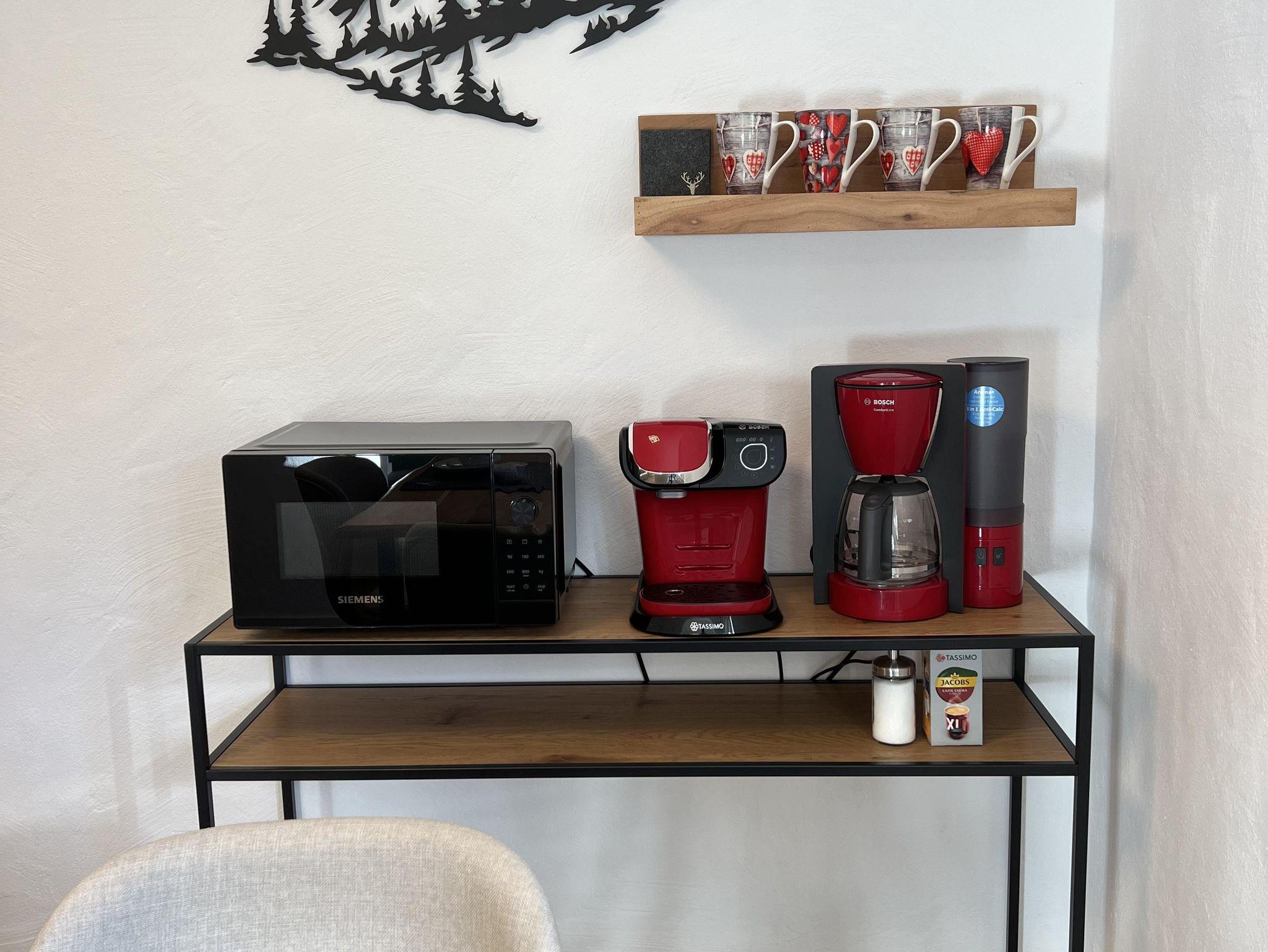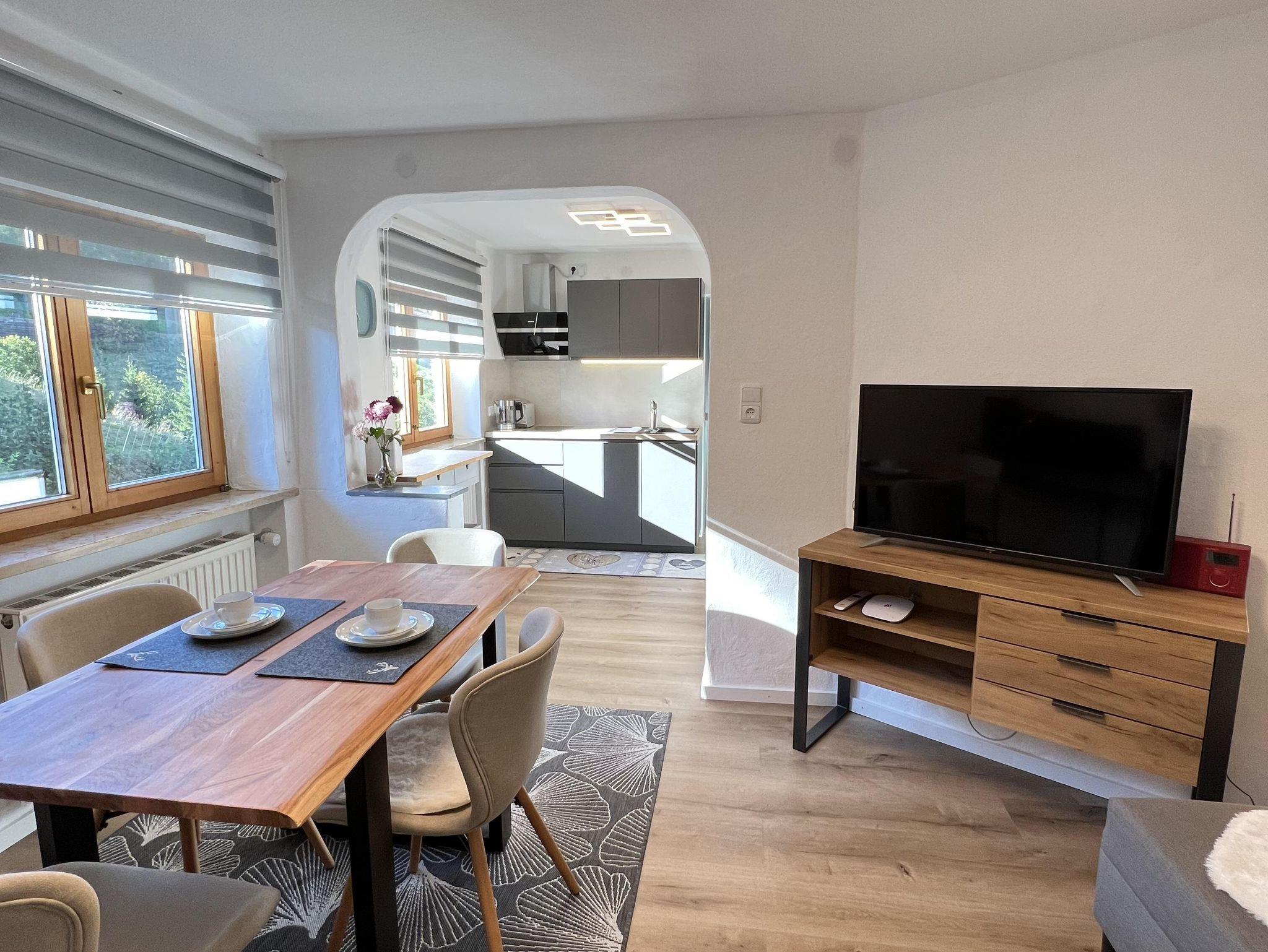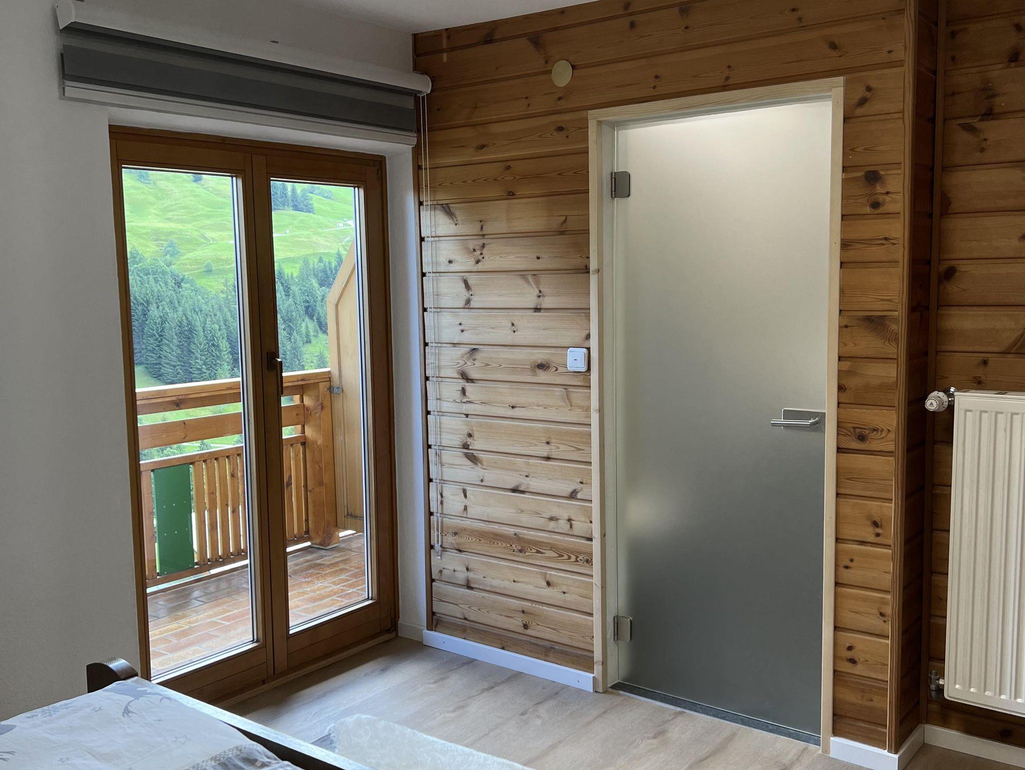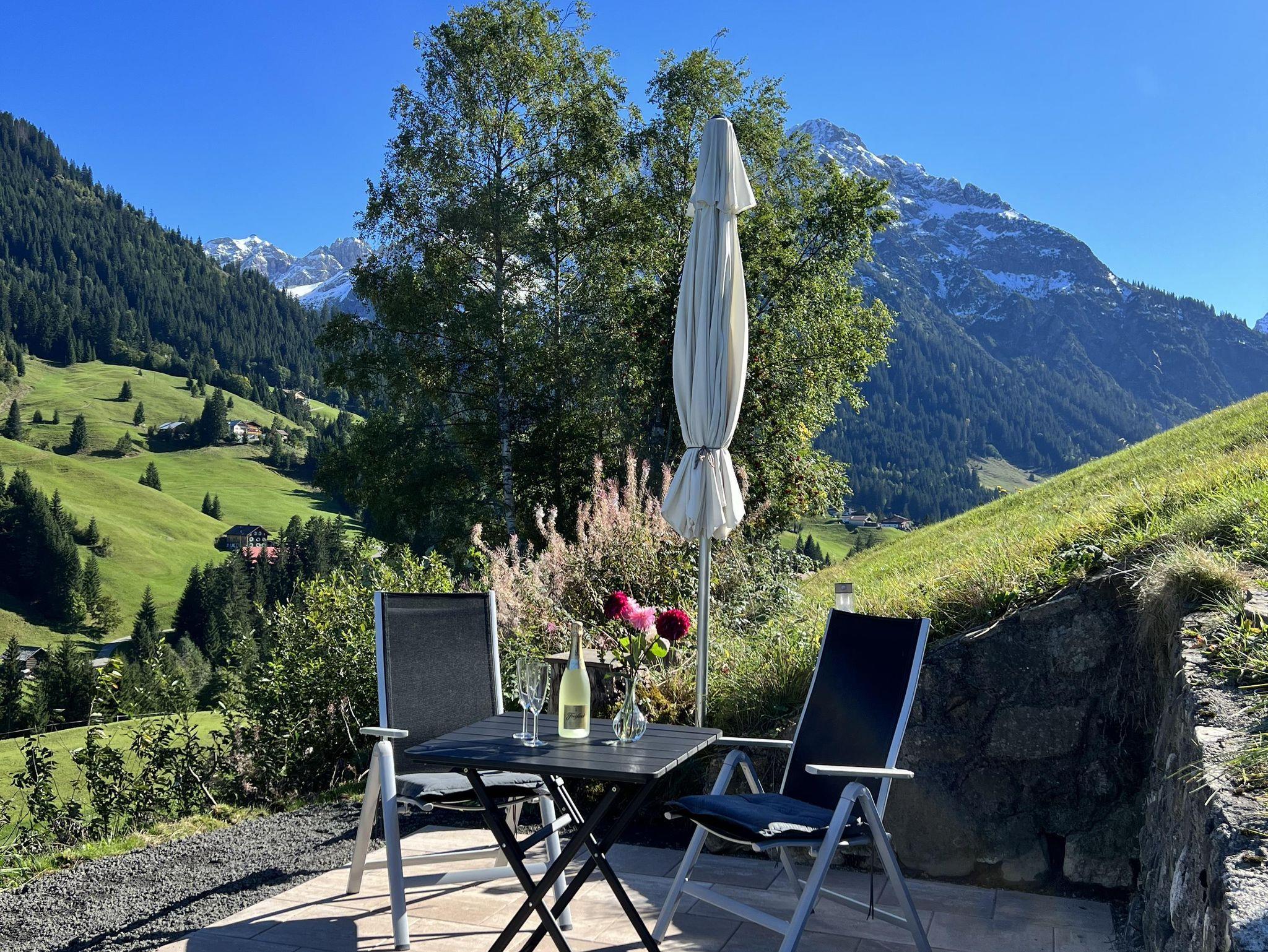 Schöne Ferienwohnung im Obergeschoss (renoviert 2022) mit Dusche/WC, Küchenzeile mit Kühlschrank/Gefrierfach, Geschirrspülmaschine, TASSIMO Kapsel-Maschine, Wasserkocher, Toaster und 2er Touch Control Cerankochfeld. Wohnbereich mit Massivholztisch, Fernseher mit A1-TV-Box und Schlafsofa. Abgetrennter Balkon am Schlafzimmer in Richtung Osten mit Klapptisch und zwei Stühlen. Eigene Terrasse im Garten mit Gartenmöbeln und tollem Ausblick in die Walser Berge.