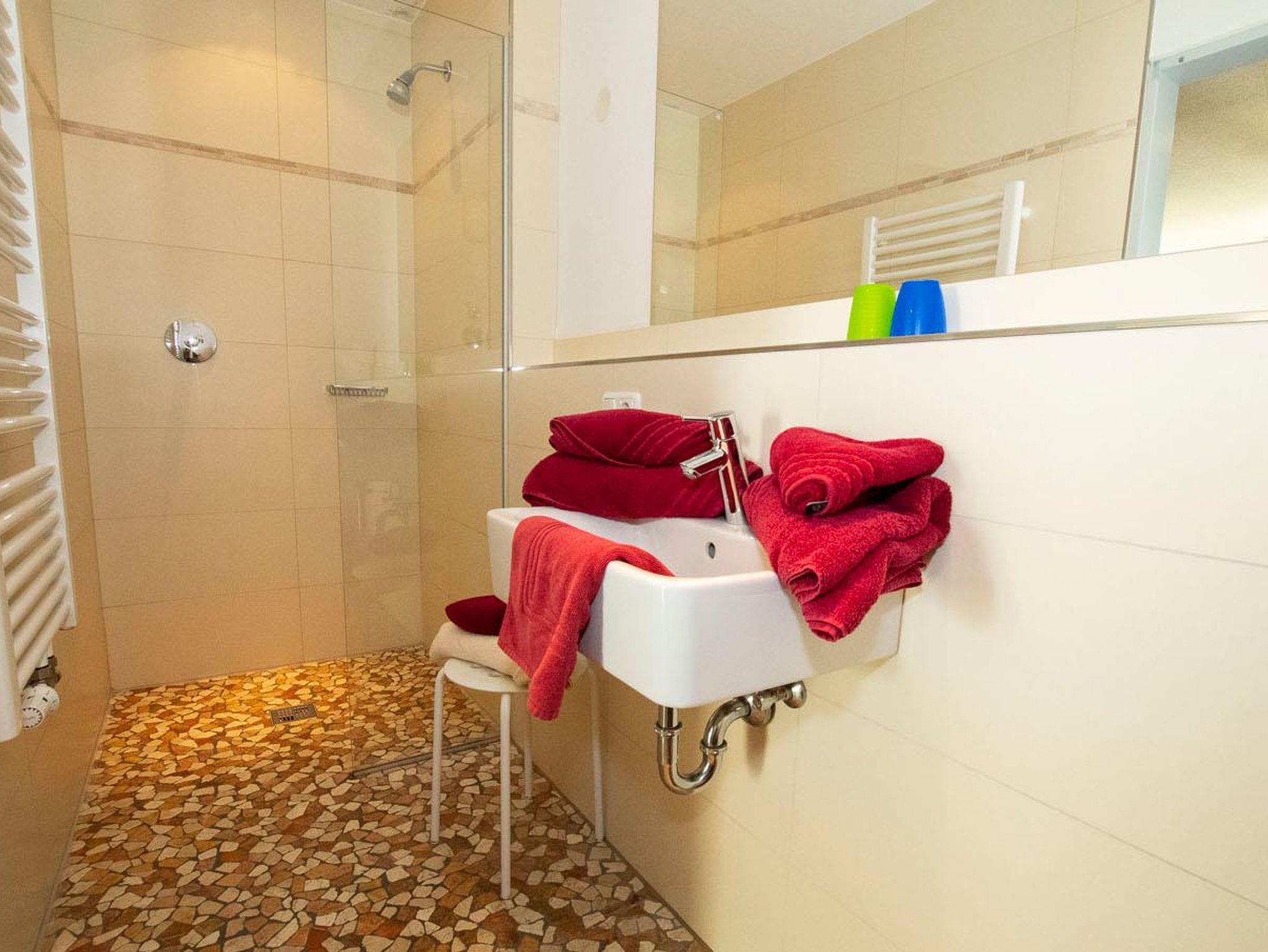Ebenerdiges Dusch-Bad, inkl. Hand- und Duschseife.