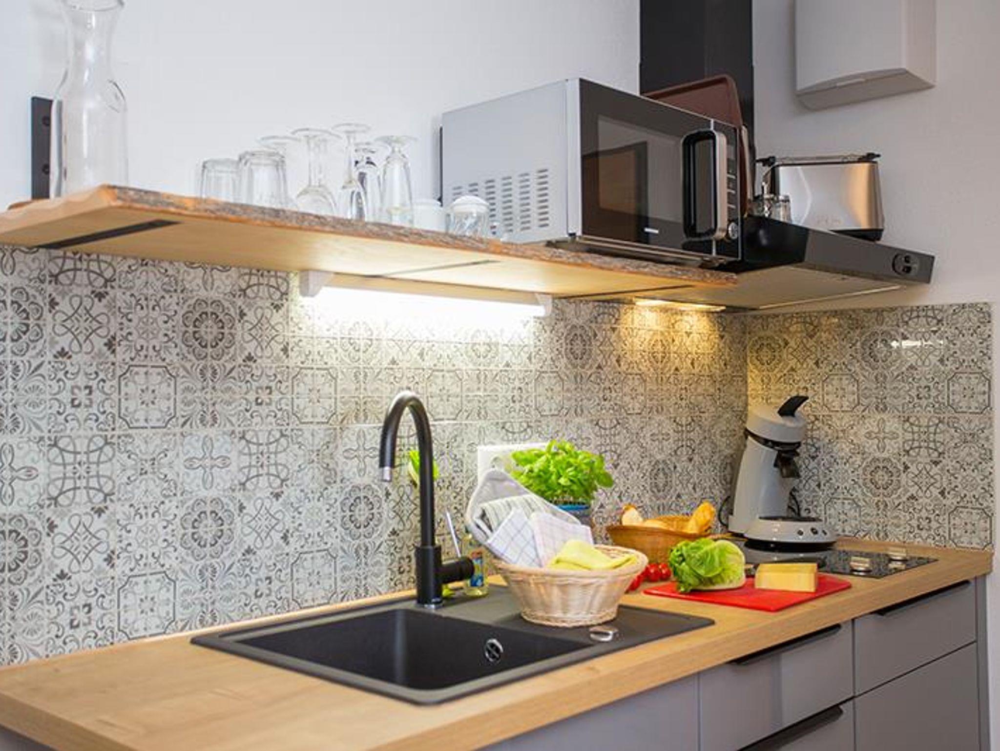 • Kleine Küchenzeile-voll ausgestattet: Ceranfeld, Kühlschrank, Kaffeemaschine, Toaster, Wasserkocher, Geschirr/Besteck + Geschirrtücher und Mikrowelle mit Grillfunktion