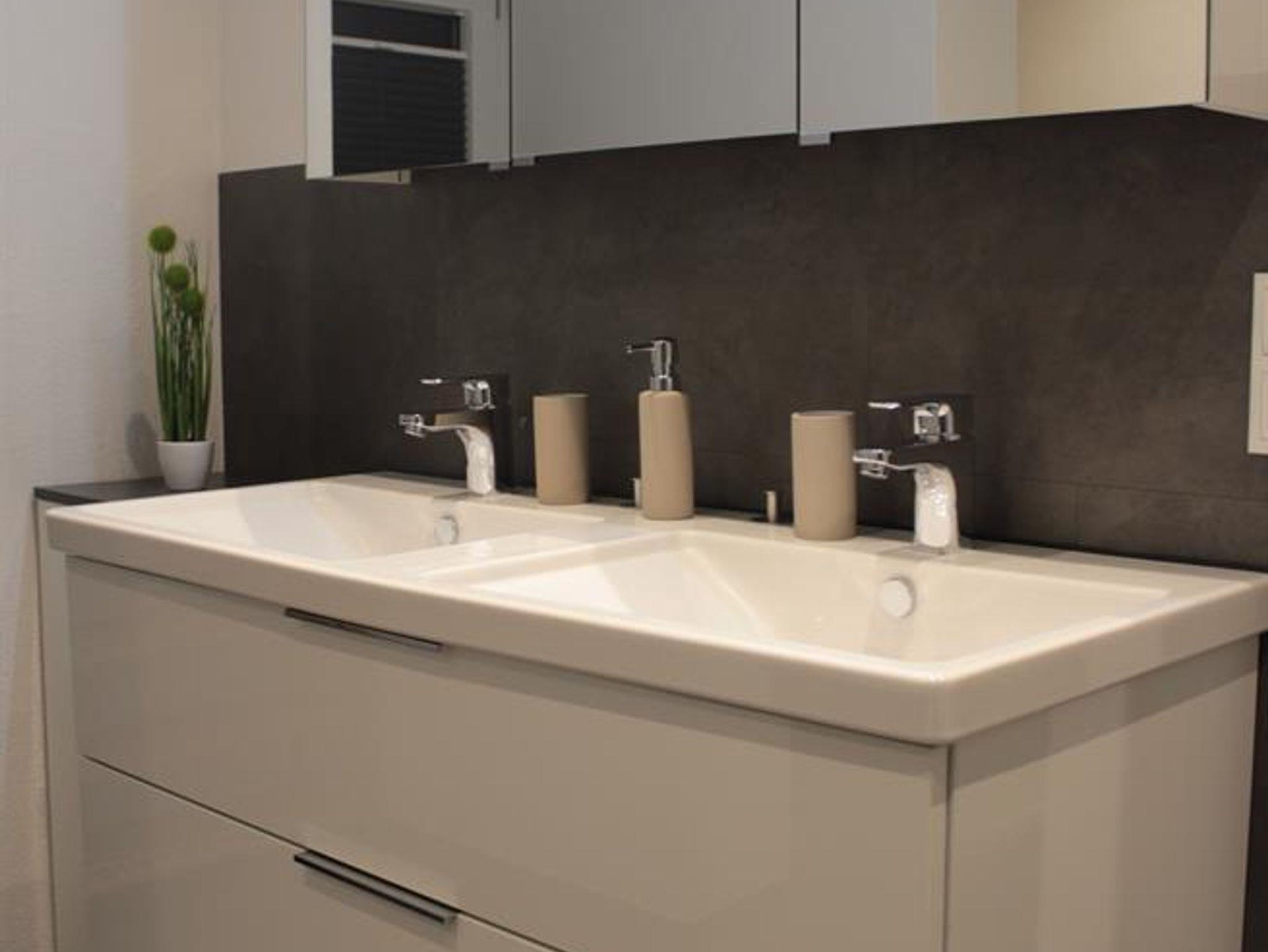 Das geräumige Badezimmer ist mit einer Dusche, zwei Waschbecken, einem Spiegelschrank, Haarföhn, WC und zwei Fenstern ausgestattet.