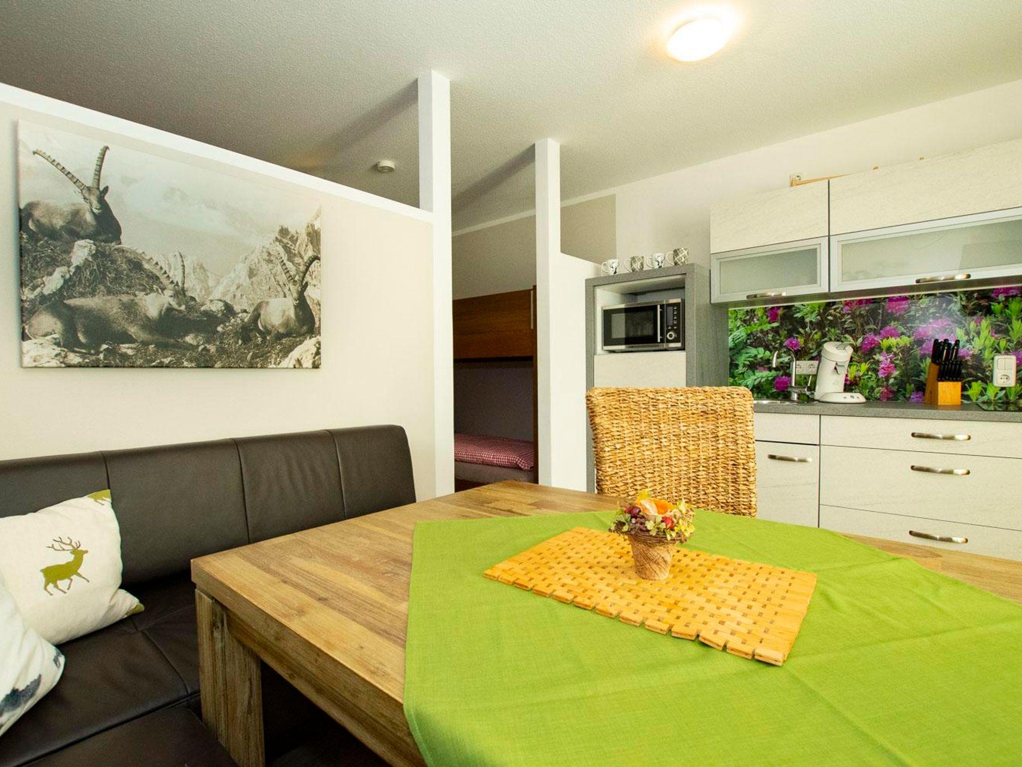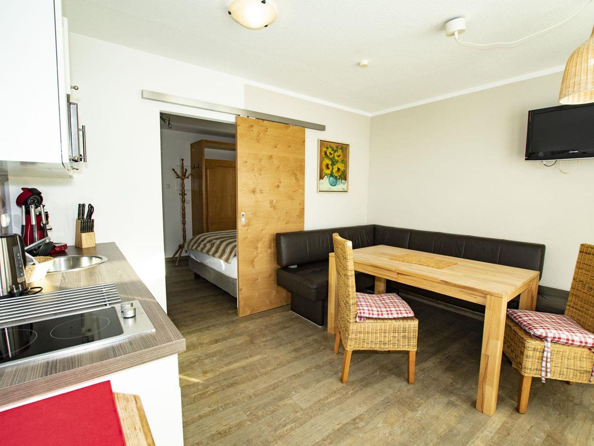 Gemütliches, kleines Appartement mit eigenem Eingang über die Terrasse. Im Wohn- Essbereich befindet sich eine Eckcouch mit Esstisch und eine voll ausgestattete Küchenzeile. 2-Platten Herd, Micro-Grill, Wasserkocher, Toaster und Kaffemaschine.