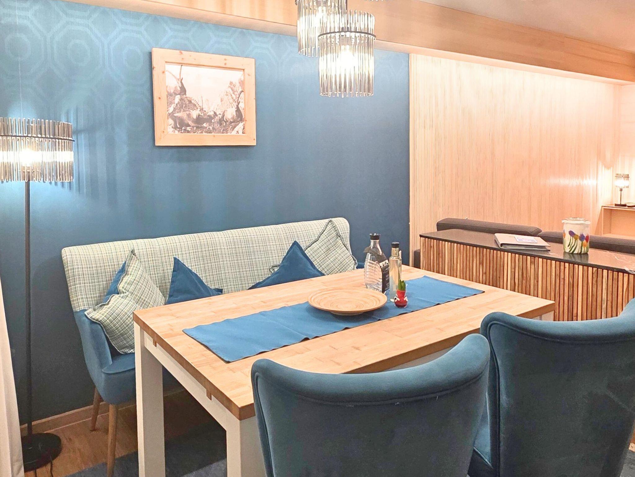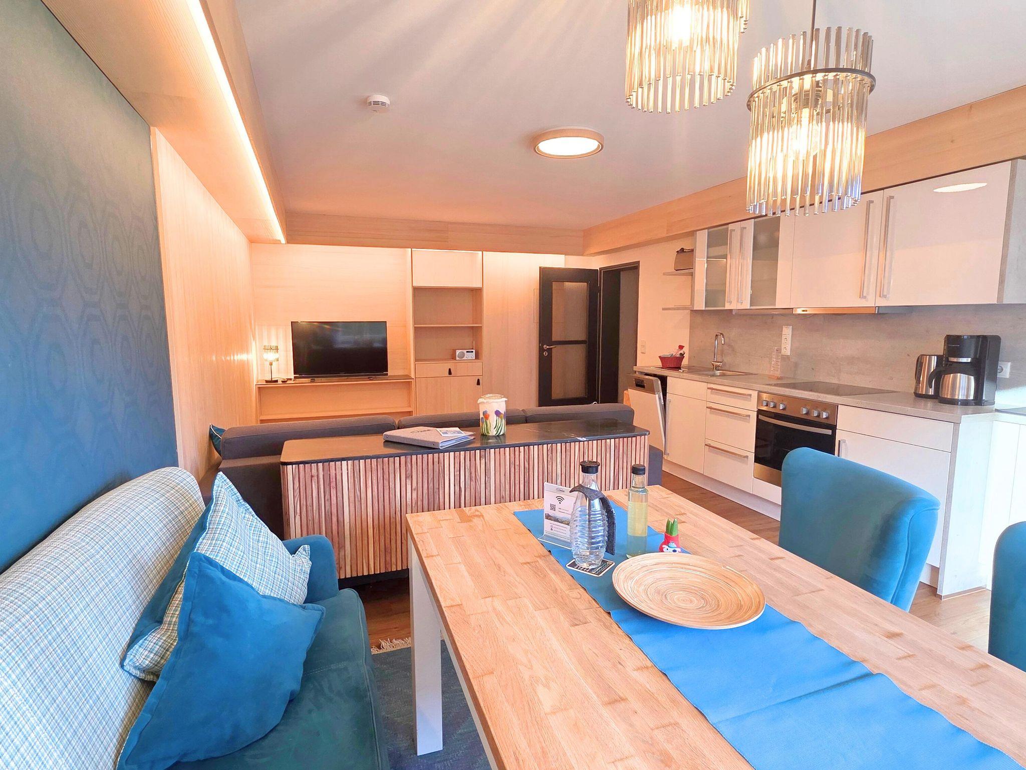 • Moderner Wohn-Essbereich mit Essecke; Schlafcouch im Wohnbereich mit Internetradio und Sat-TV