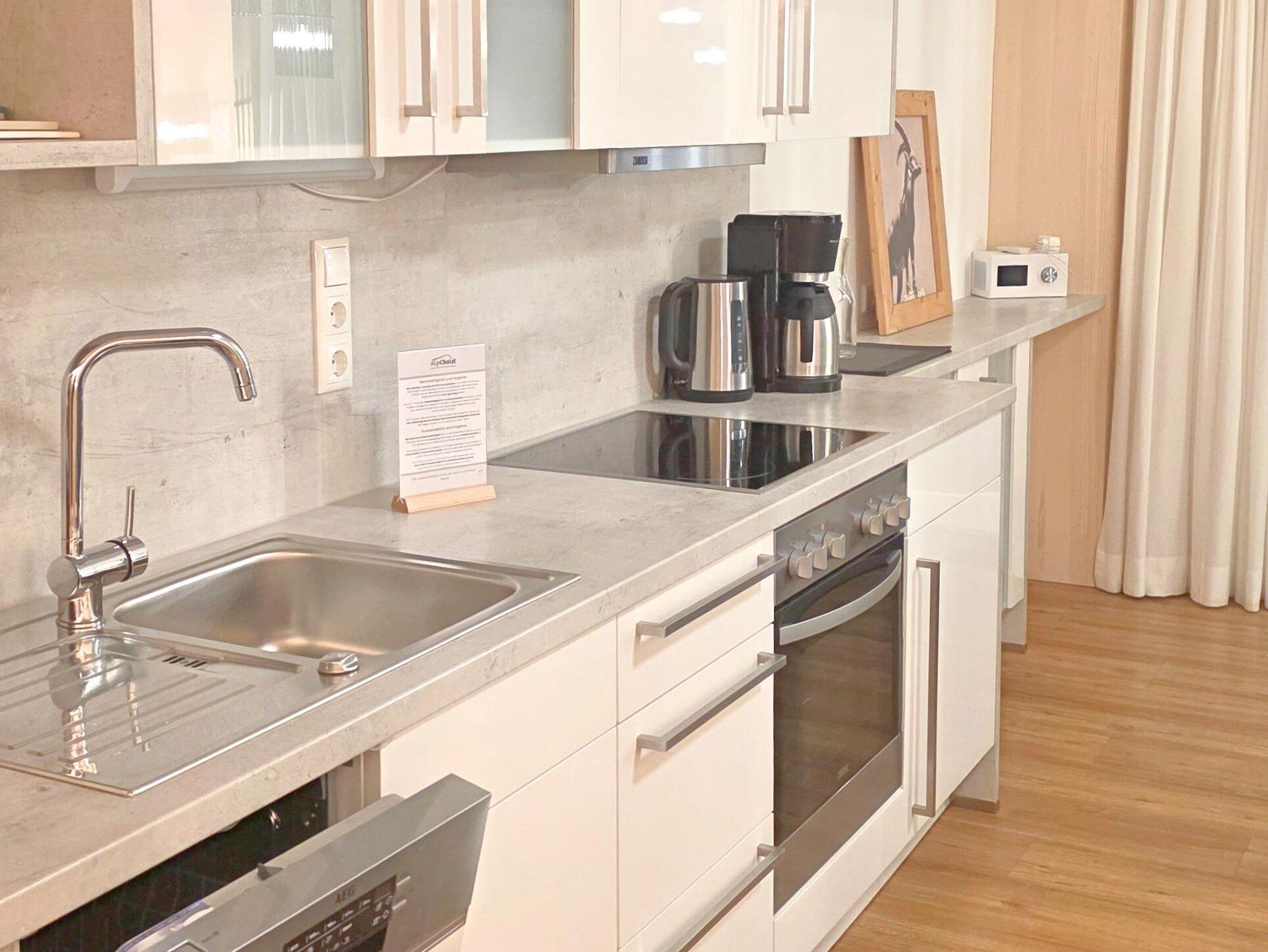 • Küche voll ausgestattet: Ceranfeld, Backofen, Kühlschrank + Gefrierfach, Kaffeemaschine, Toaster, Wasserkocher, Geschirr/Besteck + Geschirrtücher und Spülmaschine.