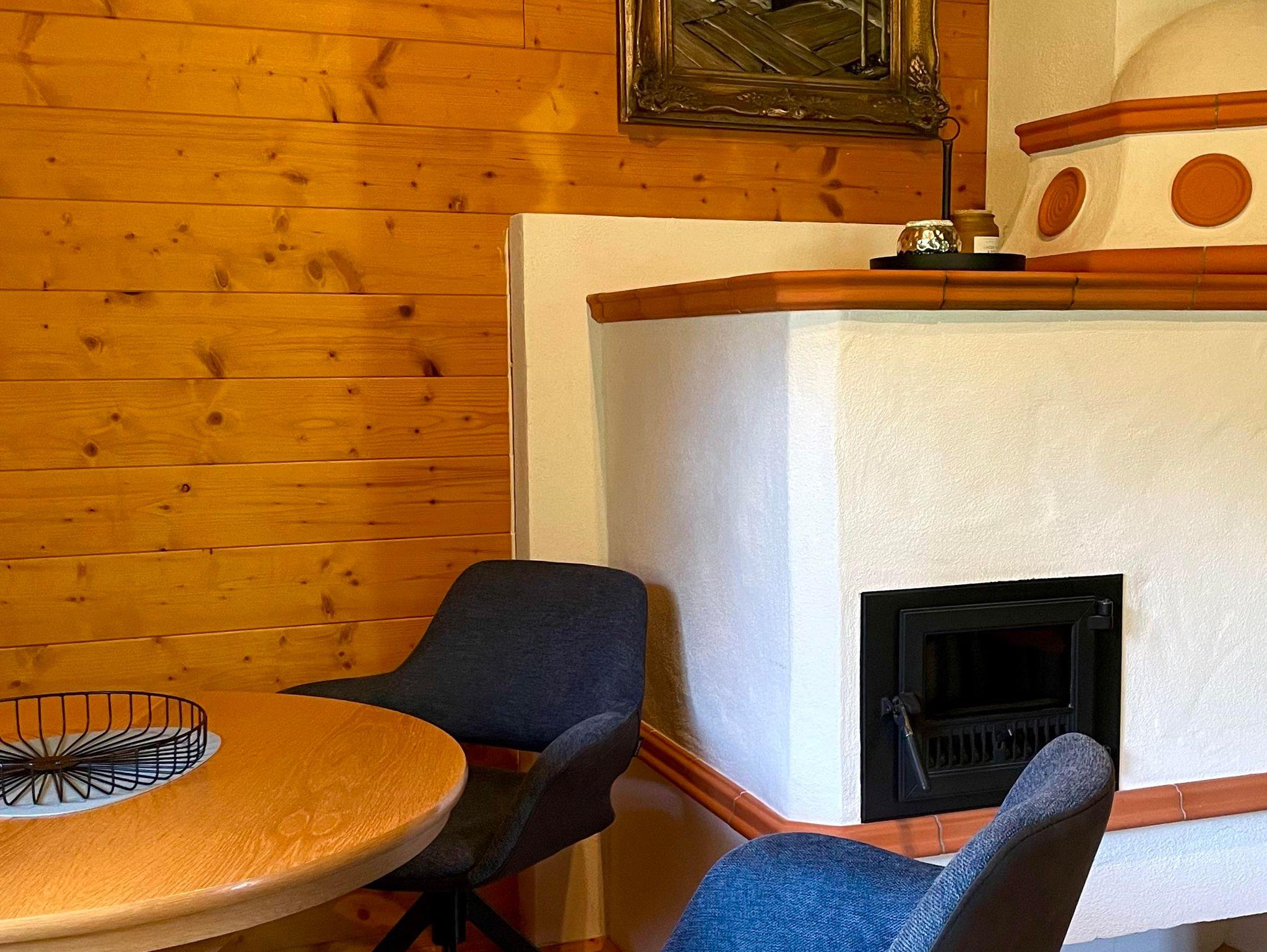Großer Wohnbereich mit Couch, Sitzgelegenheit und als Highlight einen Kachelofen
