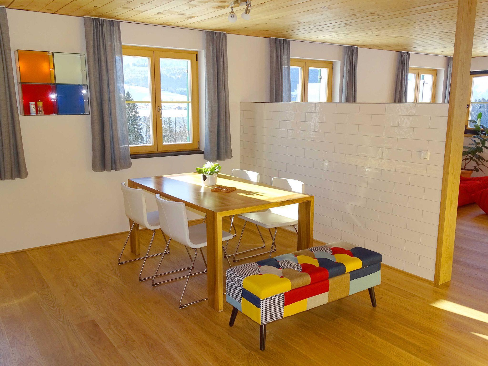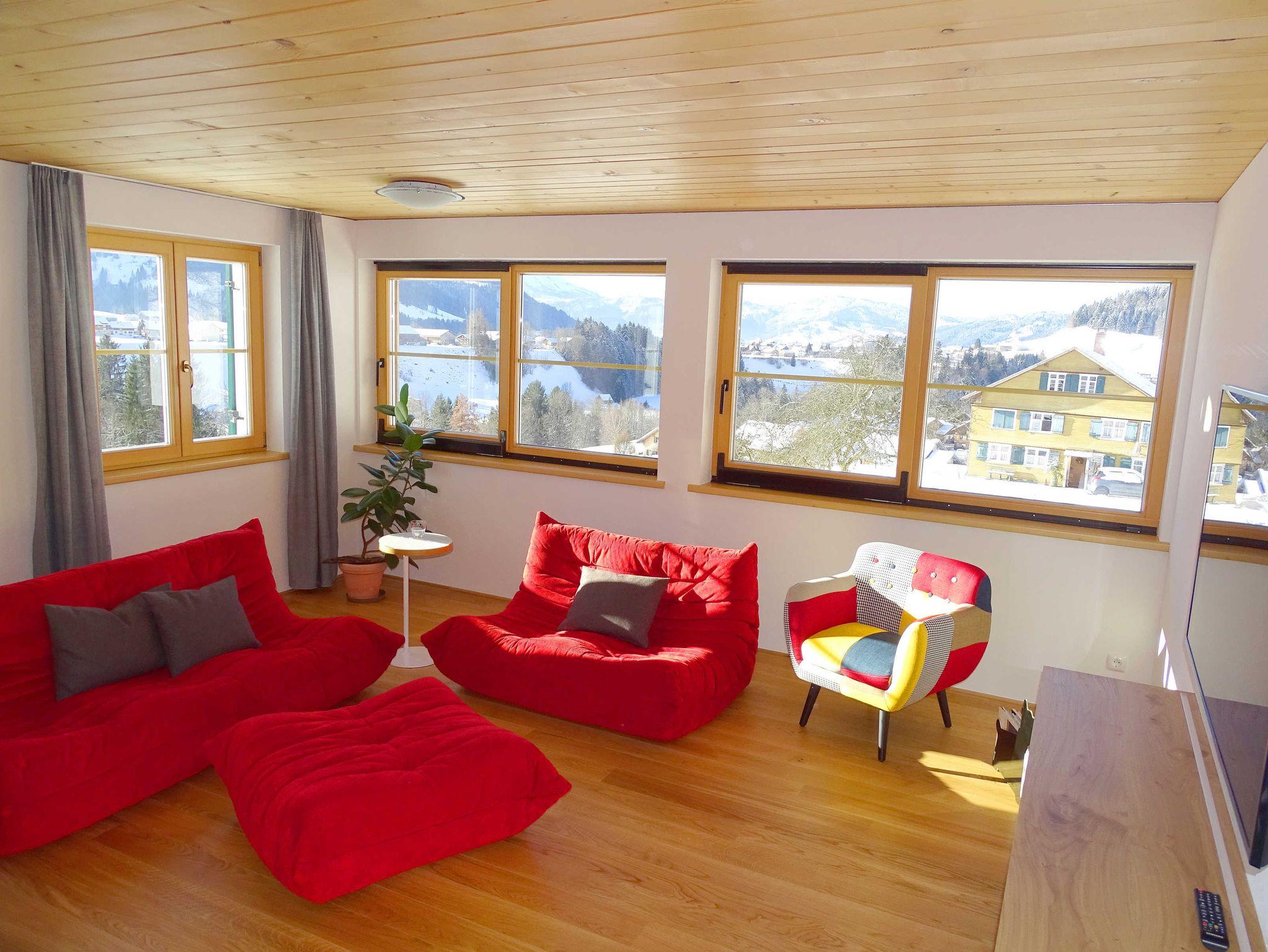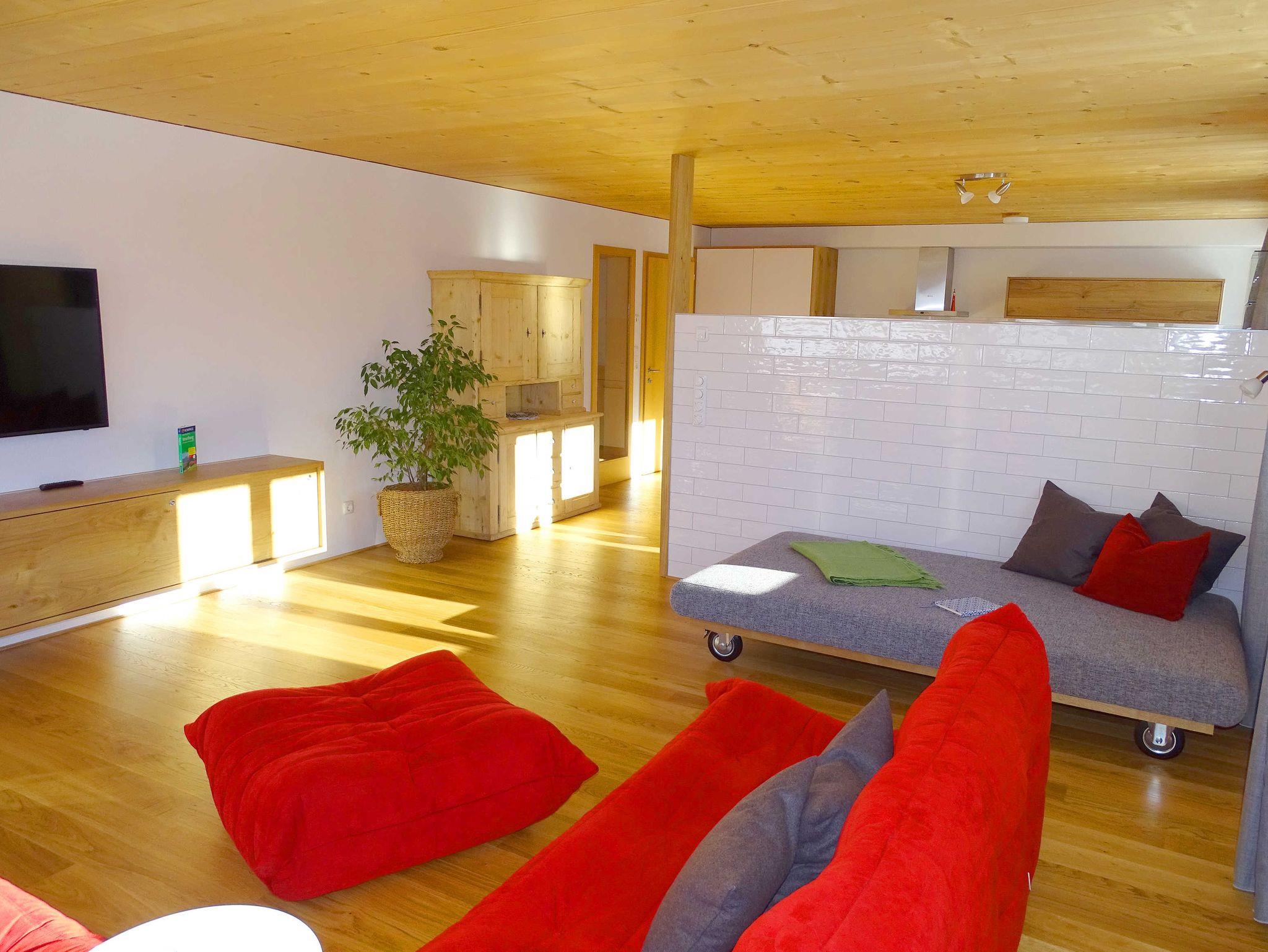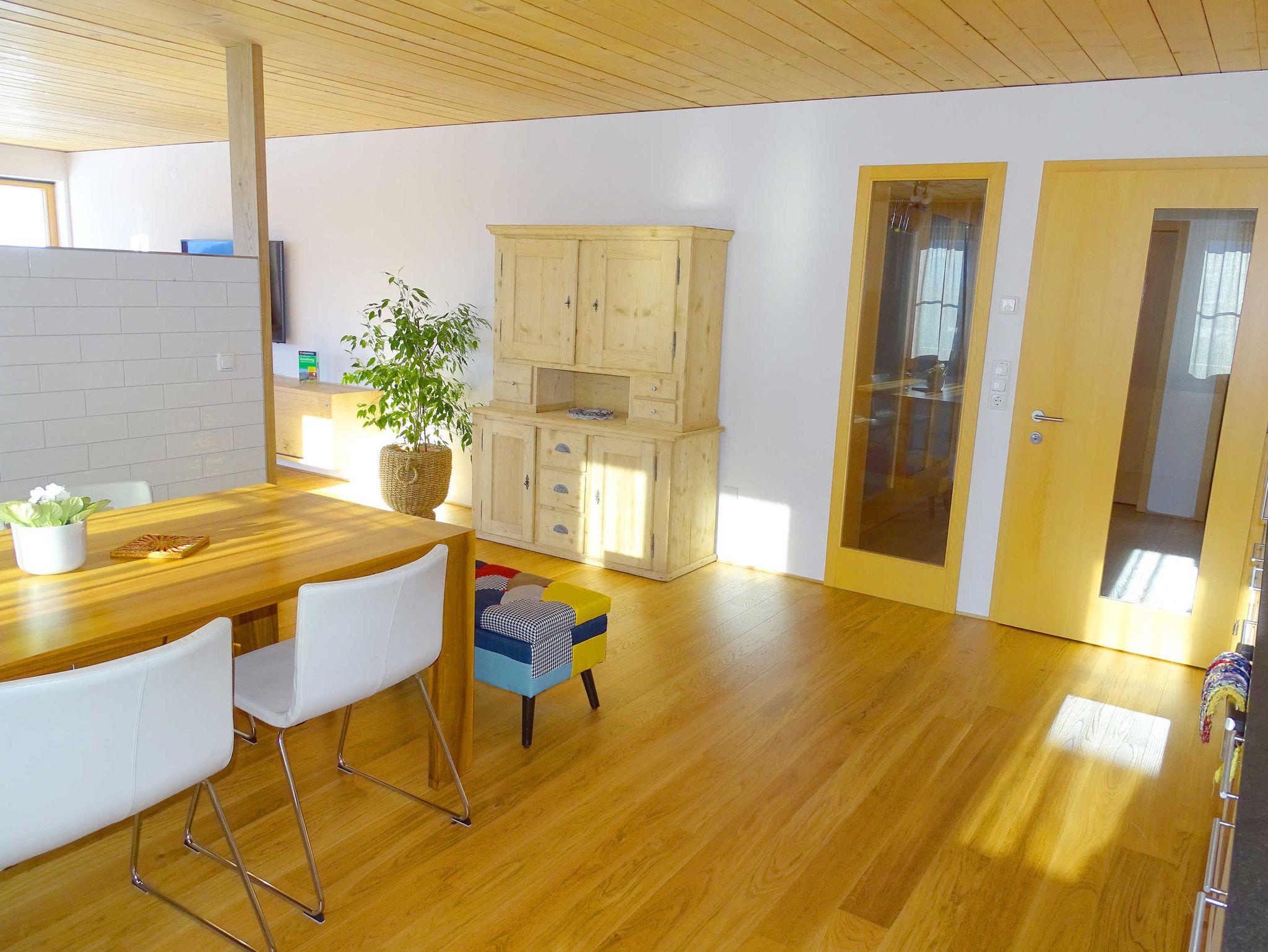 Die helle und geräumige Wohnung verfügt über einen Panoramablick auf die Winterstaude und den Rotenberg. Traditionelle Architektur mit Naturholz sorgen für Ihr Wohlbefinden.