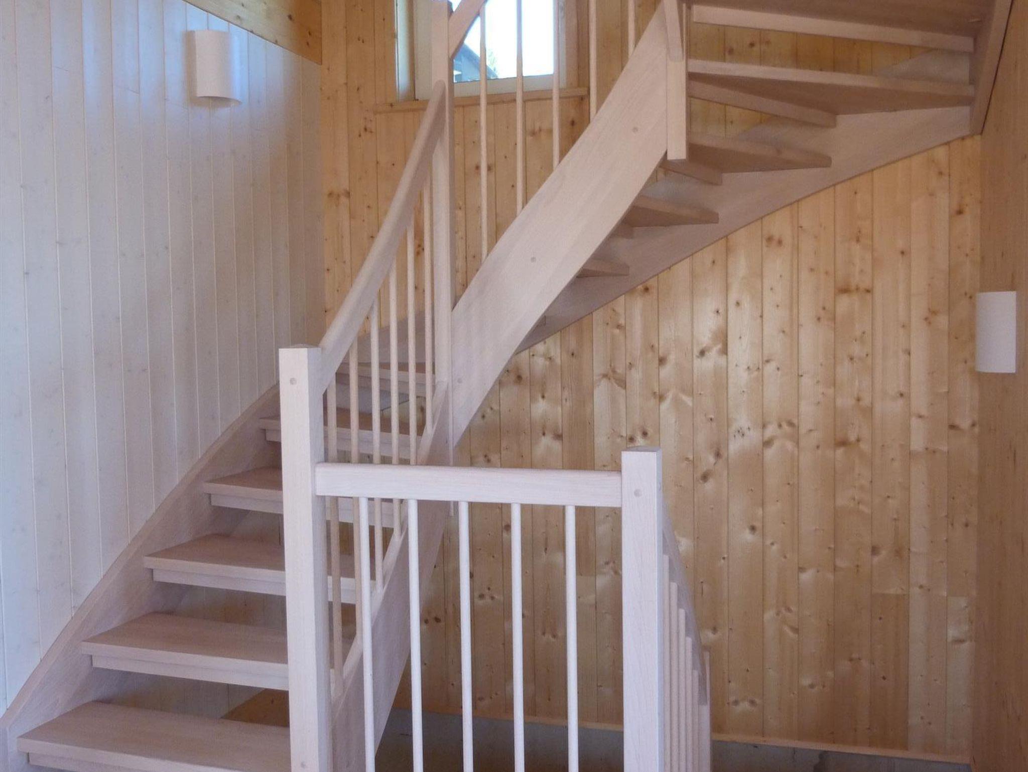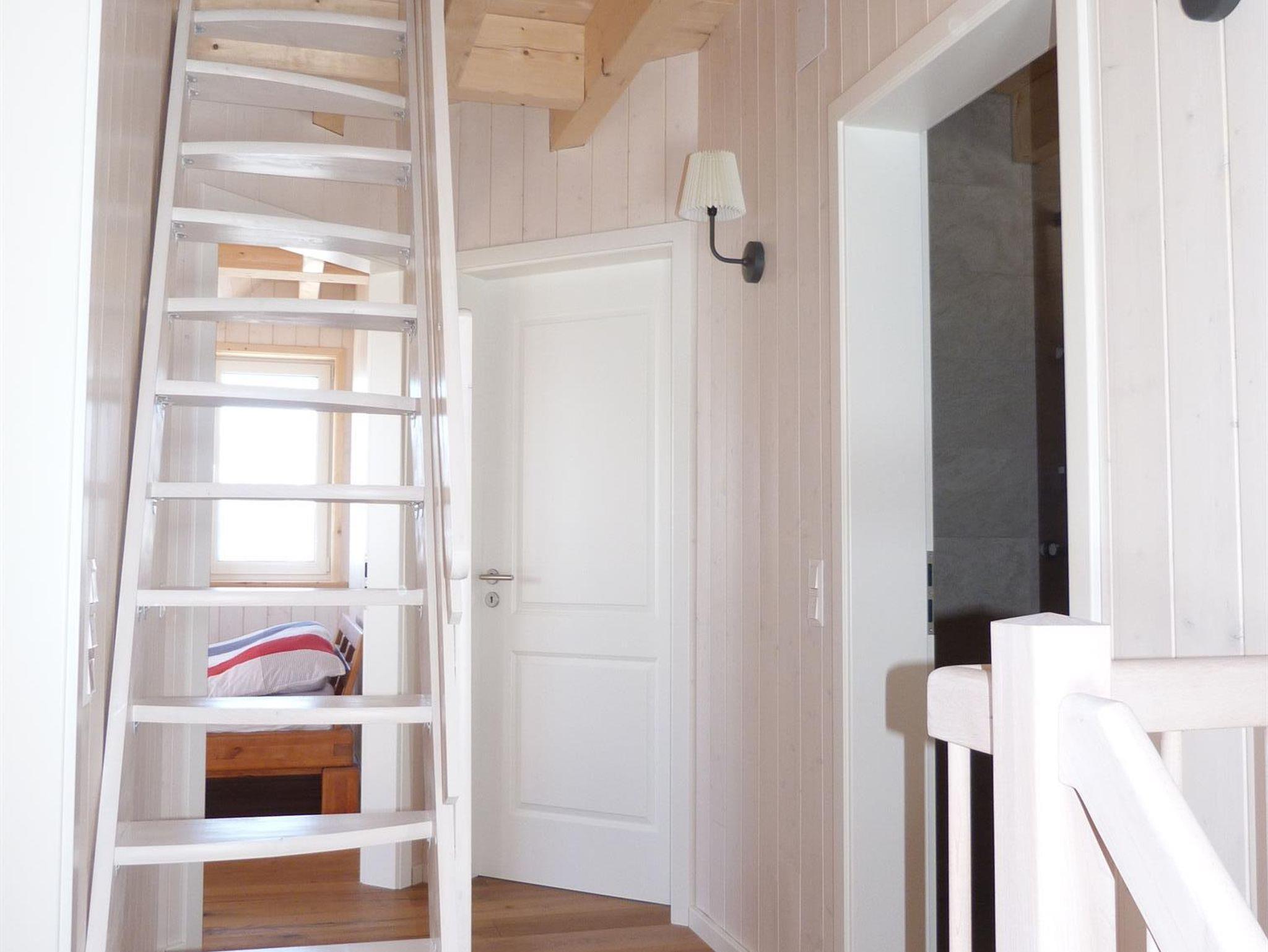 In der nächsten Etage ist die offene Küche mit Wohn- Essbereich untergebracht. Mit Geschirrspüler, Kühlschrank mit Gefrierfach, Backofen, Herd, Kaffeemaschine, Toaster, Wasserkocher, Handrührgerät, Zauberstab sowie ausreichend Koch- und Essgeschirr sollten den kulinarischen Zubereitungswünschen keine Hindernisse im Wege stehen. Im Essbereich befindet sich eine große Tischgruppe, die über die Balkontüren eine wunderbare Fernsicht hat. Eines der beiden Badezimmer mit Toilette, Waschbecken und begehbarer Dusche befindet sich ebenfalls auf dieser Ebene. Das gleichwertige zweite Badezimmer befindet sich zusammen mit den drei Schlafzimmern im Obergeschoss. Die Schlafzimmer sind entweder mit einem Doppelbett (Zimmer 2 + 3) oder einem französischen Bett (Zimmer 1) sowie mit Schränken ausgestattet. Die Betten im Zimmer 3 lassen sich auch einzeln stellen.