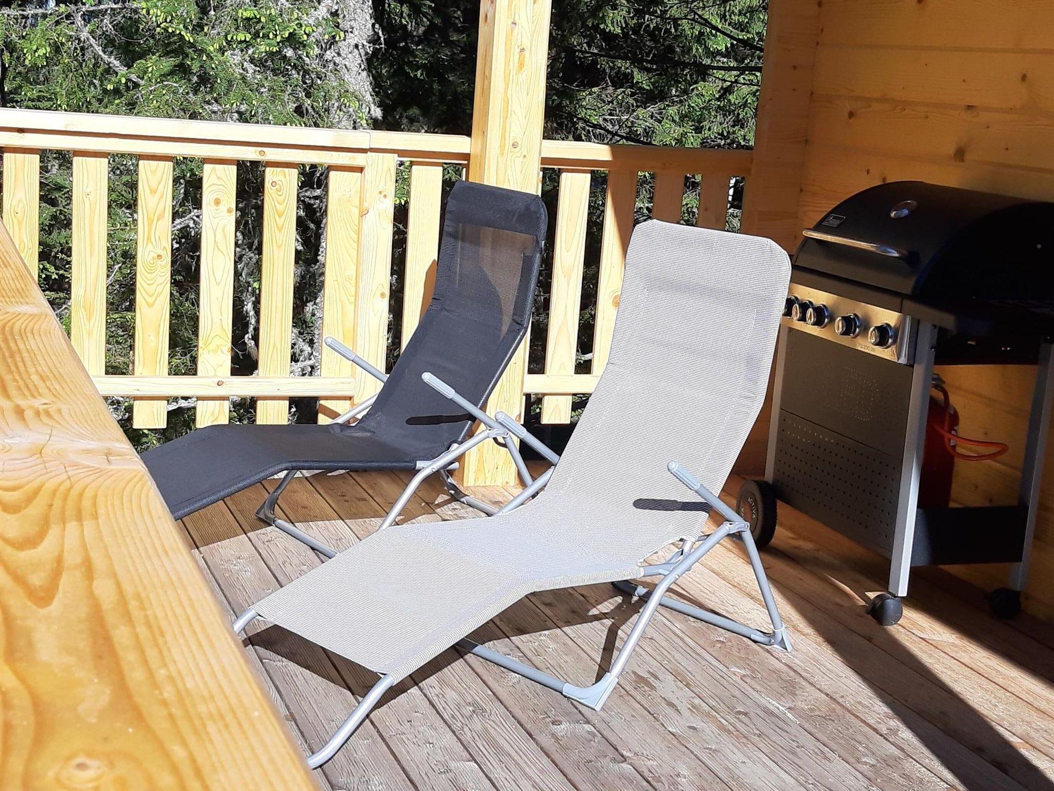 • Veranda mit Elektrogrill, Sonnenschirm und Liegestühlen