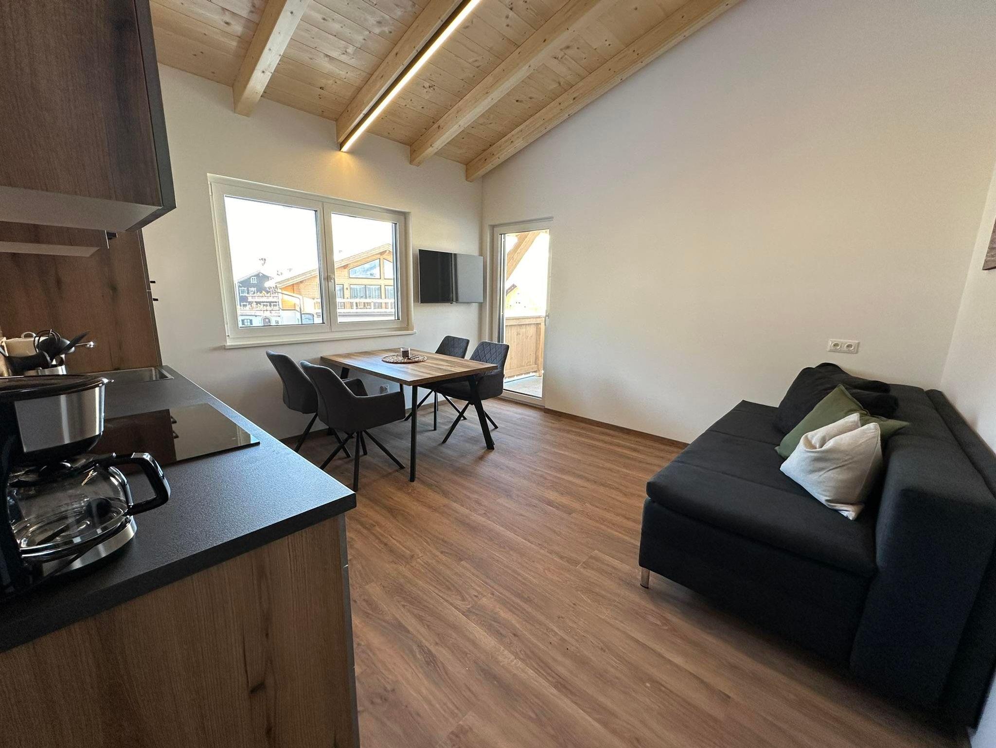 • Wohnraum mit Schlafsofa, Küche und Essbereich