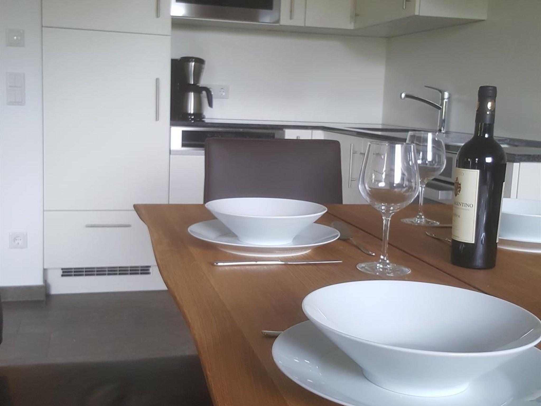 Im großzügigen Wohn-/Essbereich mit offener Küche können bis zu 8 Personen bequem auf einer modernen Eckbank und Stühlen, die mit edlem Echtleder überzogen sind, ausgiebig speisen und talken.