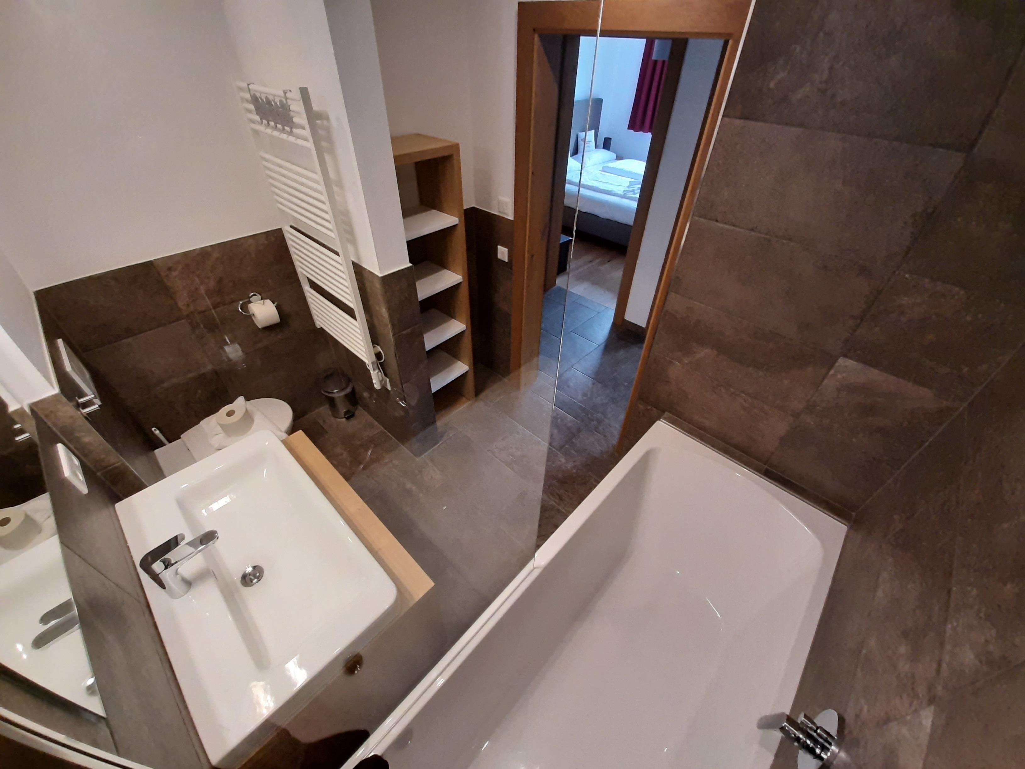 In den beiden Badezimmern relaxen Sie entweder in der Badewanne oder im Aroma der ätherisch duftenden Zirbensauna. Oder Sie genießen in der Früh oder nach dem Saunagang die großzügige Walk In Dusche.