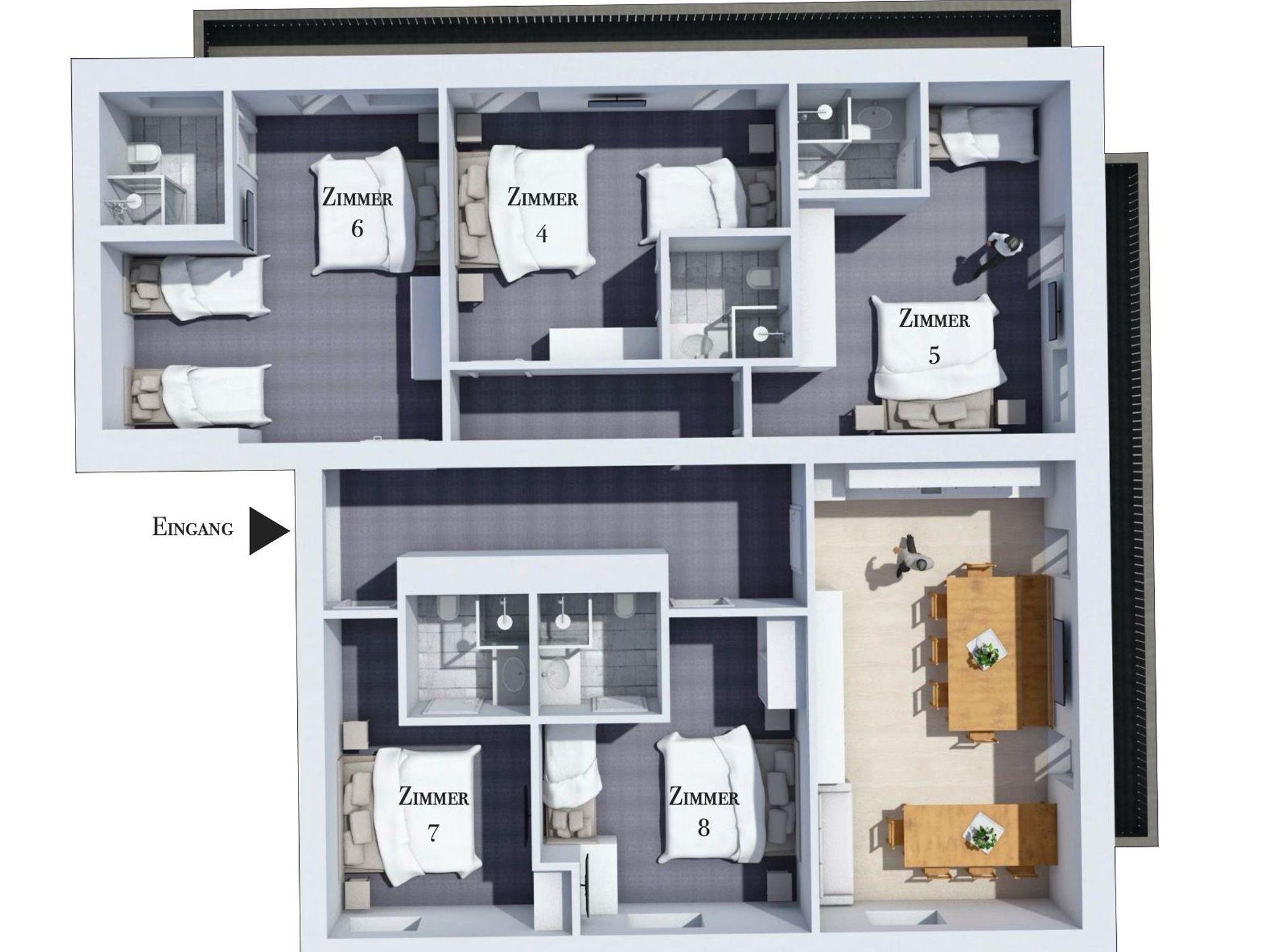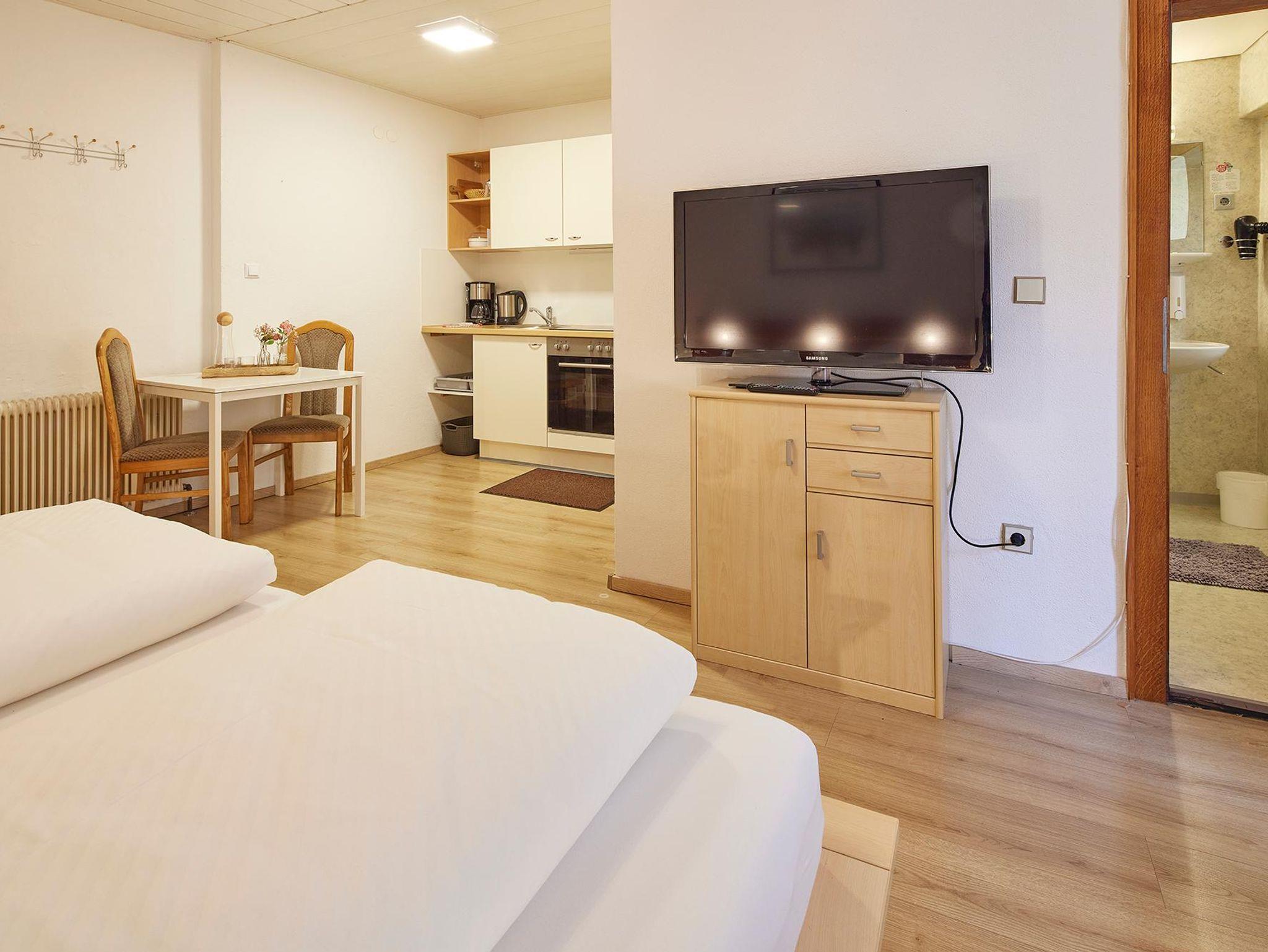 Die neue Einbauküche ist komplett ausgestattet mit Kochfeld, Backofen, Mikrowelle, 4 Kühlschränken, Geschirrspüler sowie weiteren Elektro-Haushaltsgeräten. Der angrenzende Aufenthaltsraum verfügt wie die Küche über einen Balkon und eine Zentralheizung. Hier befindet sich ein weiteres Fernsehgerät zum Empfang vielfältiger TV- und Radioprogramme. Das W-LAN stellen wir Ihnen kostenlos zur Verfügung.