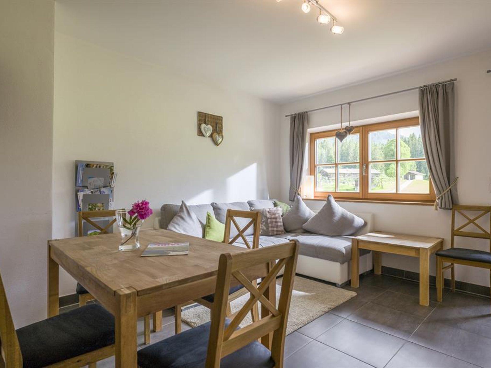 Im Wohnraum steht eine Couch zum Chillen und ein Essbereich mit genügend Platz zum gemütlichen zusammensitzen.
