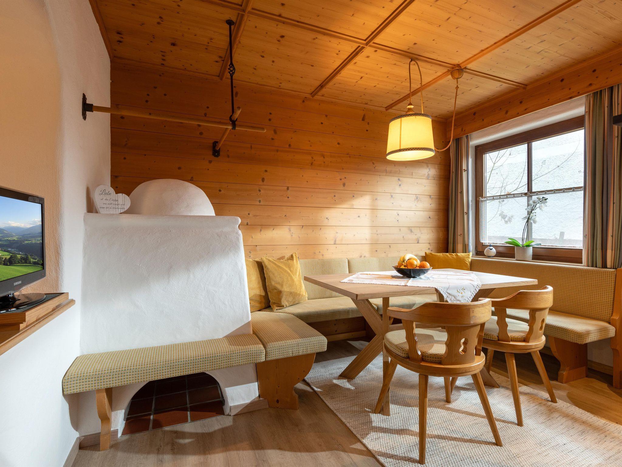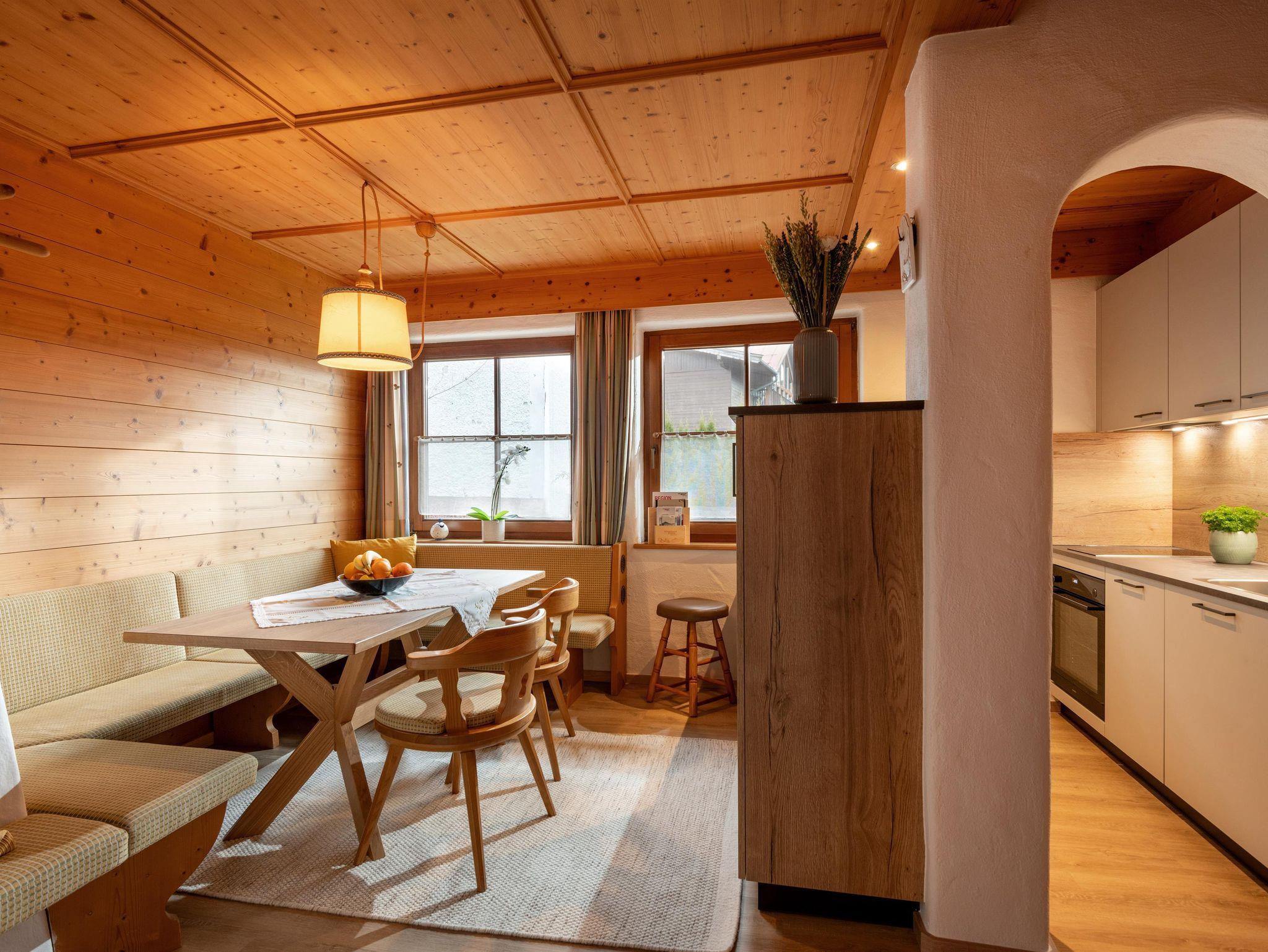 Gemütliches Appartement mit heller Holzverkleidung und elektrischem Kachelofen. Das Appartement hat einen Vorraum mit Garderobe, einen Wohnraum mit offenem Durchgang zum Schlafbereich, ein Schlafzimmer mit getrennten Betten, ein Badezimmer mit Dusche, ein separates WC und eine bestens ausgestattete Küche.