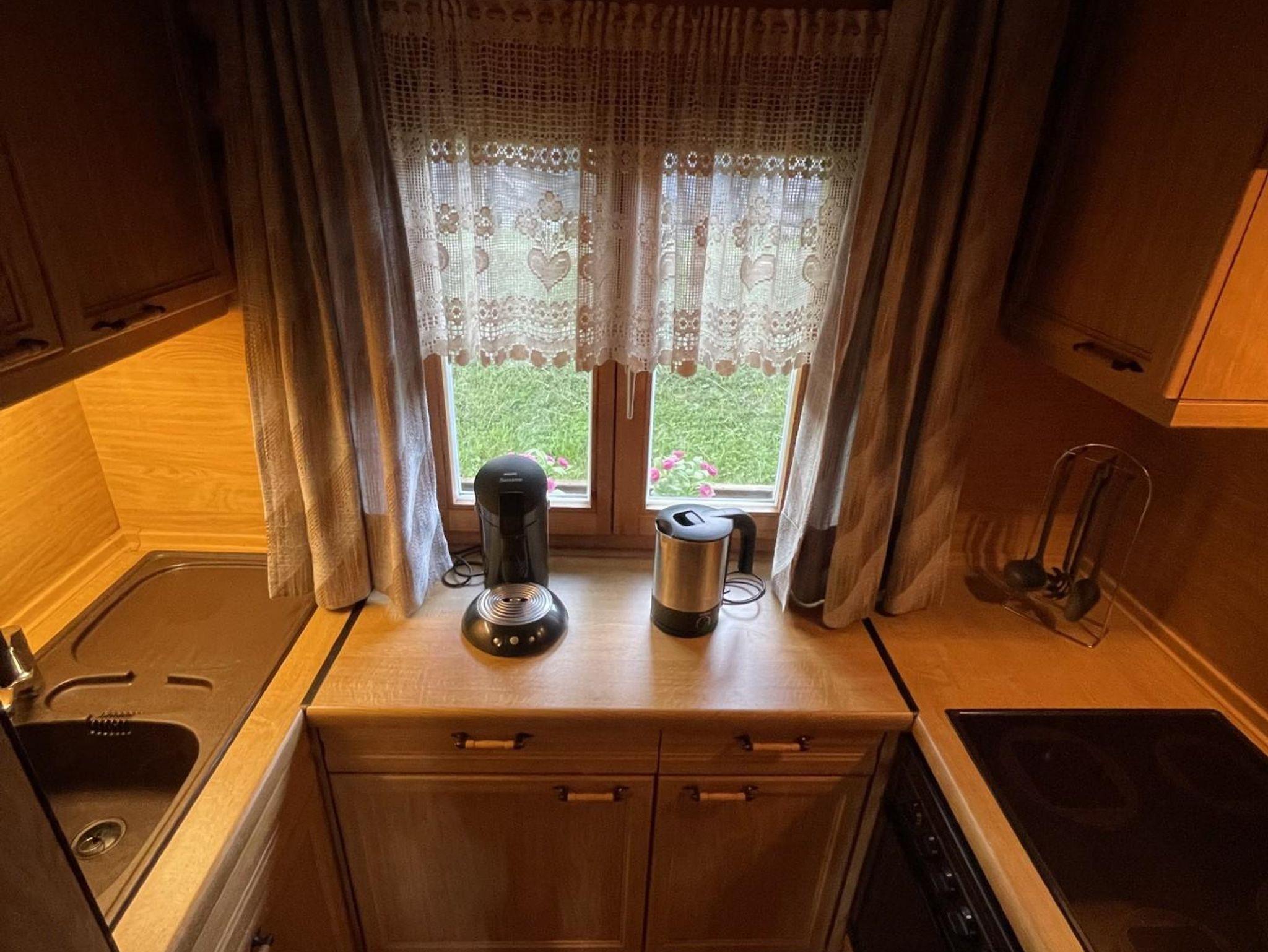 Ein geräumiger Wohnraum mit TV und einer Küche lädt zum gemütlichen Beisammensein ein.