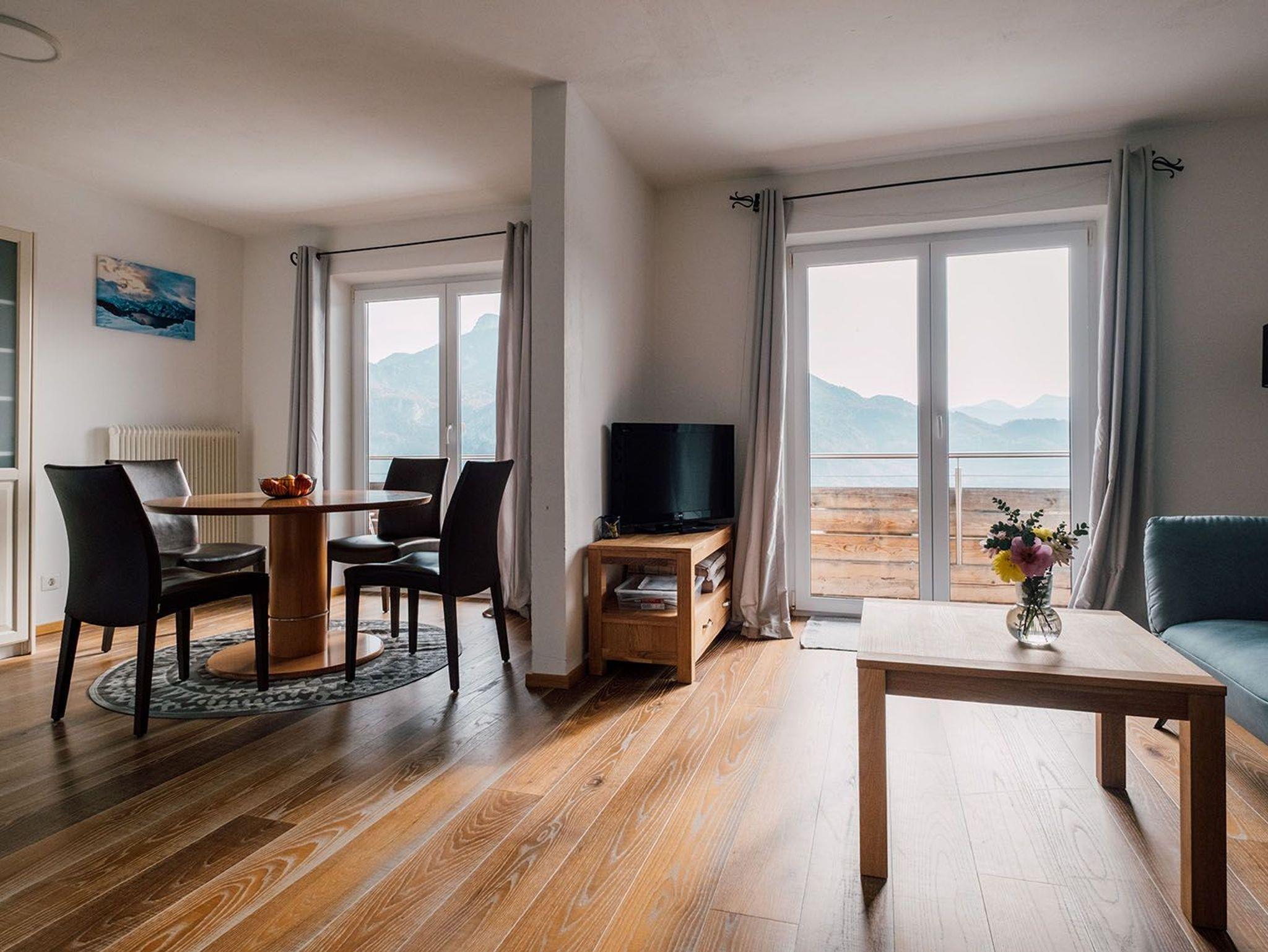 Die gemütliche Wohnung liegt auf einem idyllischen Bauernhof im Salzkammergut, mitten in der Natur, in sonniger Südhnaglage ? ideal für Familien und Ruhesuchende. Die traumhafte Umgebung begeistert mit einem herrlichen Panorama über Mondsee und Schafberg, ebenso wie der beheizte Pool, die Sauna und Infrarotkabine. Wanderungen oder Mountainbike-Touren starten direkt ab der Haustüre.Auf dem wettergeschützen Balkon mit Seeblick können Sie den Abend entspannt ausklingen lassen. Die geräumige Wohnung ist zeitlos modern eingerichtet und bietet einen großzügigen Wohn-Essbereich. Mit dem Flat-Screen-Kabel-TV und WLAN bleiben Sie immer bestens verbunden.