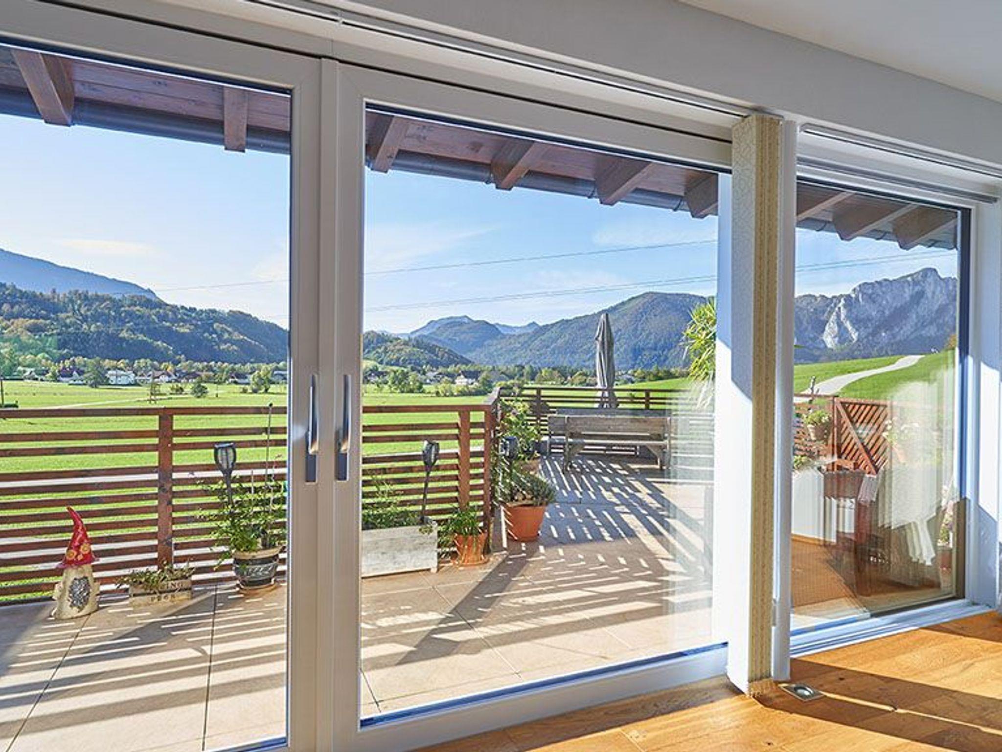 Bewundern Sie aus einem 7 Meter breiten Panoramafenster die wunderschöne Aussicht auf die Gipfel der umliegenden Berge oder relaxen Sie auf unserer großen, sonnigen Dachterrasse.