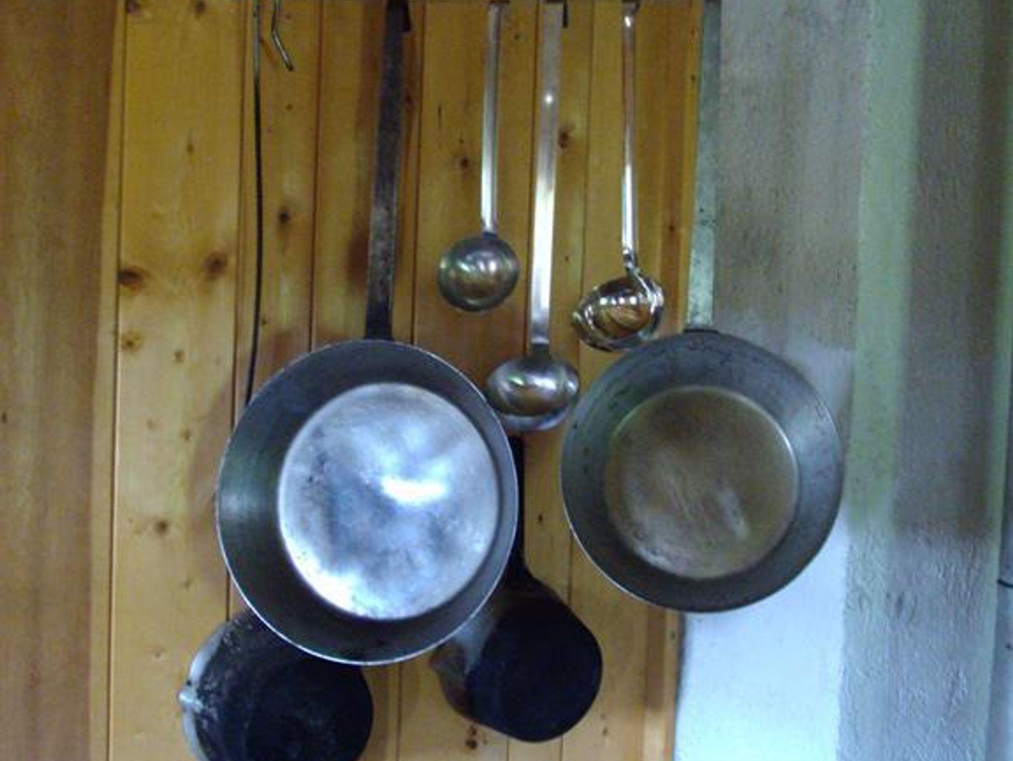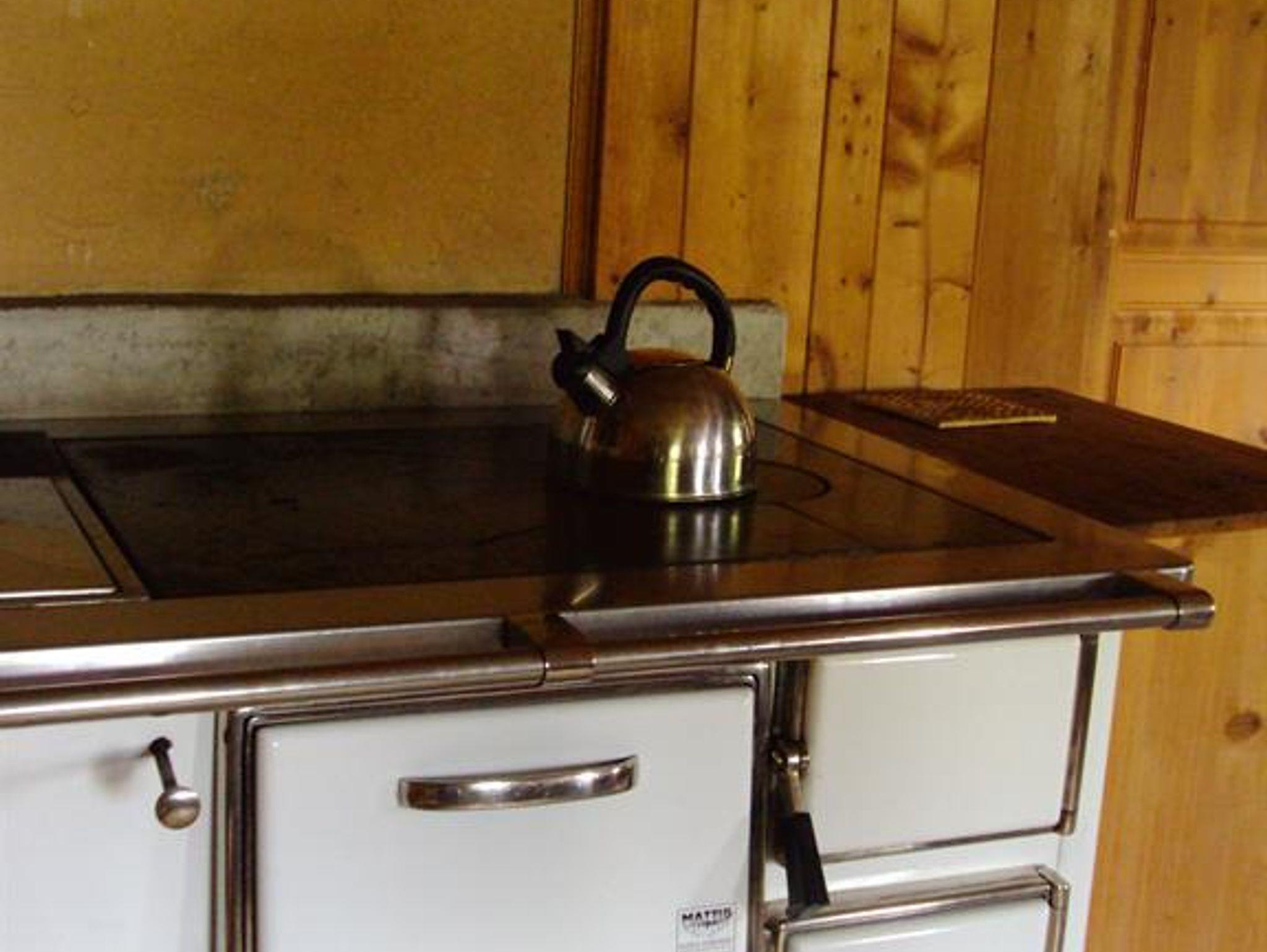 Holzherd in der Küche. Lichtstrom kommt von der Photovoltaik Anlage. Ein Bad ist nicht vorhanden, jedoch aber Campingduschen die man außer Haus verwenden kann. Ebenso gibt es kein modernes Spülklosett.