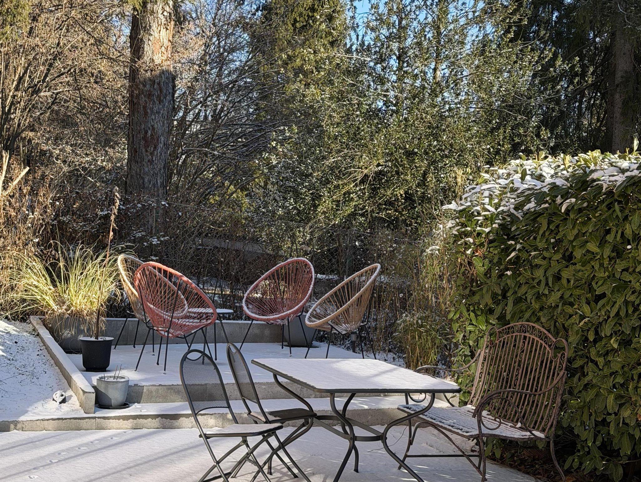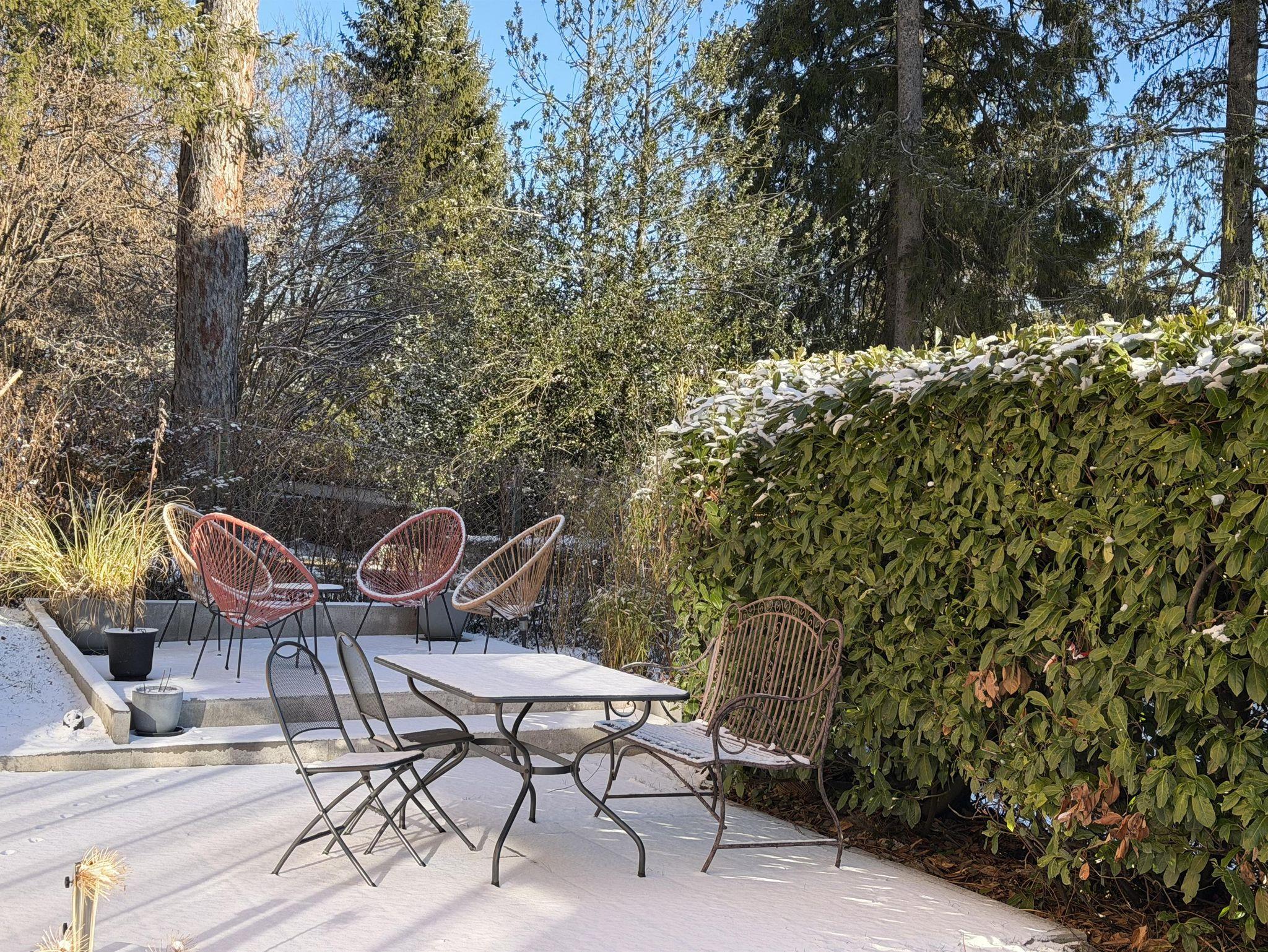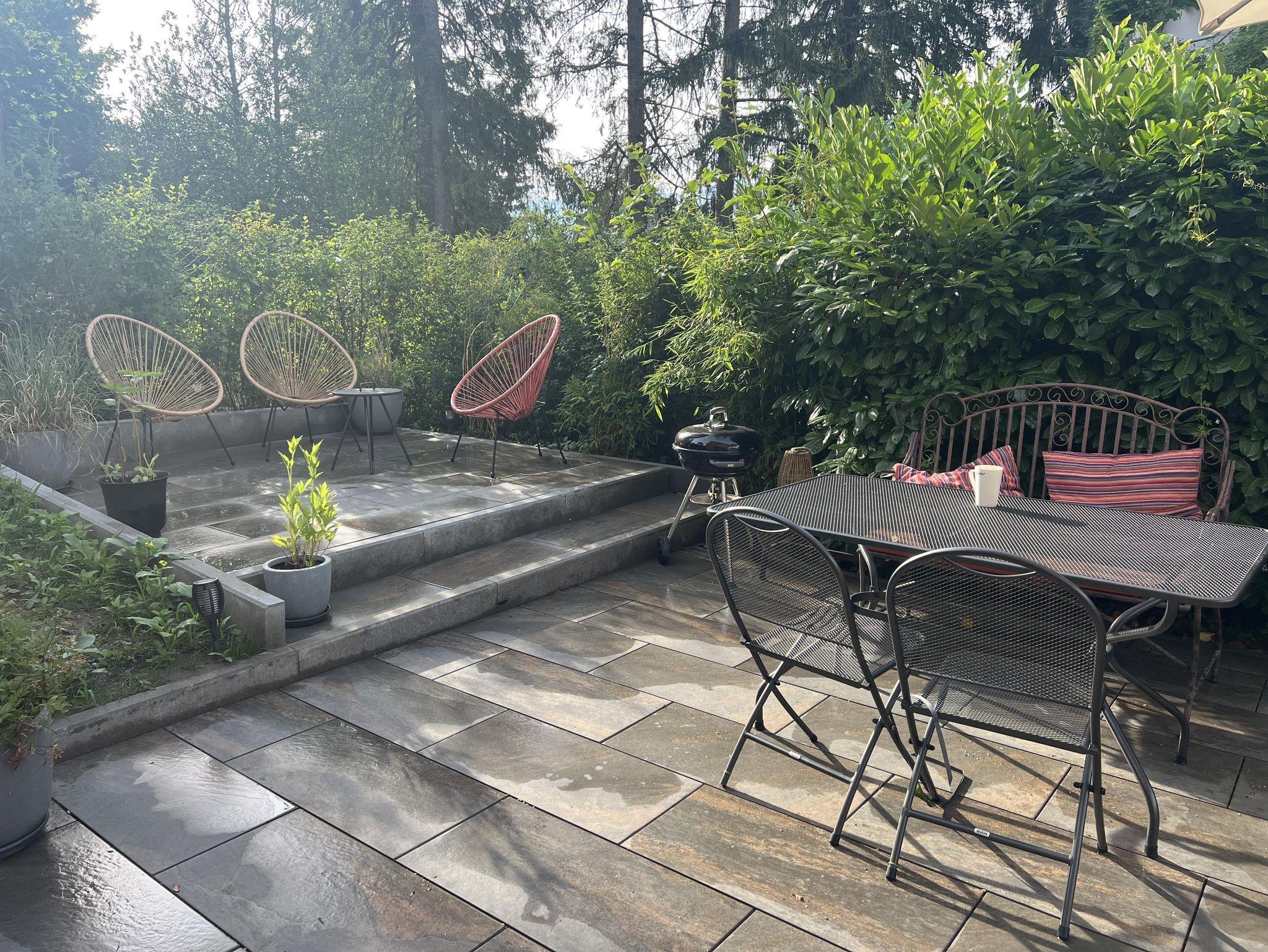 Dem oberen Appartement steht eine 80 m² große Sonnenterrasse zur Verfügung und dem unteren Appartement ein Garten mit Terrasse.