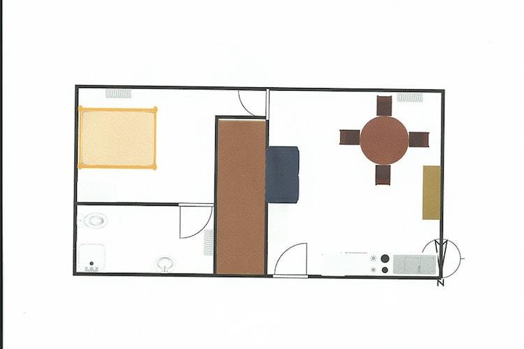 Stueetage: (spisestue(spisebord), tekøkken(kogeplade(Komfur med fire kogeplader, elektrisk), elkedel, kaffemaskine, ovn, opvaskemaskine , køle-fryseskab), Stue/soveværelse(dobbeltsovesofa, Fjernsyn(parabol)), soveværelse(dobbeltseng), badeværelse(bruser, toilet), balkon) parkering