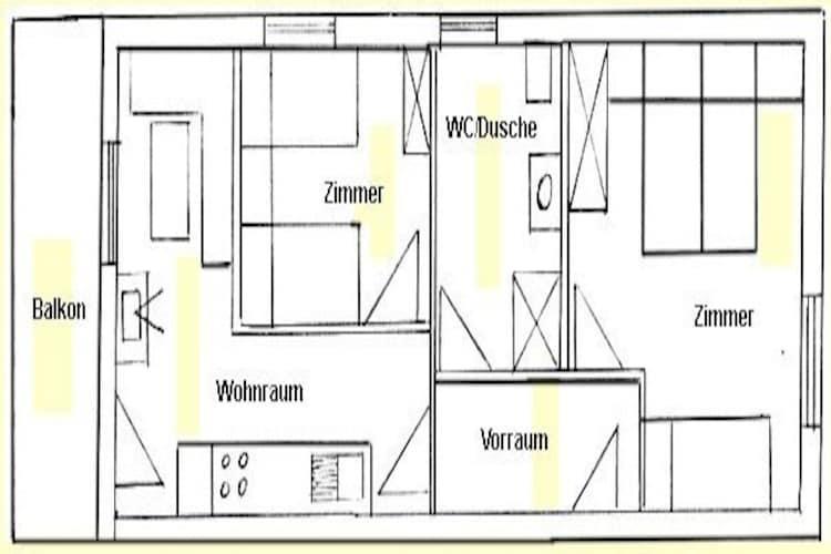 Loft: (spisestue(spisebord), tekøkken(kogeplade(Komfur med fire kogeplader, elektrisk), elkedel, kaffemaskine, ovn, opvaskemaskine , køle-fryseskab), stue / spisestue(Fjernsyn(parabol)), soveværelse(enkeltseng, dobbeltseng), soveværelse(enkeltseng, enkeltseng), badeværelse(bruser, toilet), balkon) parkering
