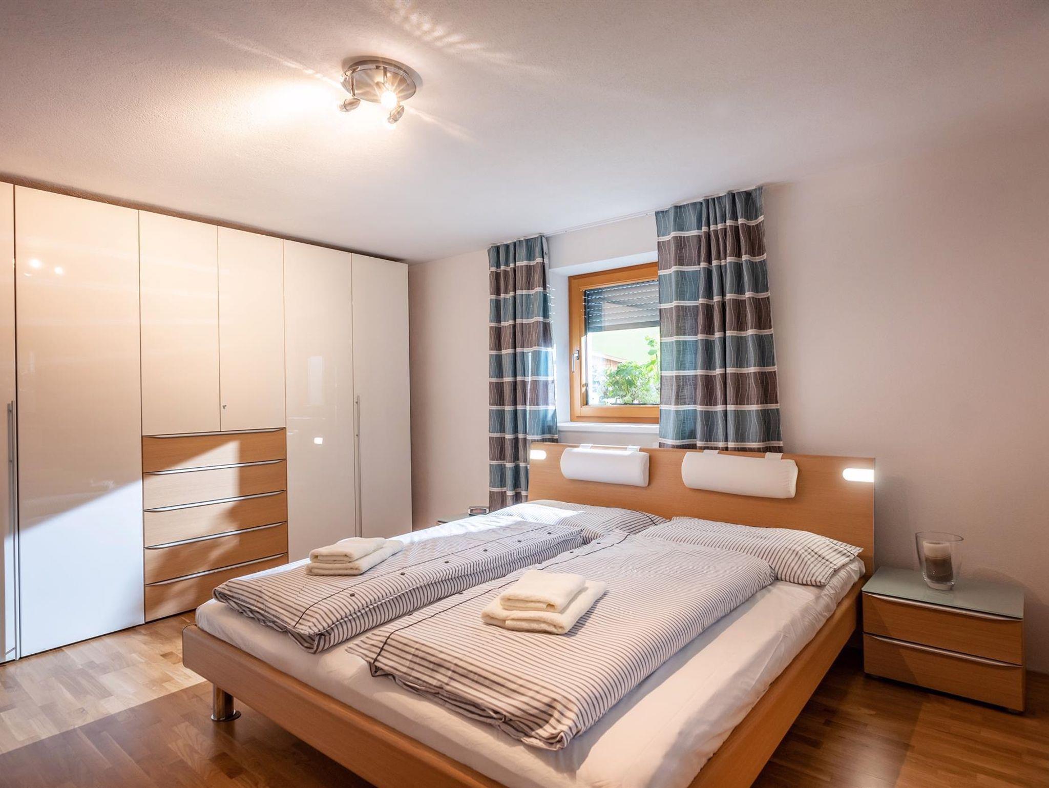 Unsere ca. 55 m² große Ferienwohnung mit Garten besteht aus einer komplett ausgestatteten Küche und Wohnzimmer, ein Schlafzimmer mit einem Doppelbett sowie Bad mit Dusch-Badewanne und WC.