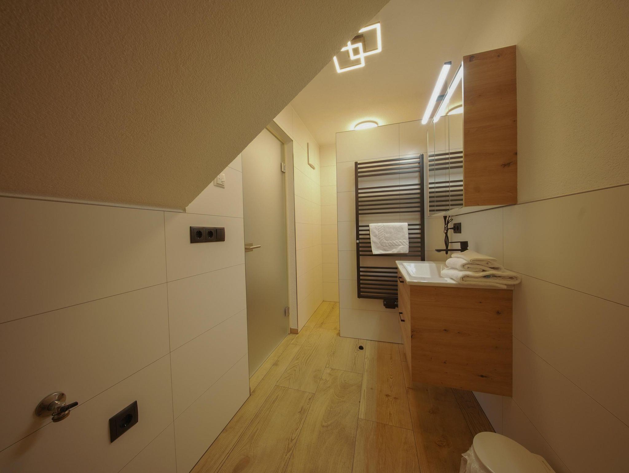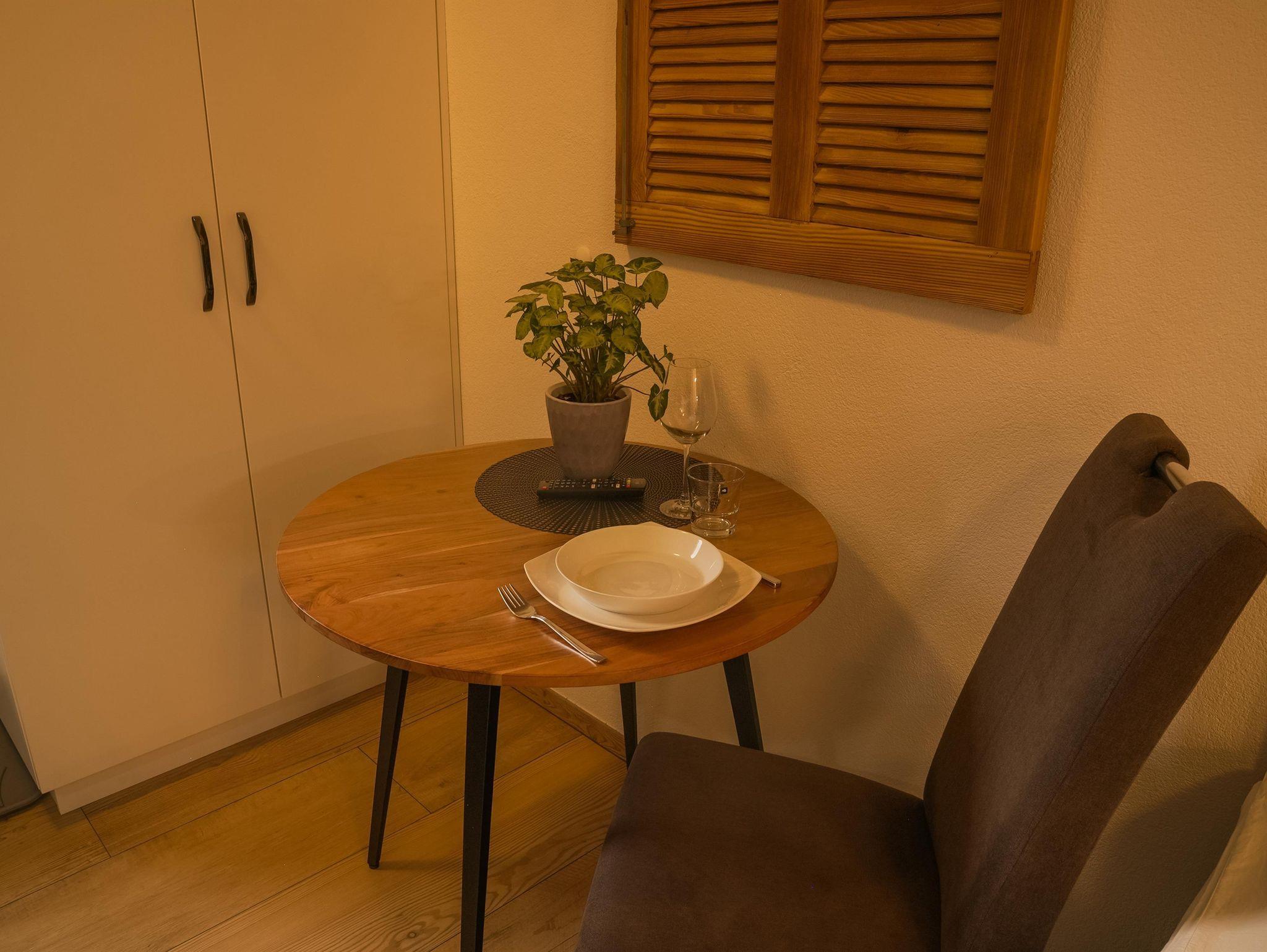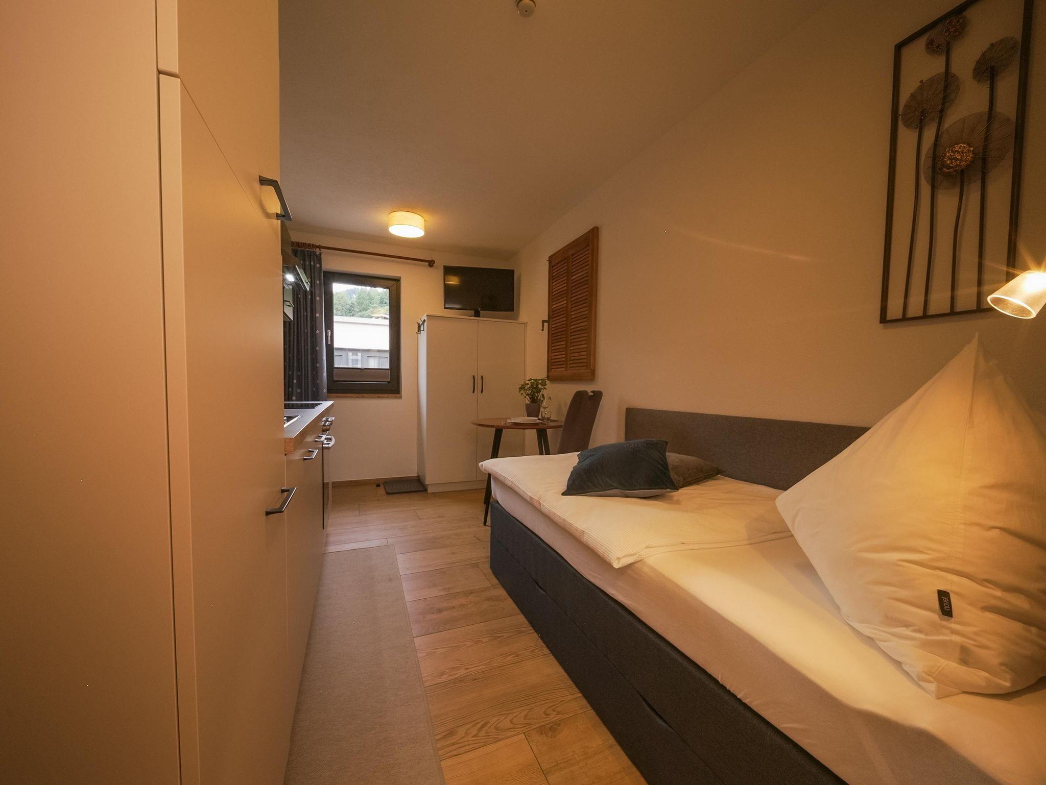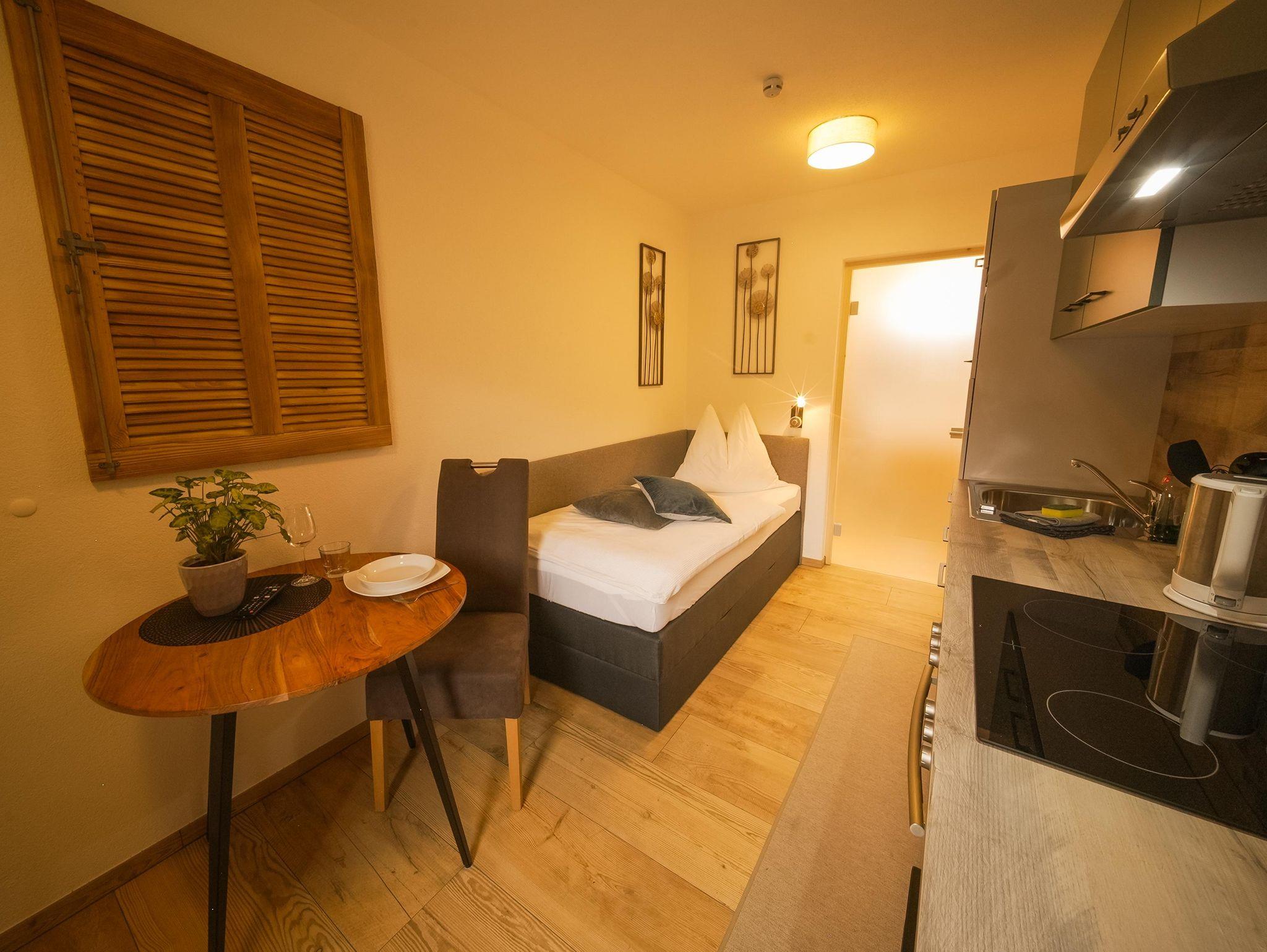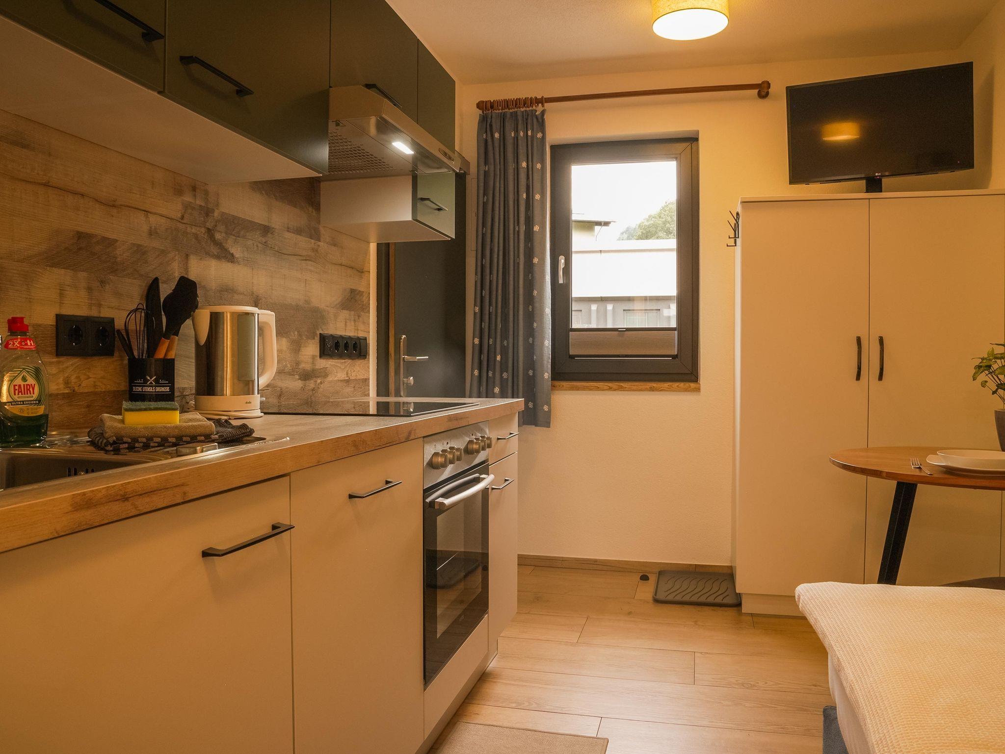 Klein, aber fein ist unser Studio Leiten mit nur ca. 18 m² im 1. Obergeschoß. Diese kleine Wohnung ist für 1 Person gedacht und verfügt über ein Boxspringbett, einen Küchenblock mit E-Herd und Backrohr, Dunstabzug, Wasserkocher, Kaffeemaschine, Toaster, Esstisch und Sat-TV. Das neue Bad befindet sich gleich anschließend an den Wohnbereich.