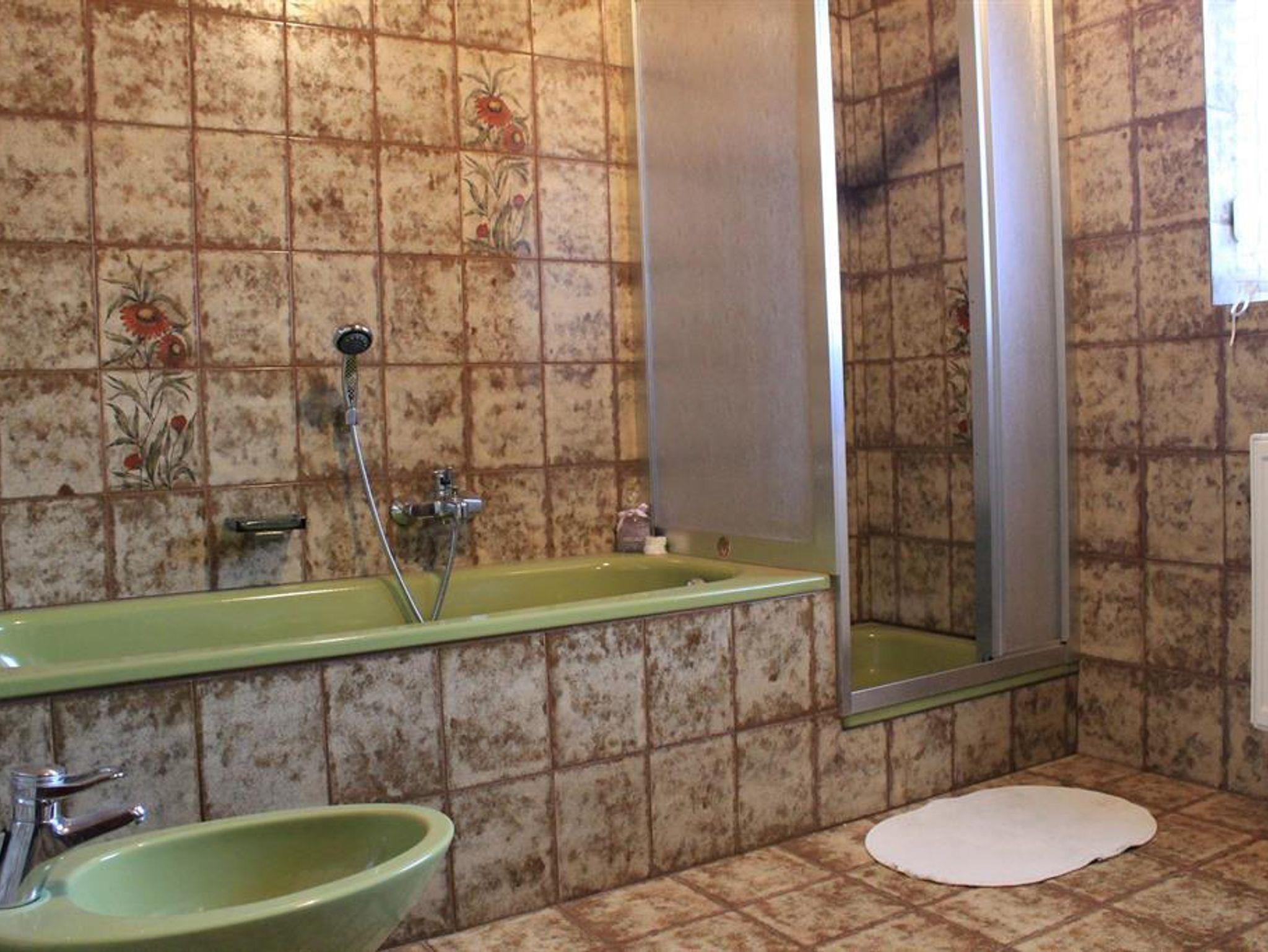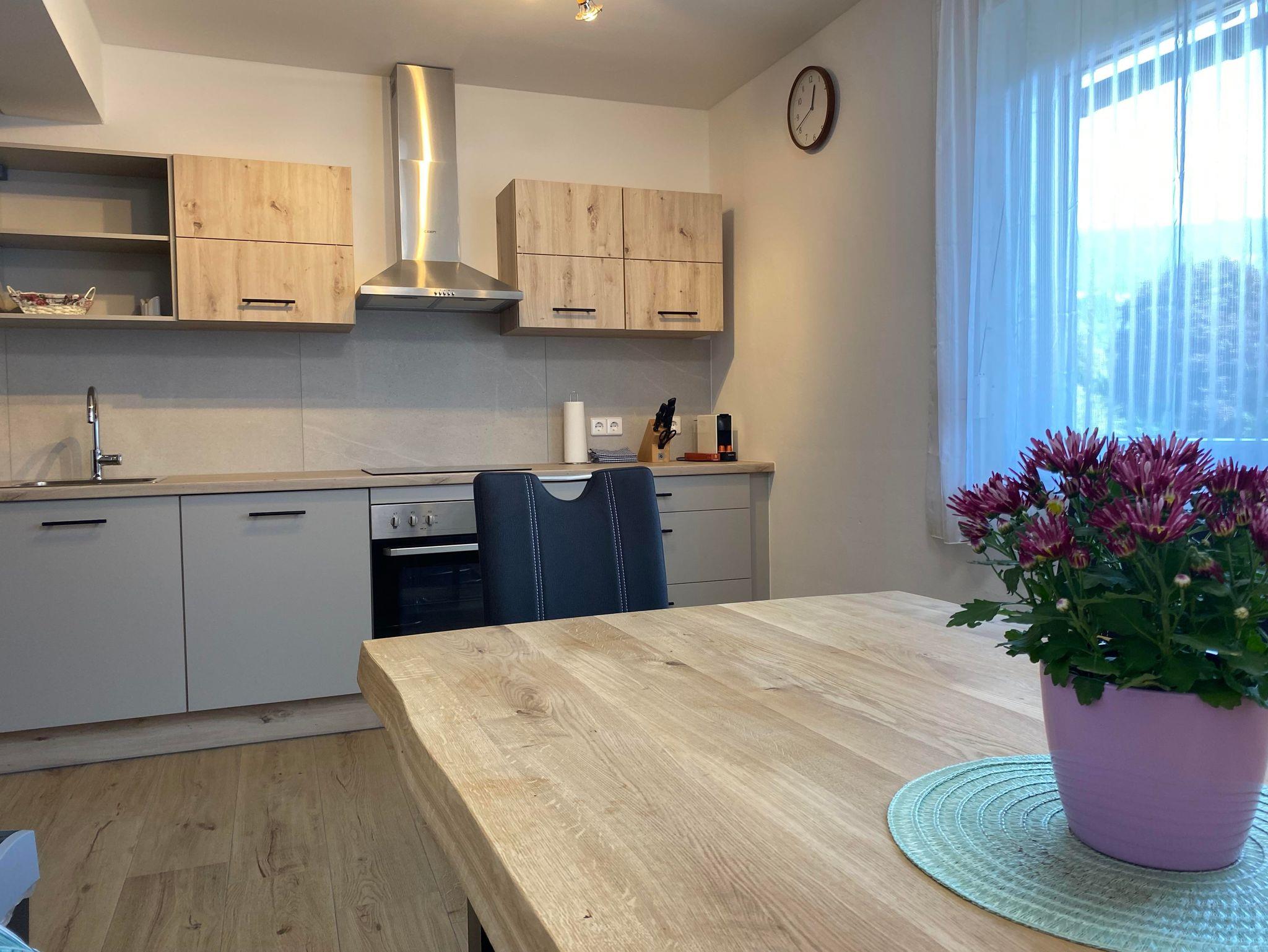 Das Appartement liegt in einem eigenständigen Ferienhaus mit separaten Eingang. Die Wohnung besteht aus einer großen voll ausgestatteten Küche mit Geschirrspüler, Backofen, Mikrowelle und genügend Geschirr. Im großen Wohnzimmer befindet sich eine Auszieh-Couch sowie ein Doppelbett. Weiters gibt es ein Schlafzimmer für bis zu 3 Erwachsene mit einem Doppel- und einem Einzelbett. Ein Gang, ein separates WC sowie ein Badezimmer mit Dusche und Wanne stehen auch zur Verfügung. Das Angebot wird abgerundet durch den Balkon mit Aussicht ins Grüne und Sonnenschein ab Mittag bis zum Abend.