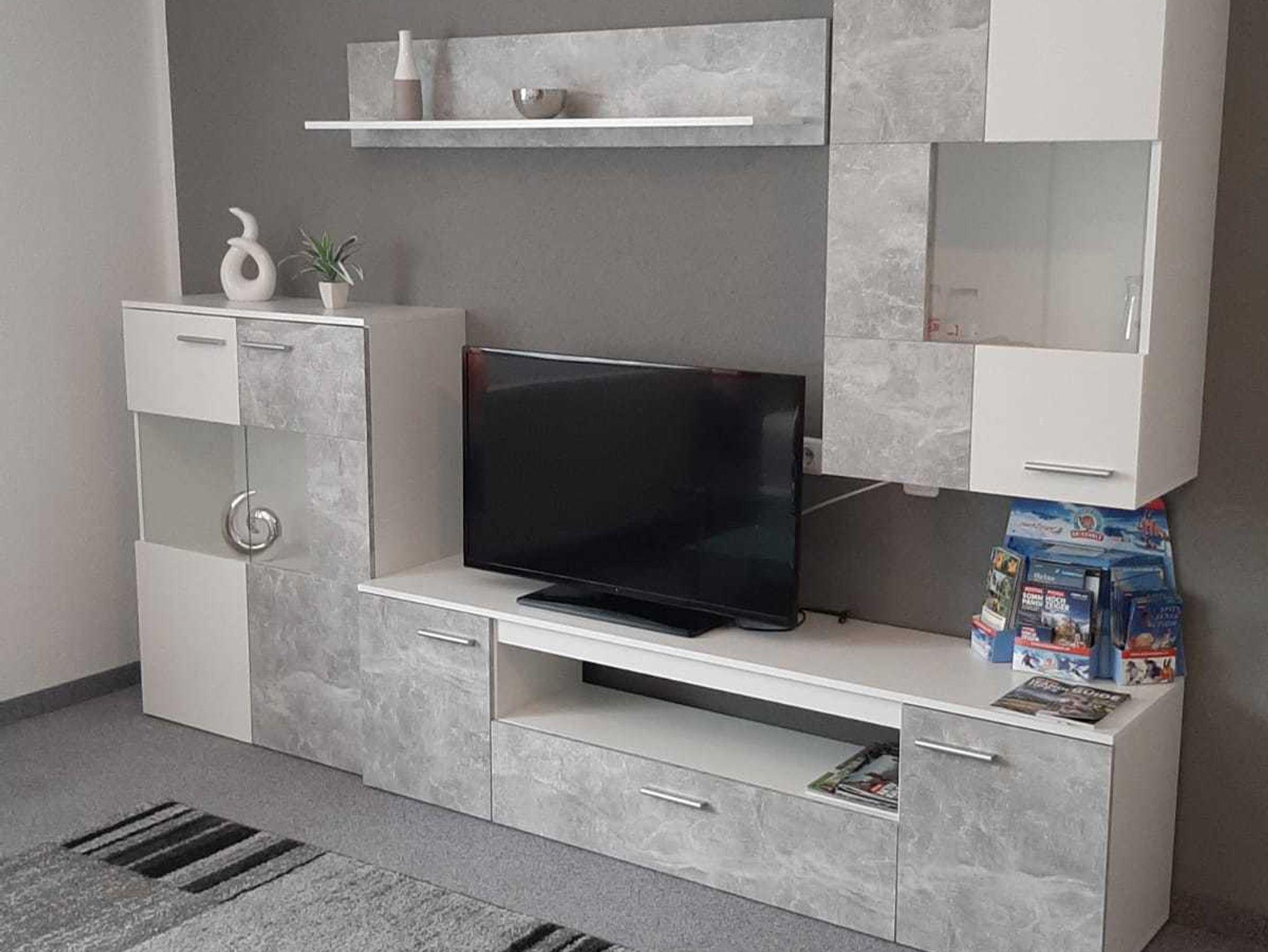 Sofa, Sat TV , Wohnwand mit Flachbildschirm.