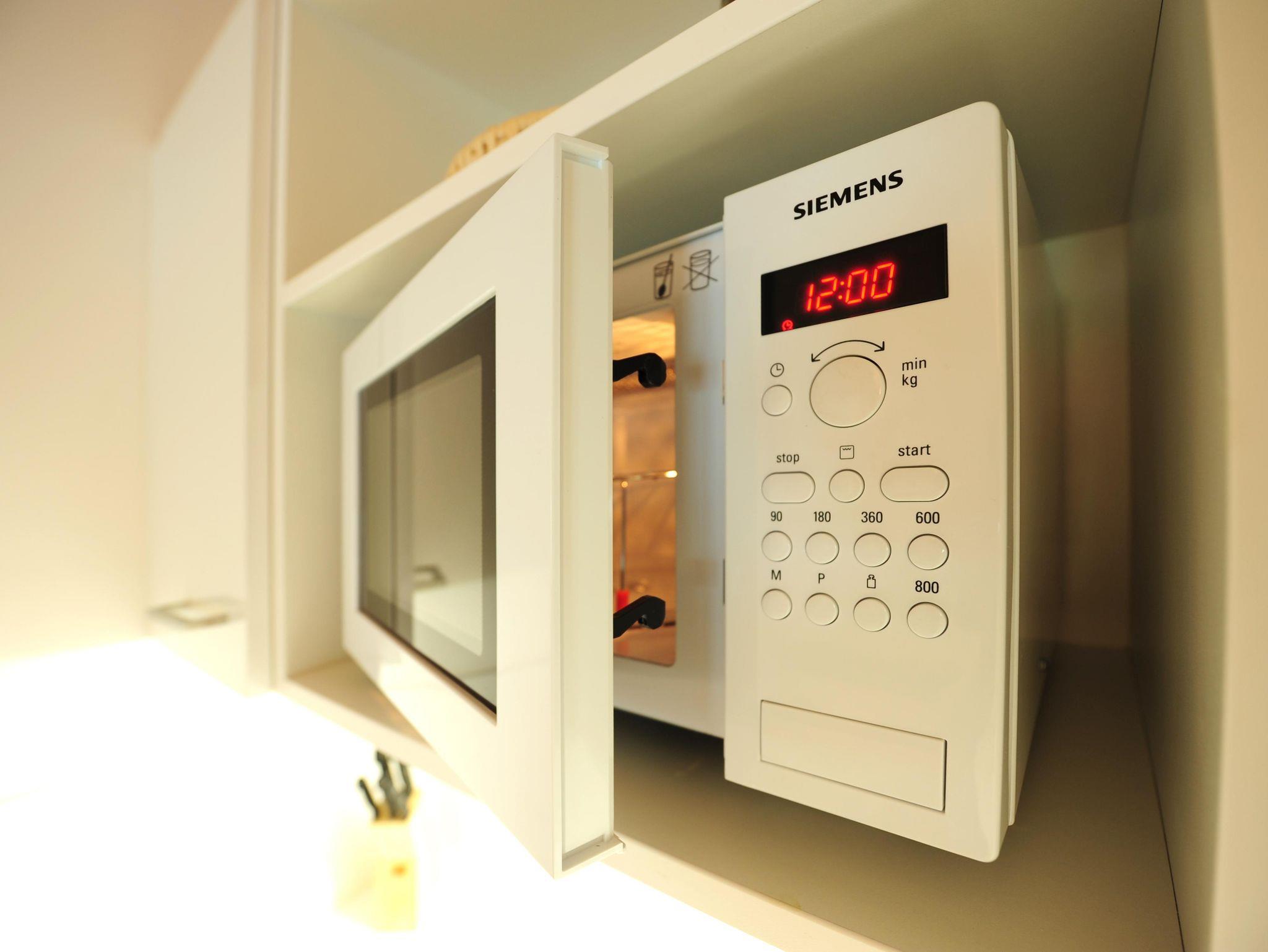• Moderne Küchenausstattung mit Miele Spülmaschine, großräumigem Kühlschrank, Ceran Kochfeld, 4 Kochtöpfen, Messerblock, Kaffeemaschine, Mikrowelle, Schüsseln, Gläsern und Geschirr für 4 Personen