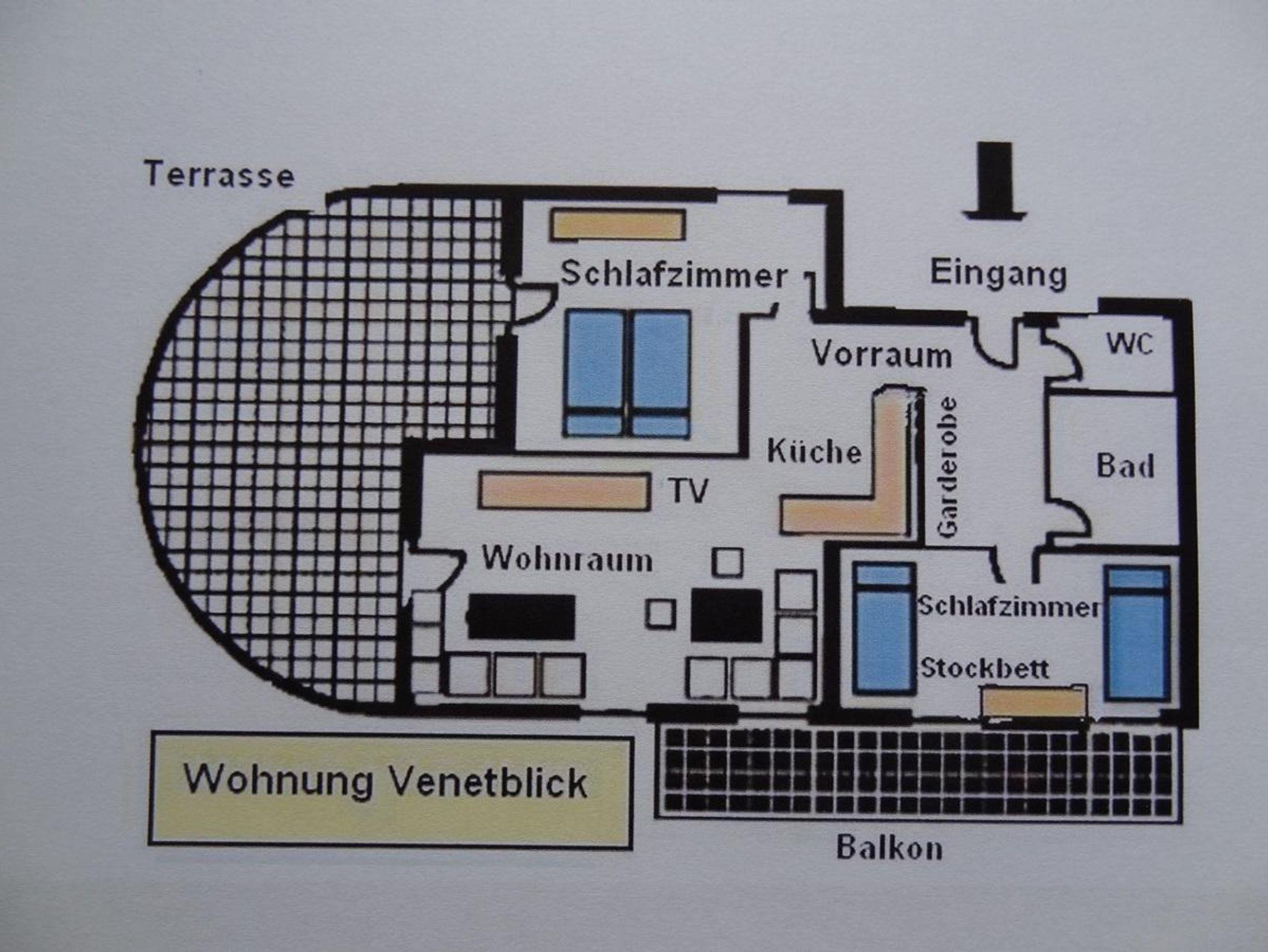 Die 3 - Zimmer Ferienwohnung Venetblick mit 62 m² besteht aus:. 2 getrennten Schlafzimmern ( 1x Doppel, 1x 3 Bettzimmer). Wohnzimmer mit Doppelausziehcouch, bestens ausgestatteter Küche mit Mikrowelle, Toaster, Geschirrspüler, Wasserkocher, Safe. Bettwäsche, Hand-, Bade- und Geschirrtücher sind vorhanden. SAT TV, Stereoanlage mit CD-Player,. Internetanschluss. Bad + WC sind separat, Fön, Kosmetikspiegel, Seife, Duschaufbau mit Glasschiebetür. Balkon und Terrasse mit herrlichem Bergblick über das Tal