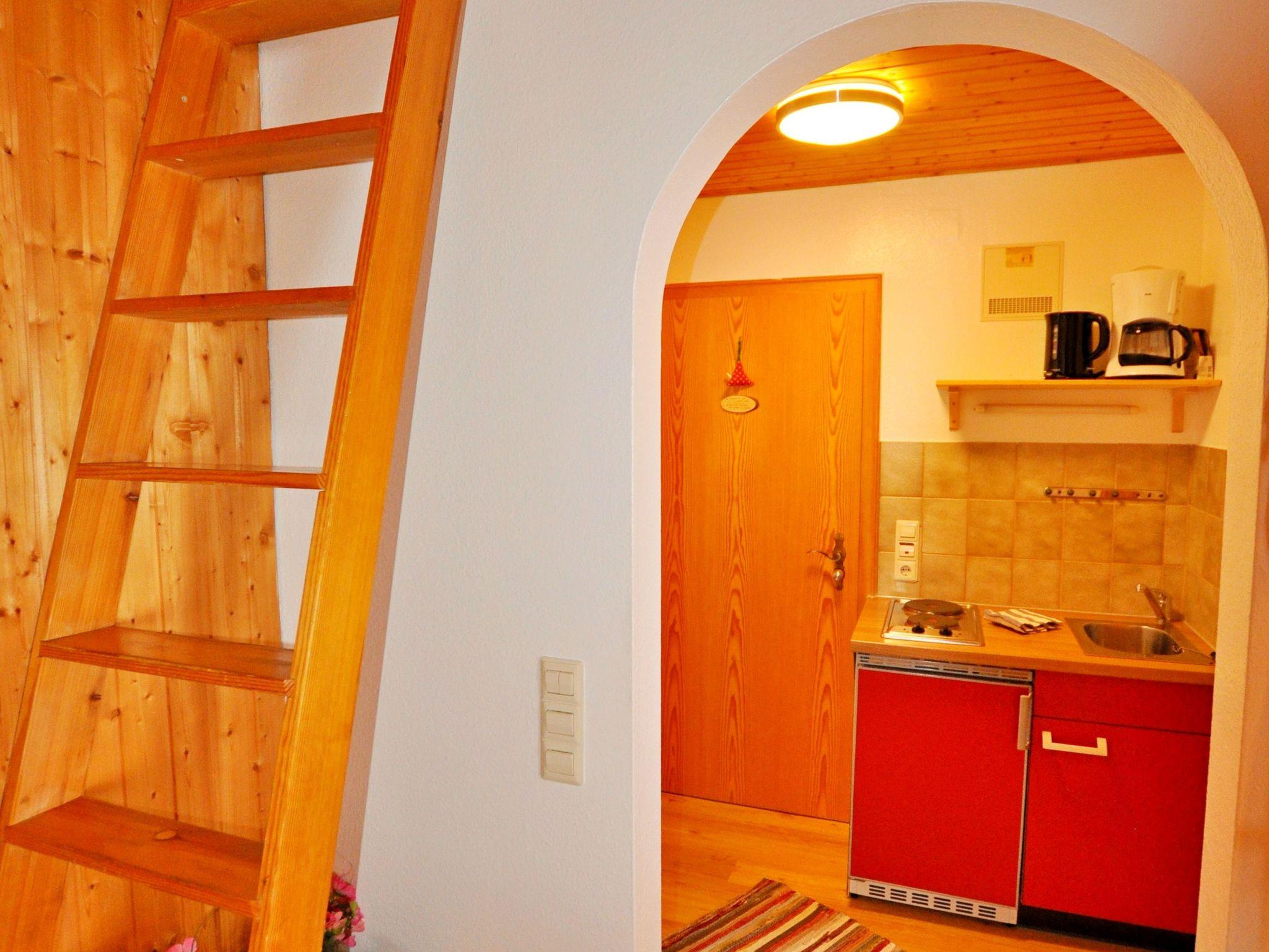gemütlich eingerichtetes Appartement (34 m²) mit kombiniertem Wohn-Schlafraum (Doppelbett + Einzelbett) und Matratzenlager im Dachgiebel (gerade für Kinder ein Highlight). Kleine Kochgelegenheit (mit Kühlschrank), Essecke, Bad mit Dusche, WC, großem Spiegel und Fön, Sat-TV, Direktwahl-Telefon, Radio, Wandsafe und großem Balkon.