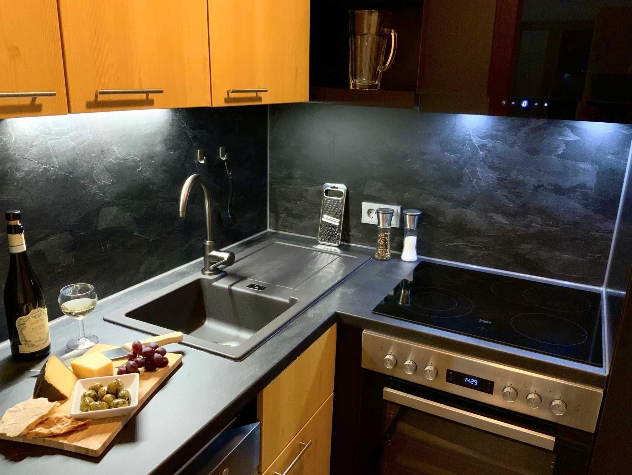 • Küche mit Cerankochfeld, Backofen, Spülmaschine und Dunstabzugshaube