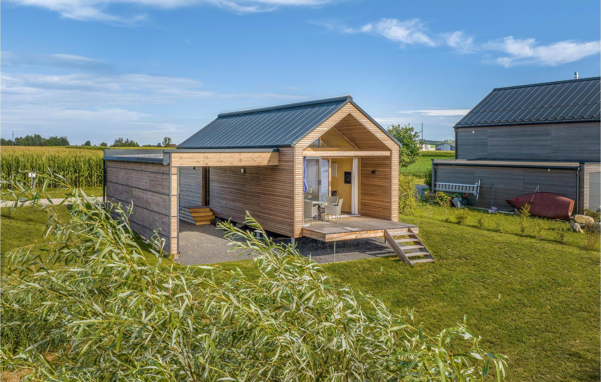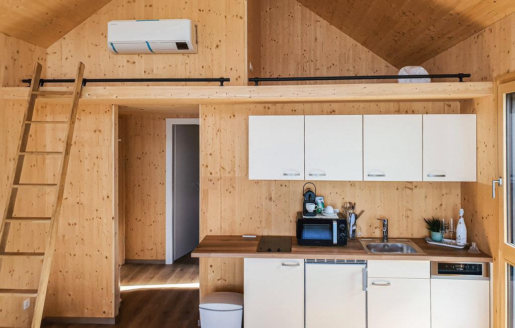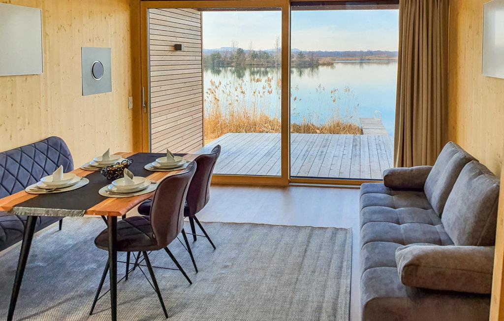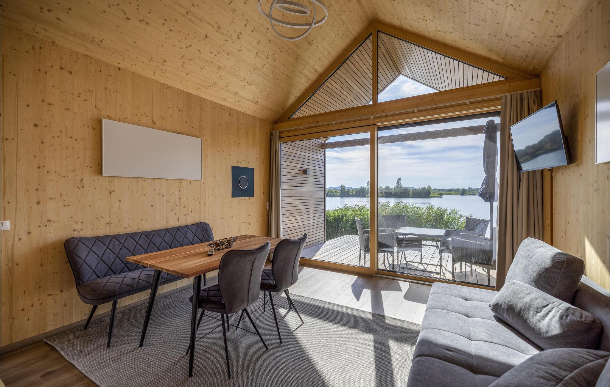 Dette skønne feriehus har plads til fem gæster og er perfekt til en hyggelig familieferie. Der er en stige op til hemsen, hvor I finder en af sengepladserne. Fra opholdsrummet er der direkte udsigt til søen gennem de store panoramavinduer, og på den overdækkede terrasse kan I sætte jer med samme skønne vue og nyde en kop kaffe eller afslutte dagen med et godt glas vin fra regionen. Der er også en grill klar til jeres sommermiddage under åben himmel.